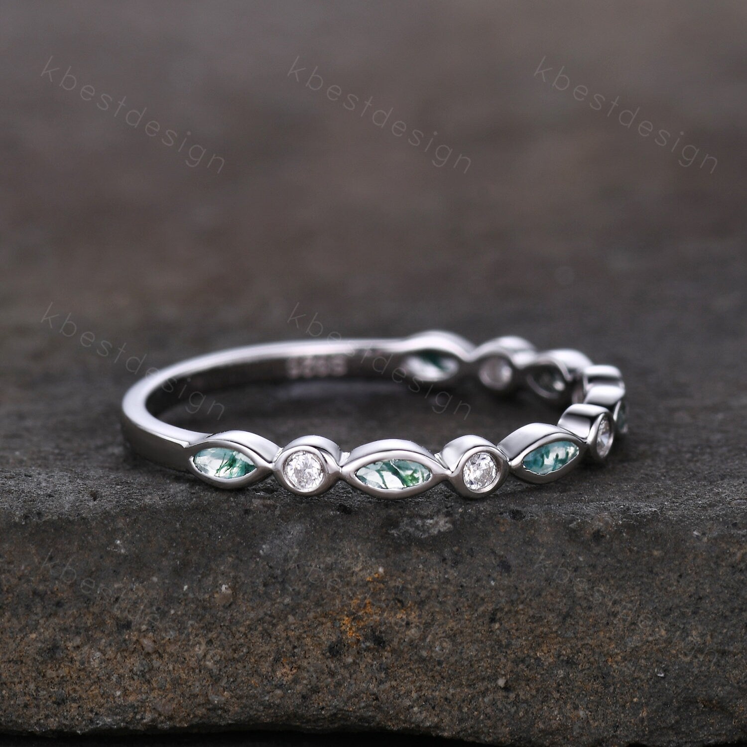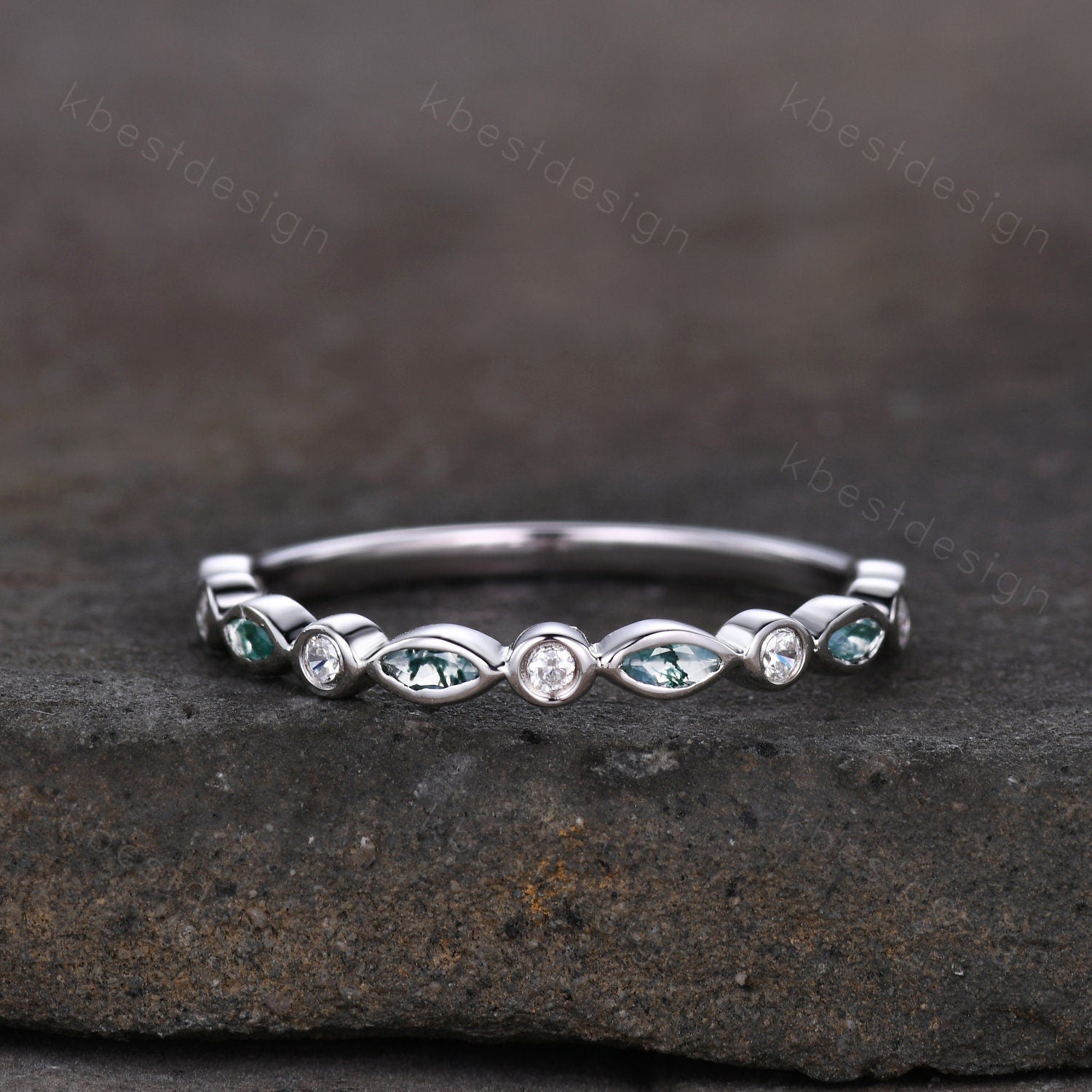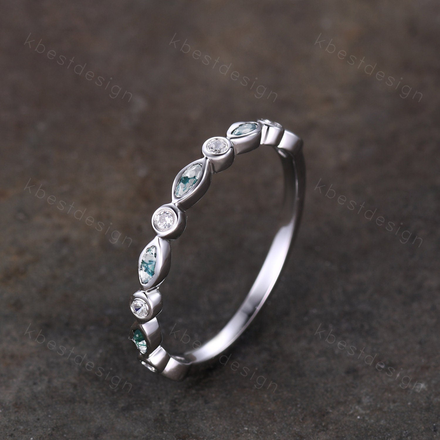 Half Eternity Moss Agate Wedding Band White Gold Ring for Women Unique Marquise cut Moss Agate Moissanite Wedding Ring Stacking Band Gift