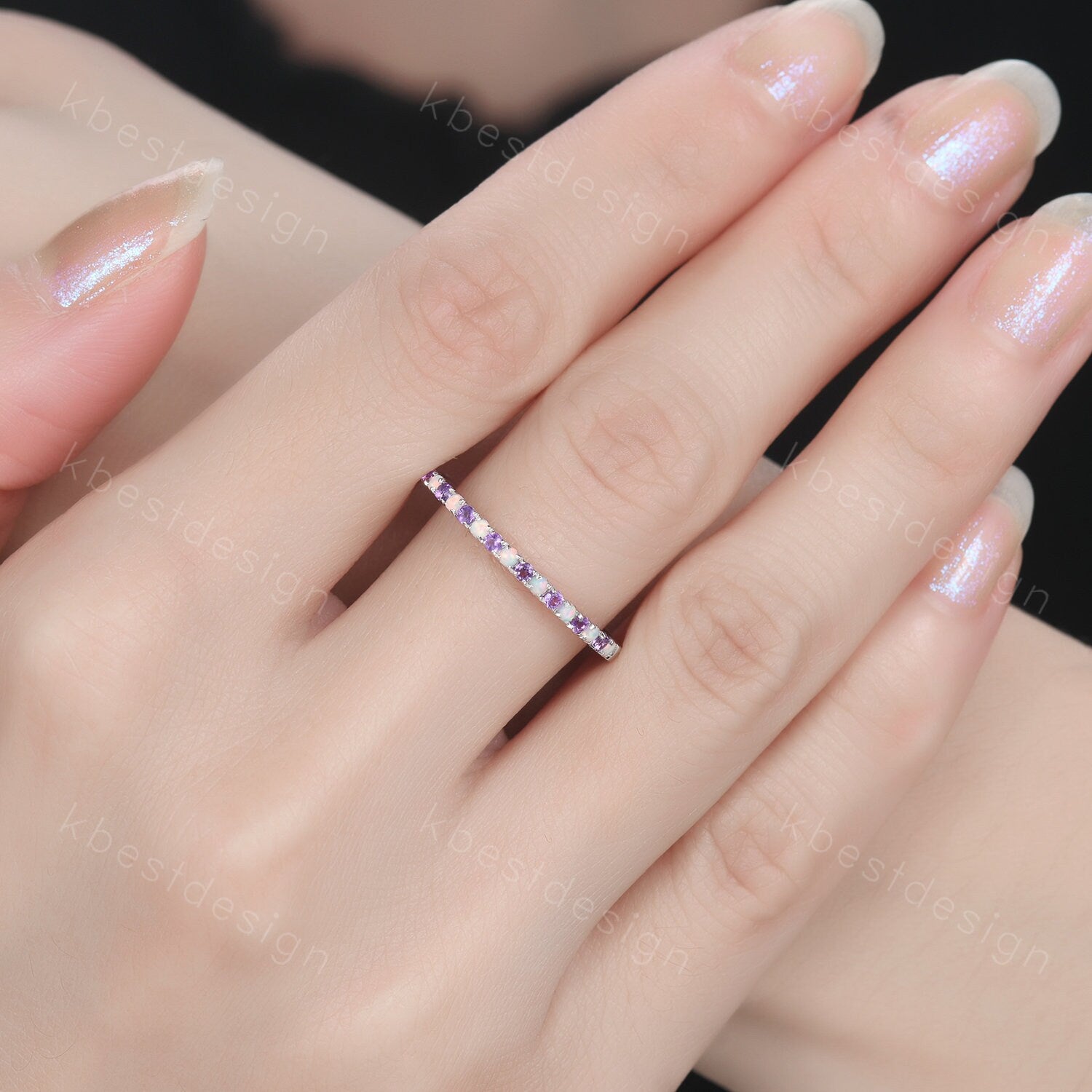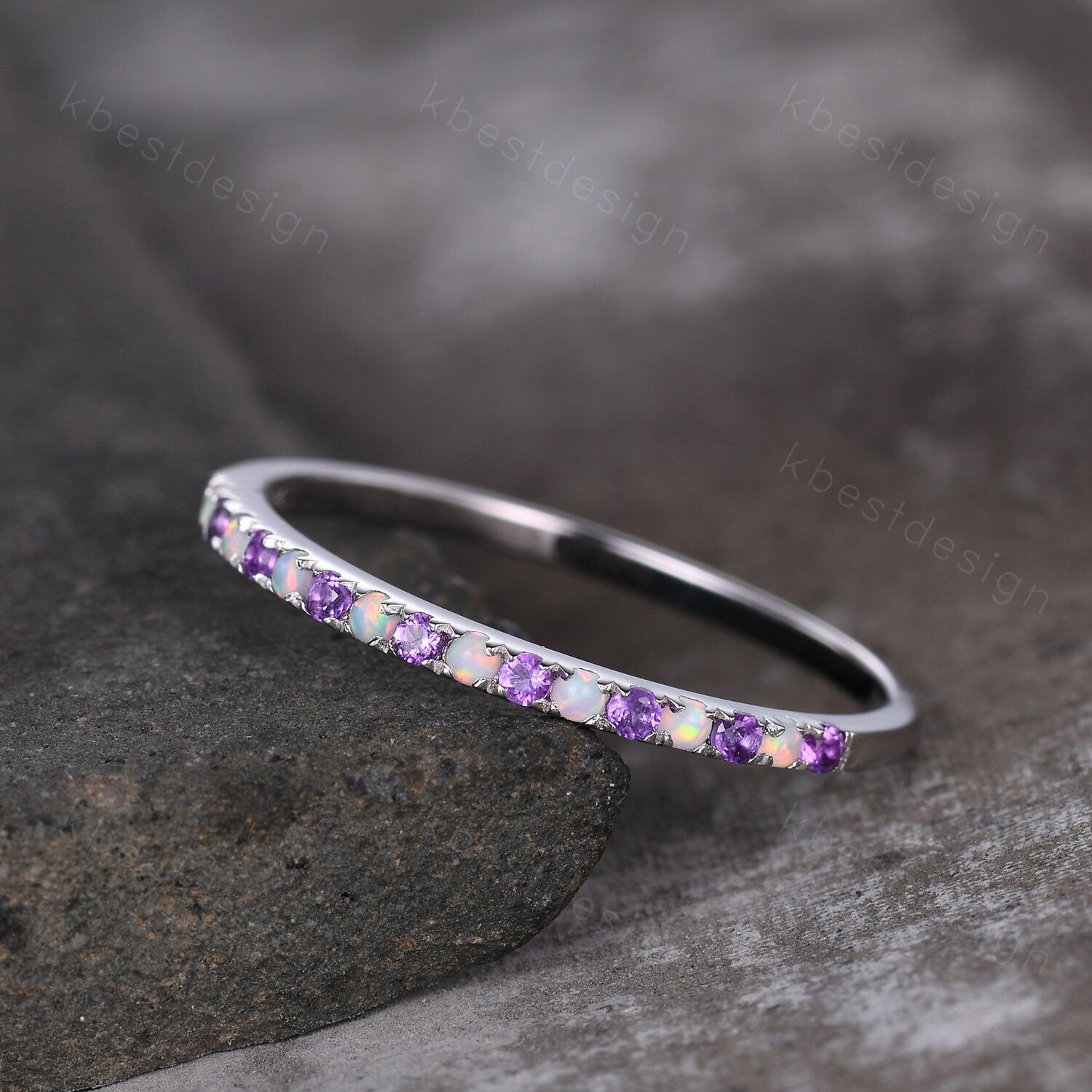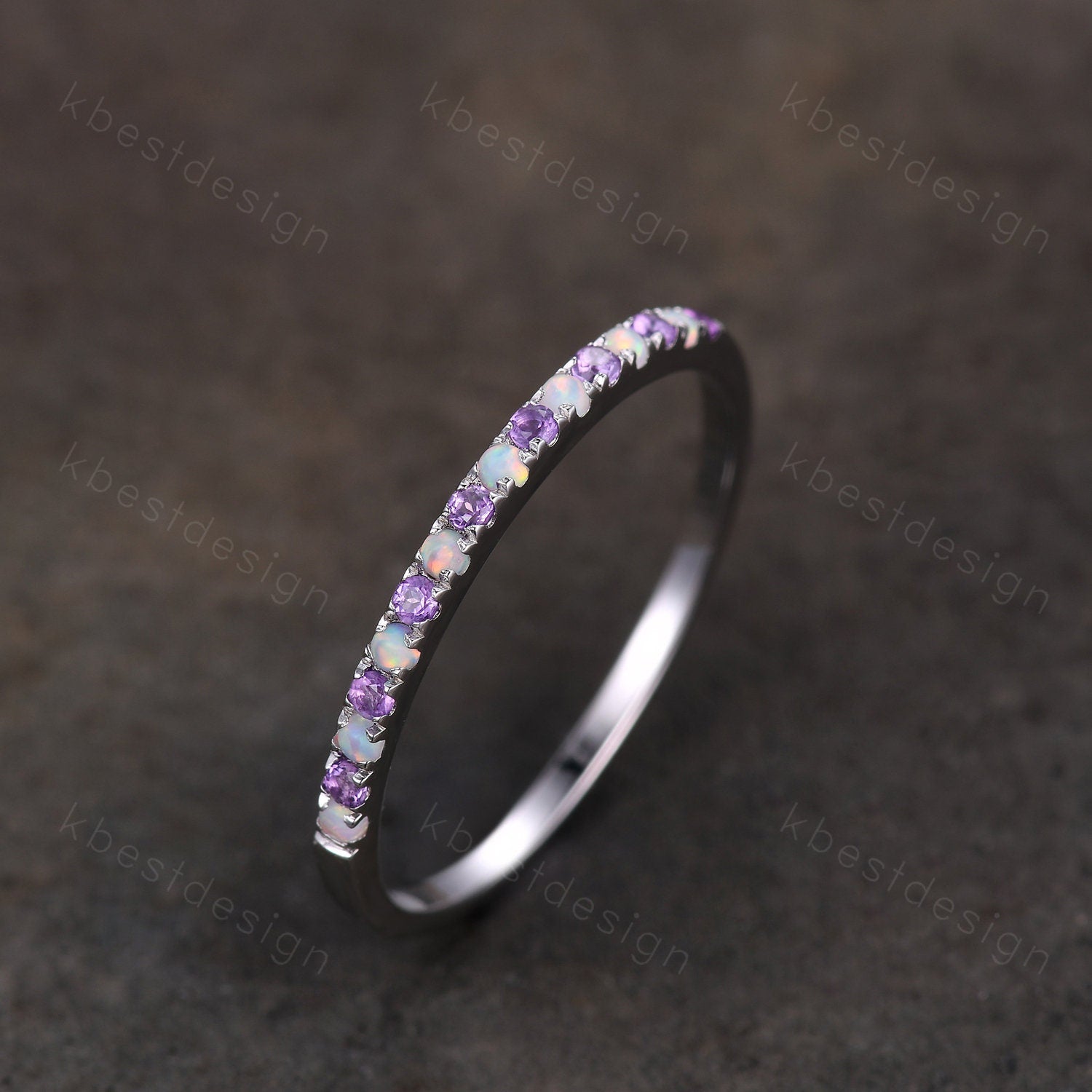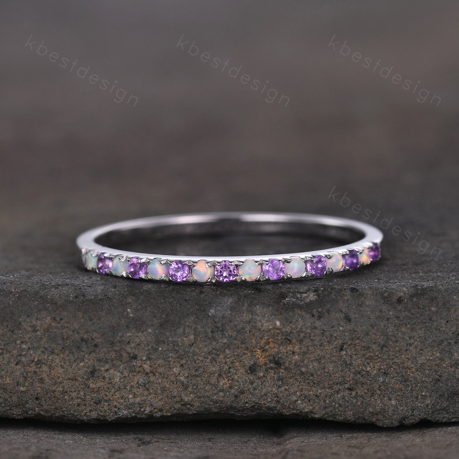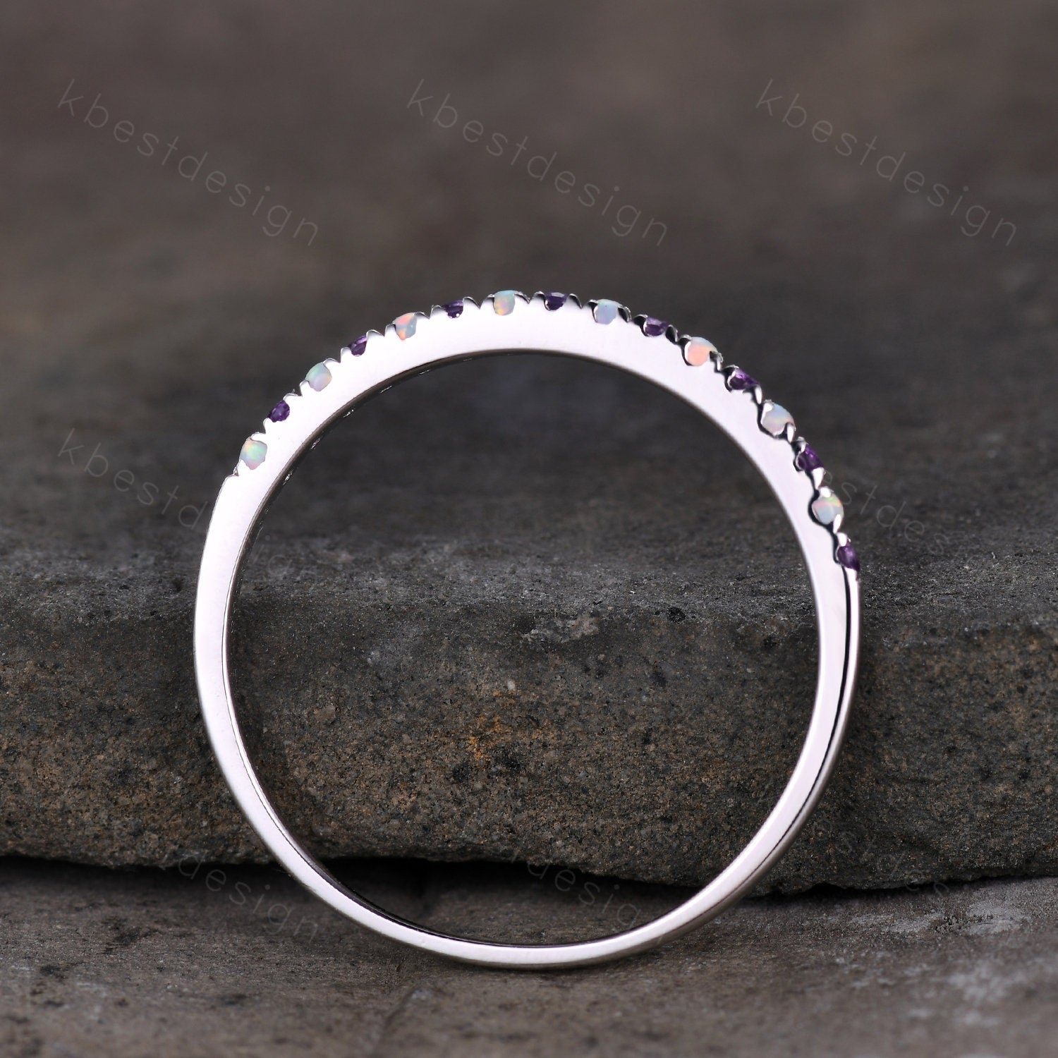 Half Eternity Opal Amethyst Wedding Band Dainty Silver Opal Wedding Ring Amethyst Ring Minimalist Stacking Matching Band Anniversary Gift
