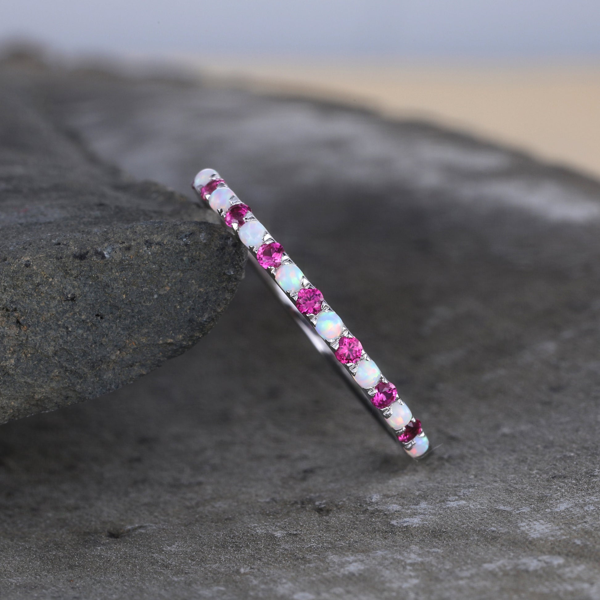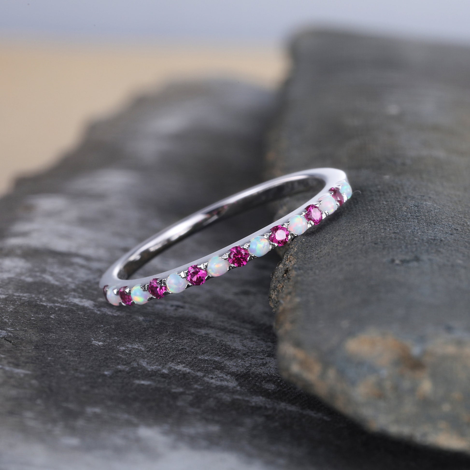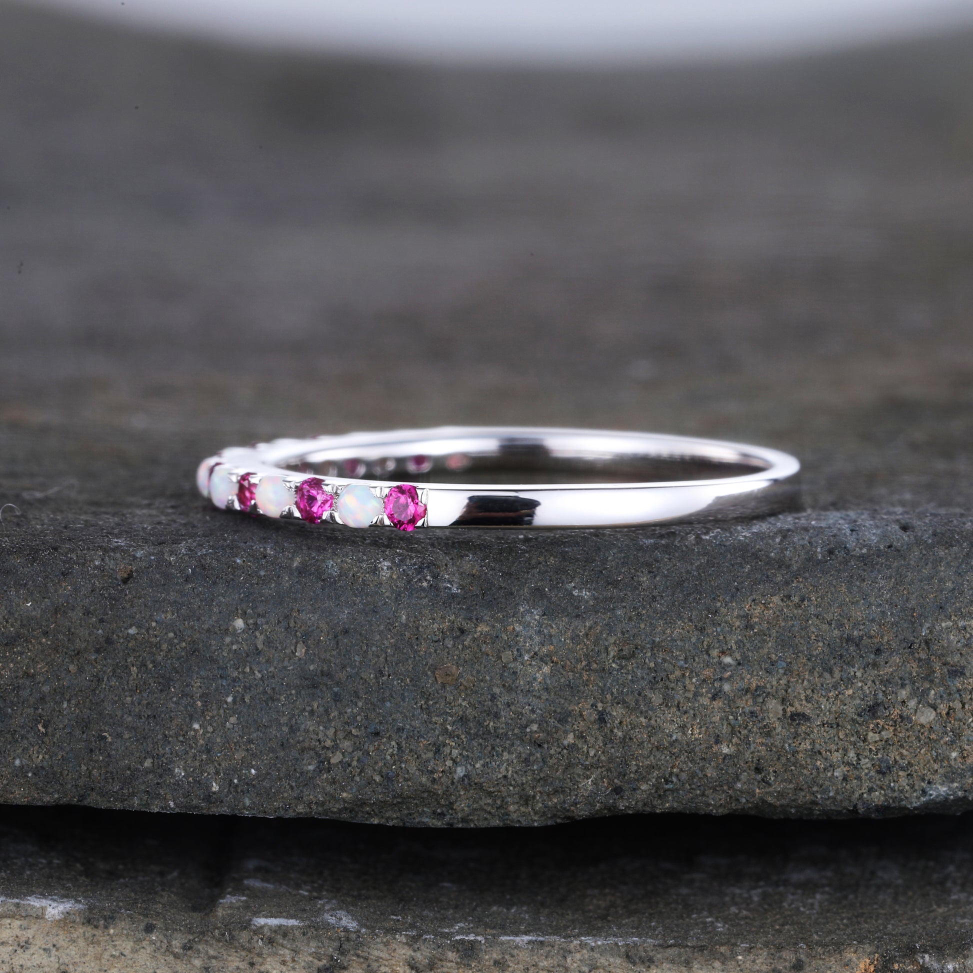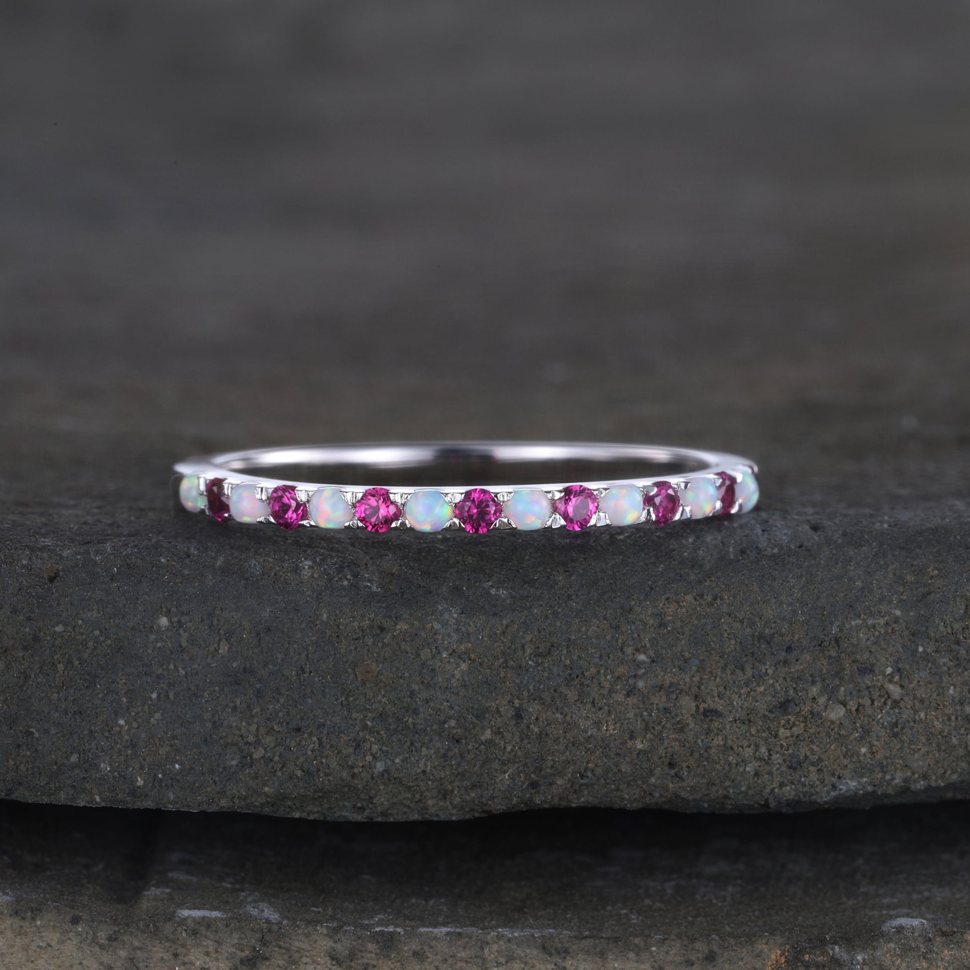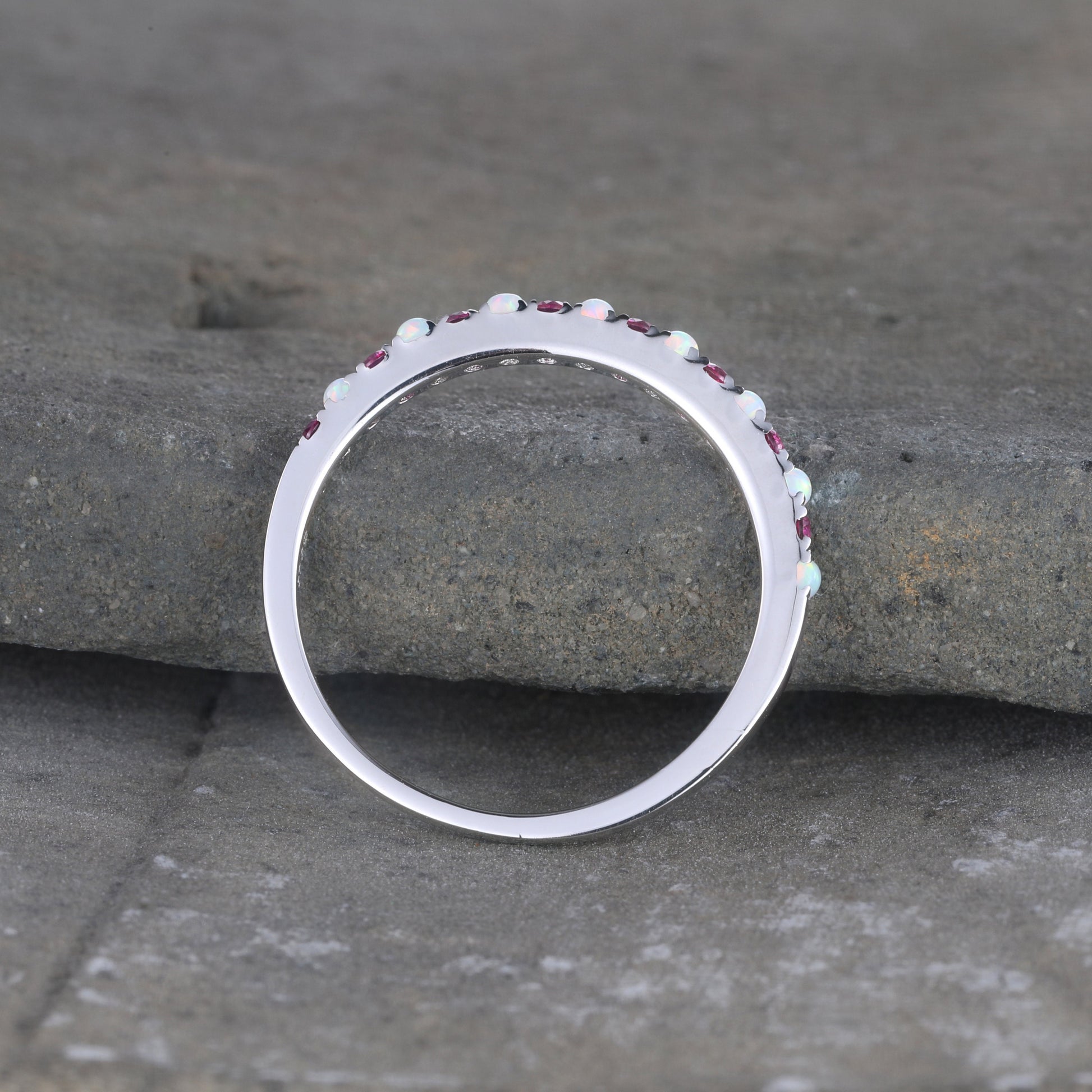 Half Eternity Opal Ruby Wedding Ring, Dainty Opal Wedding Band, Sterling Silver Ring, October Birthstone Ring, Anniversary Gift for Her