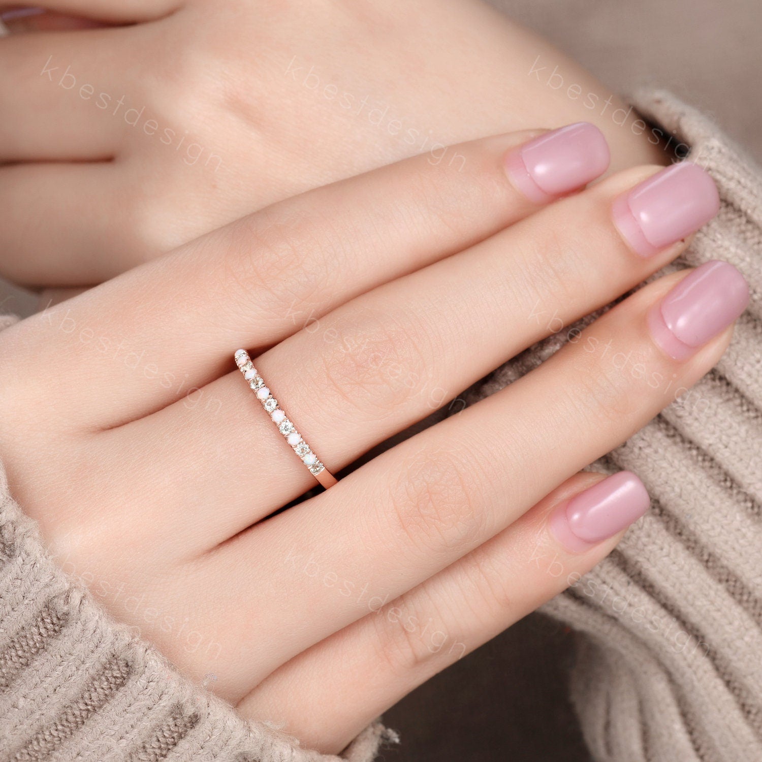 Half Eternity Peridot Opal Wedding Band, Rose Gold Wedding Ring, Opal Wedding Band, Dainty Stacking Matching Band, Anniversary Ring Gift