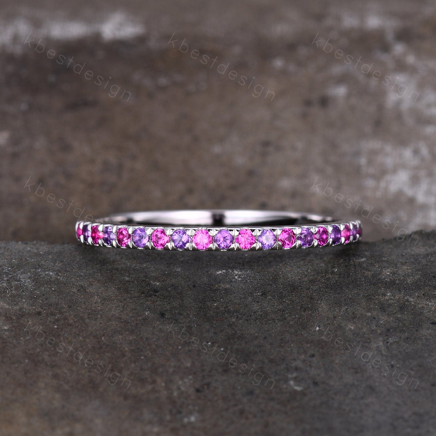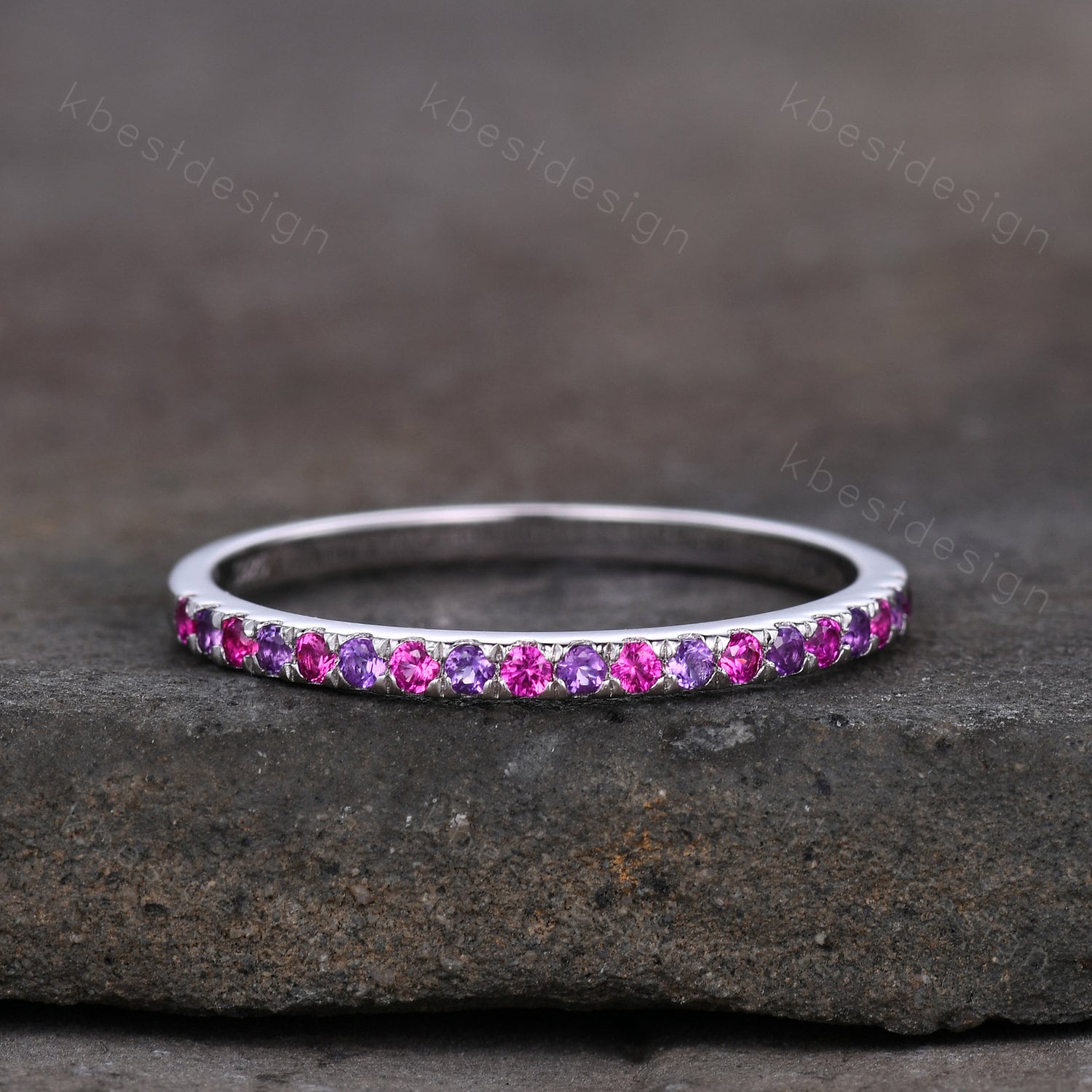 Half Eternity Wedding Band 1.5mm Ruby and Amethyst Wedding Band White Gold Ring July Birthstone Ring Pave Band Minimalist Stacking Band