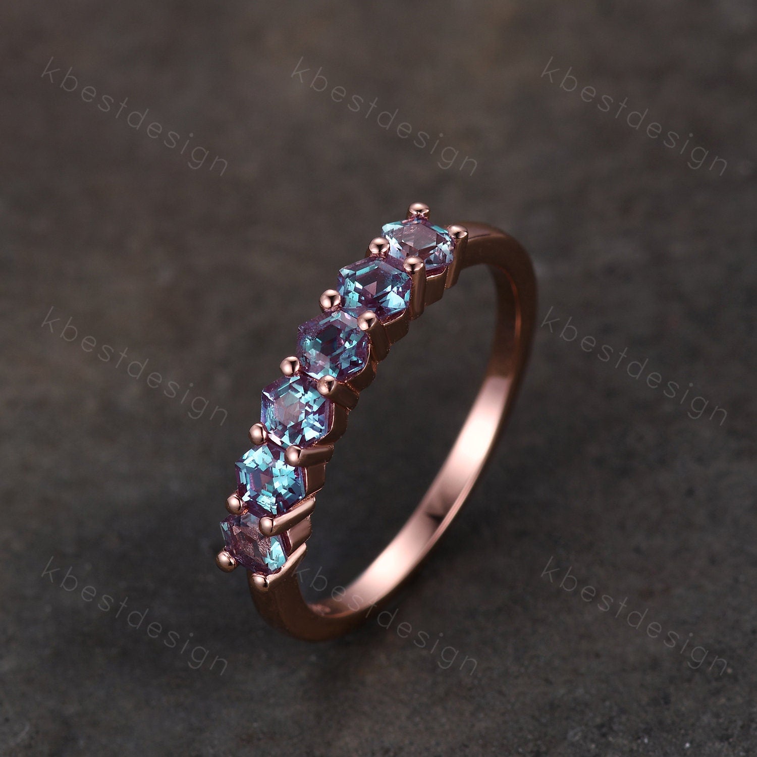 Hexagon cut Alexandrite wedding ring Unique rose gold wedding band 6-stone ring Minimalist Bridal matching stackable band June Birthstone