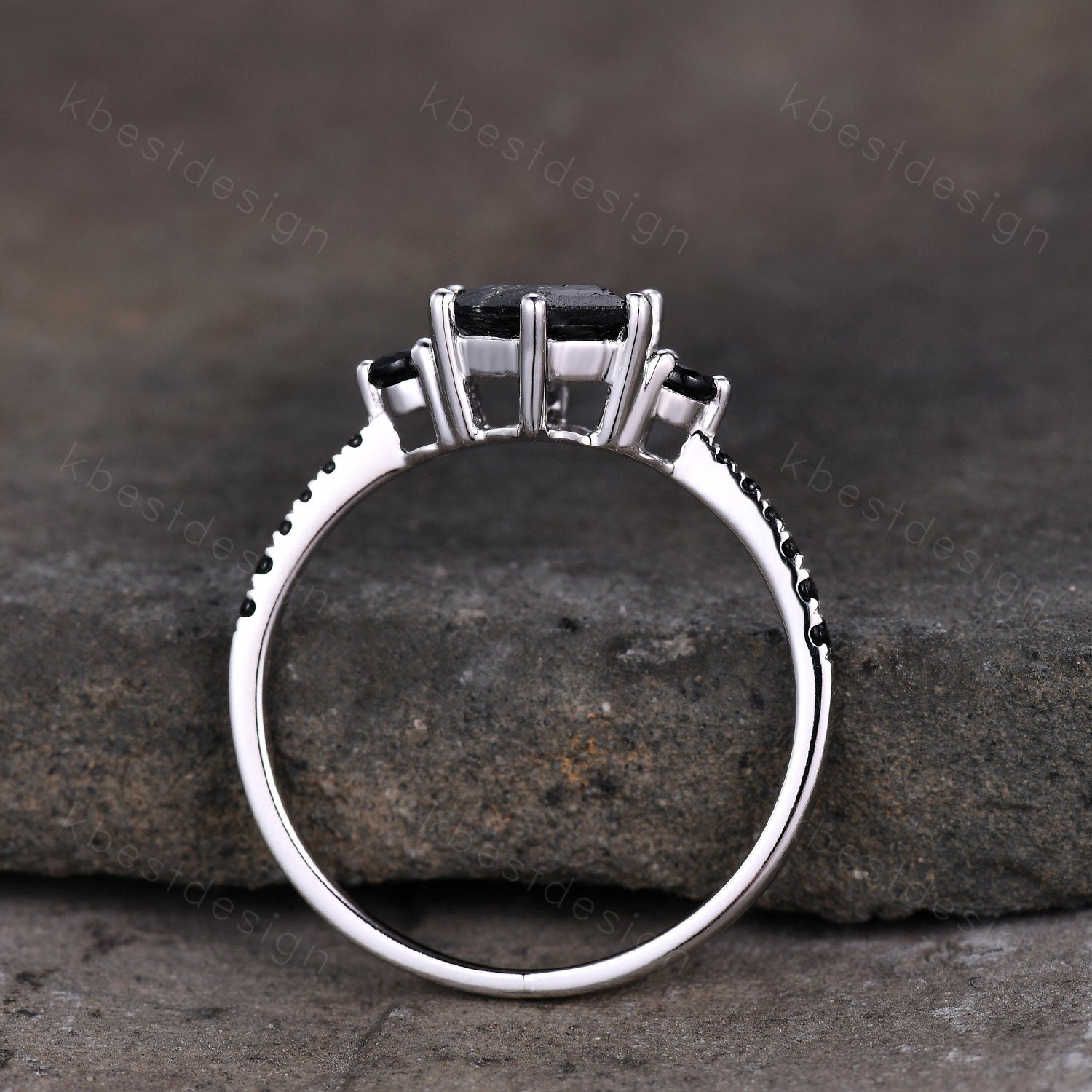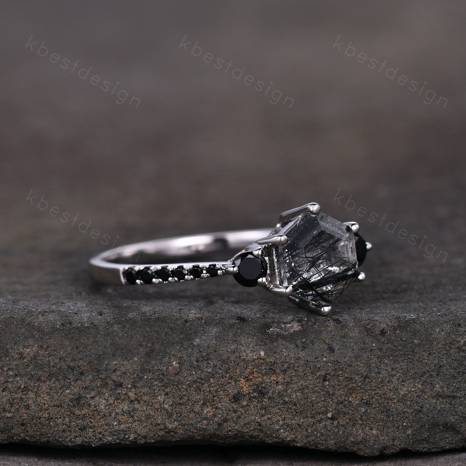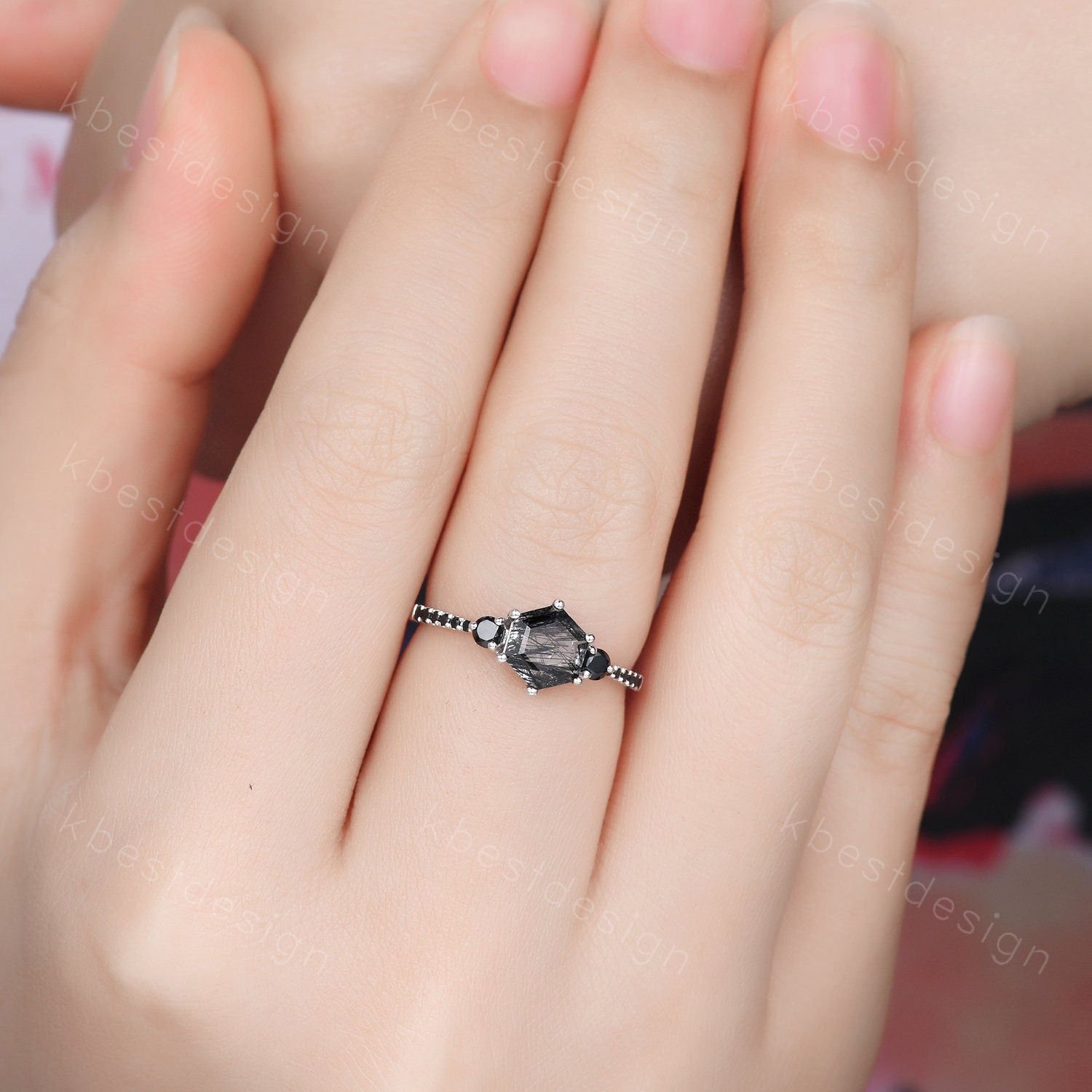 Hexagon cut black rutilated quartz engagement ring unique black spinel ring women black gemstone ring sterling silver three stone ring.