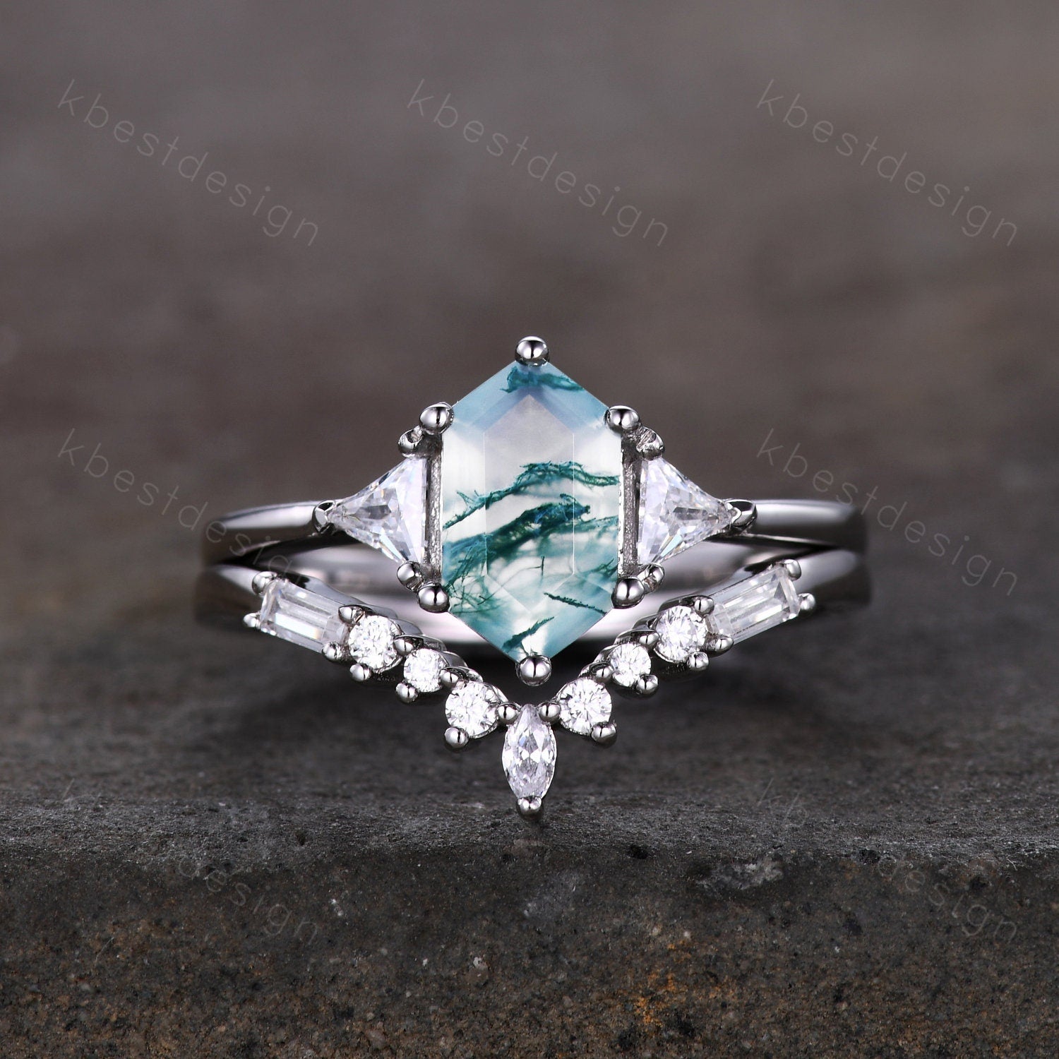 Hexagon cut green moss agate ring women sterling silver moissanite ring unique three stone engagement ring curved stacking bridal ring set