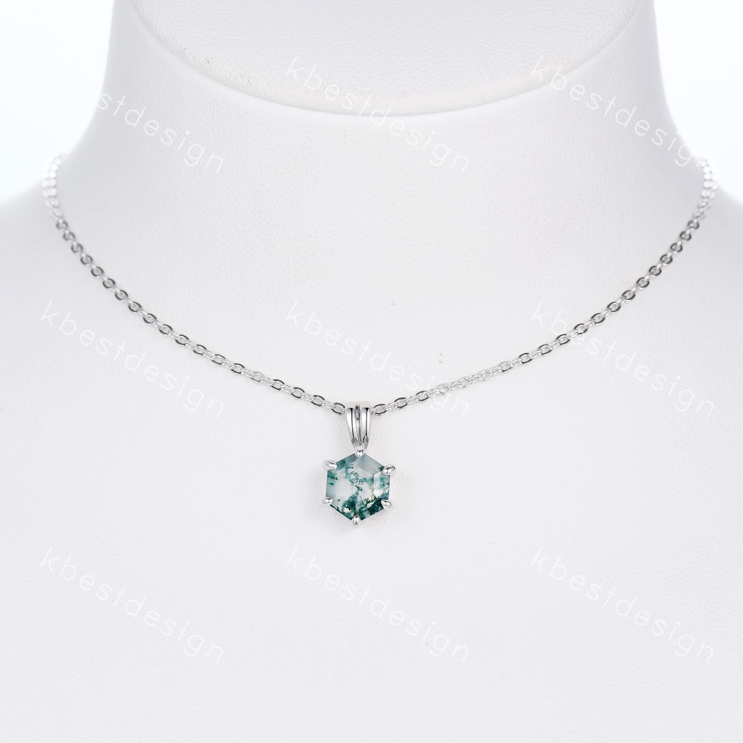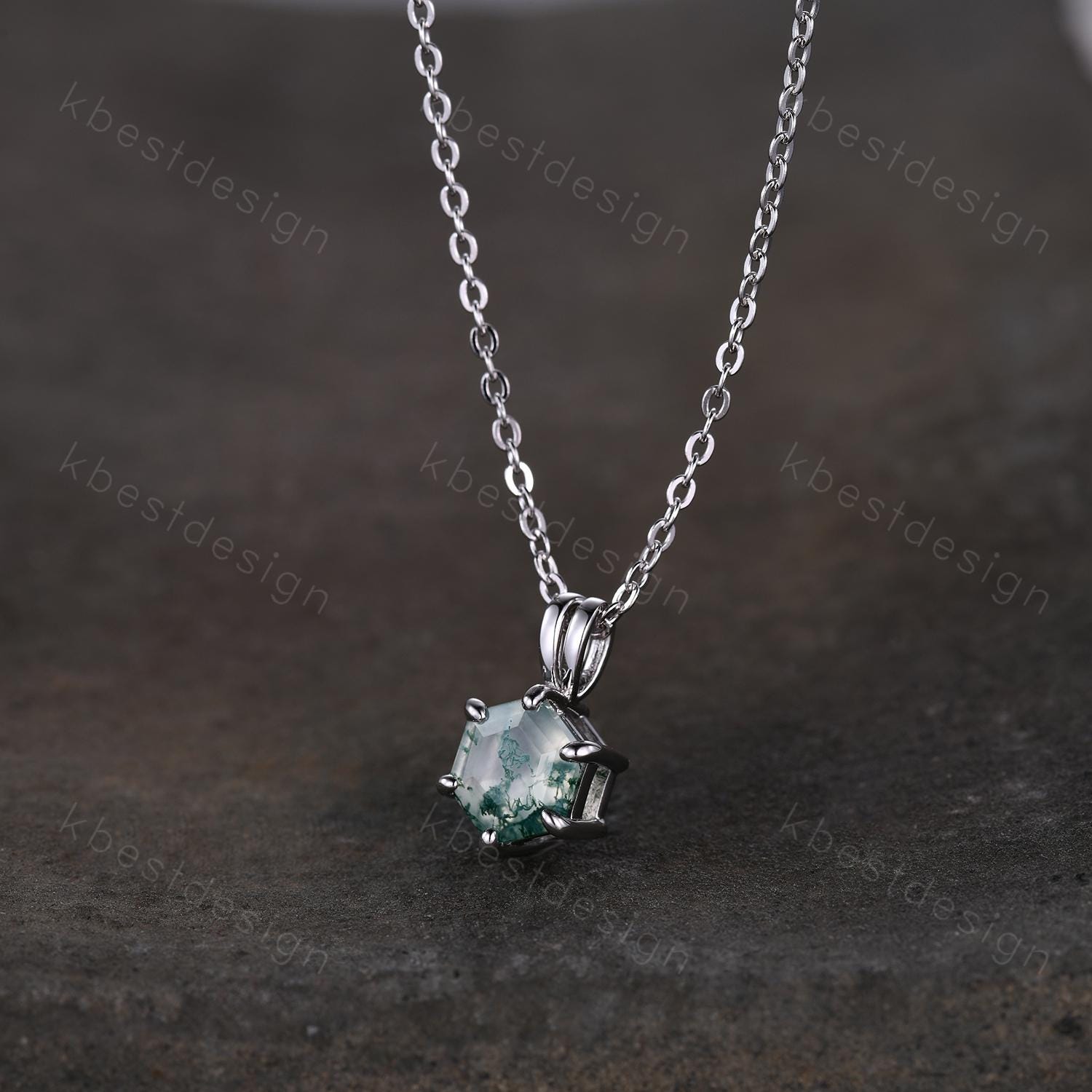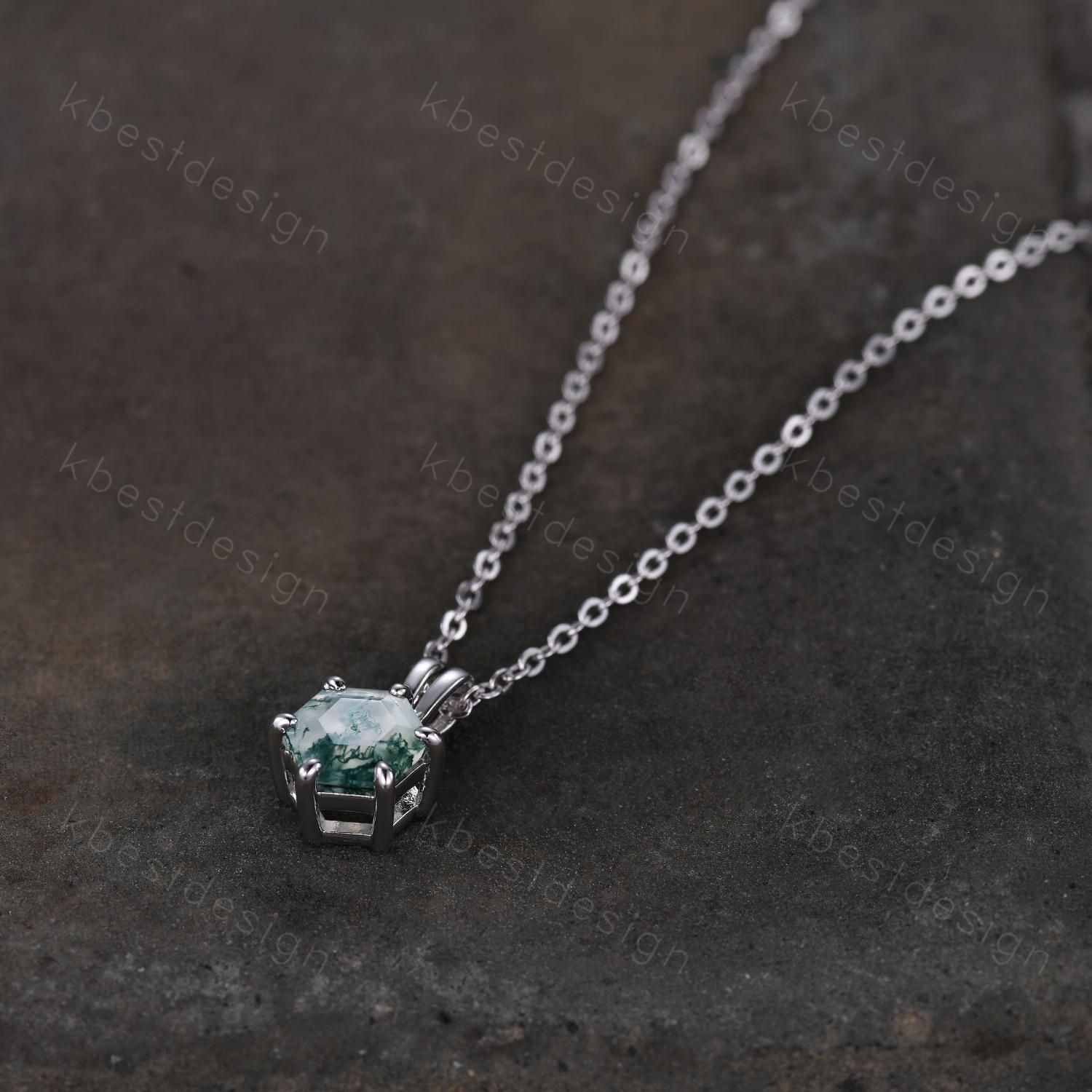 Hexagon Cut Moss Agate Necklace Minimalist Solitaire Pendant for Women Sterling Silver Necklace Unique Personalized Anniversary Necklace