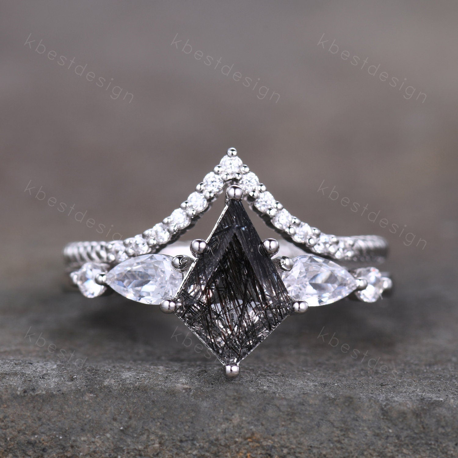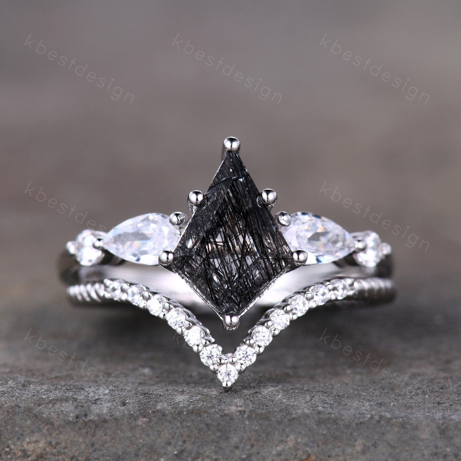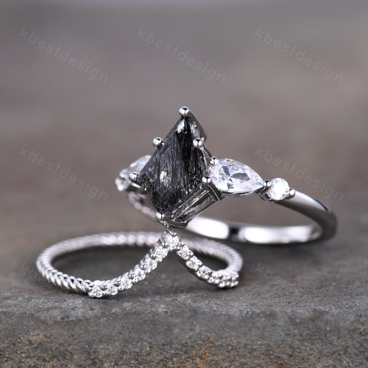 Kite cut black rutilated quartz engagement ring set sterling silver black gemstone ring set unique twisted stacking band promise ring set