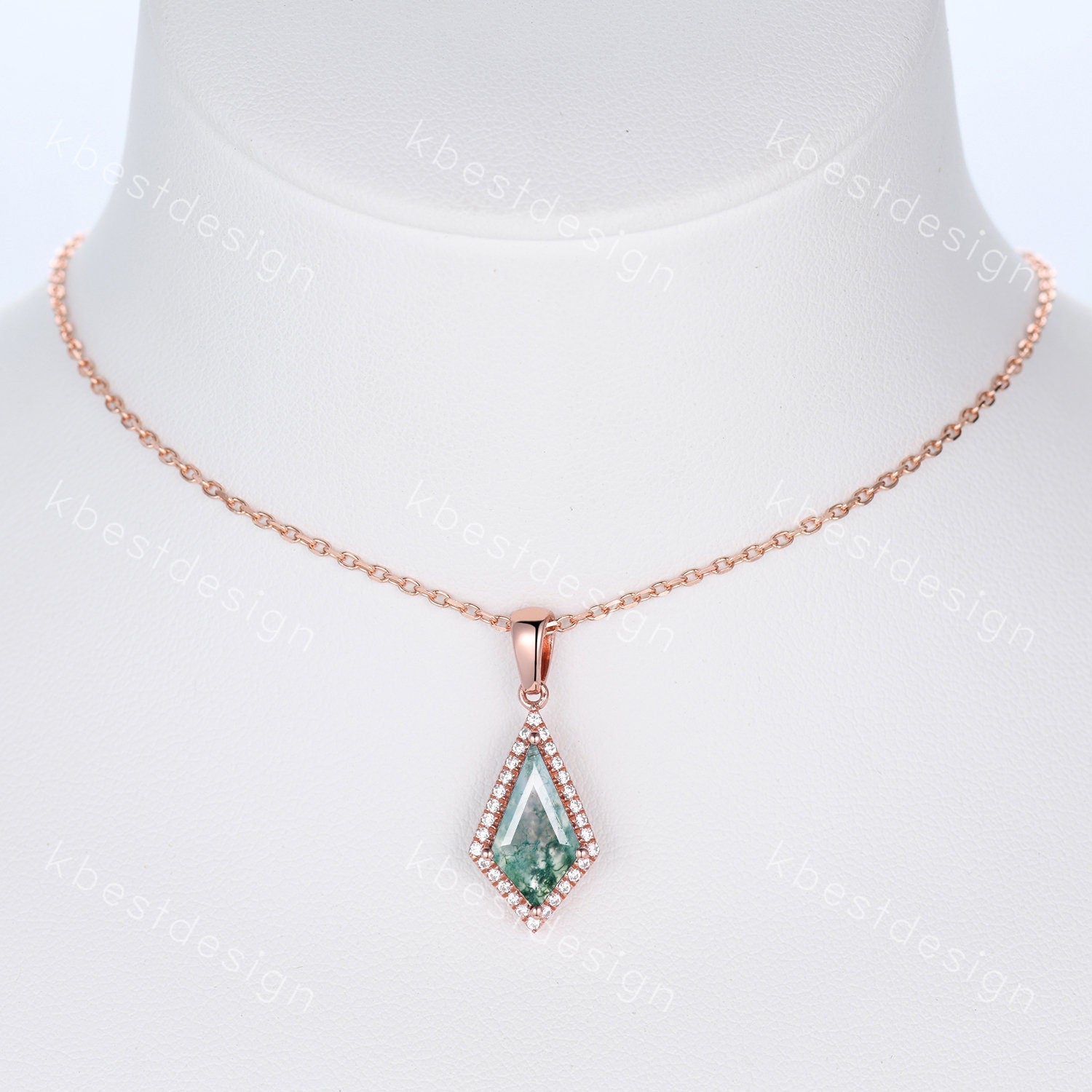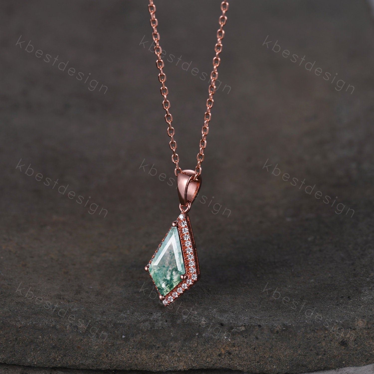 Here we have Kite cut green moss agate necklace solid 14k rose gold vintage unique customized pendant necklace for women gemstone bridal anniversary gift. For those who are looking for crystal jewelry which is handcrafted in details, this unique crystal necklace would be a perfect choice for you. Whether it be a Birthday gift for her, an anniversary gift her, or a celebration of yourself, this agate jewelry is the perfect gift from the heart.