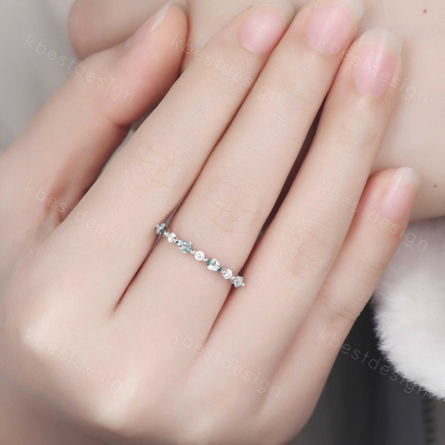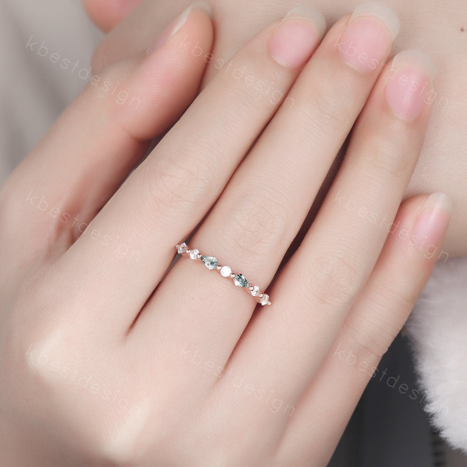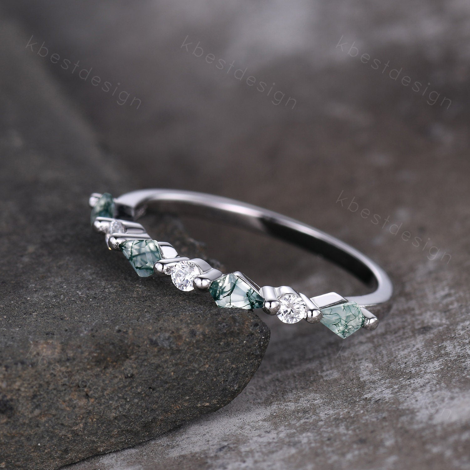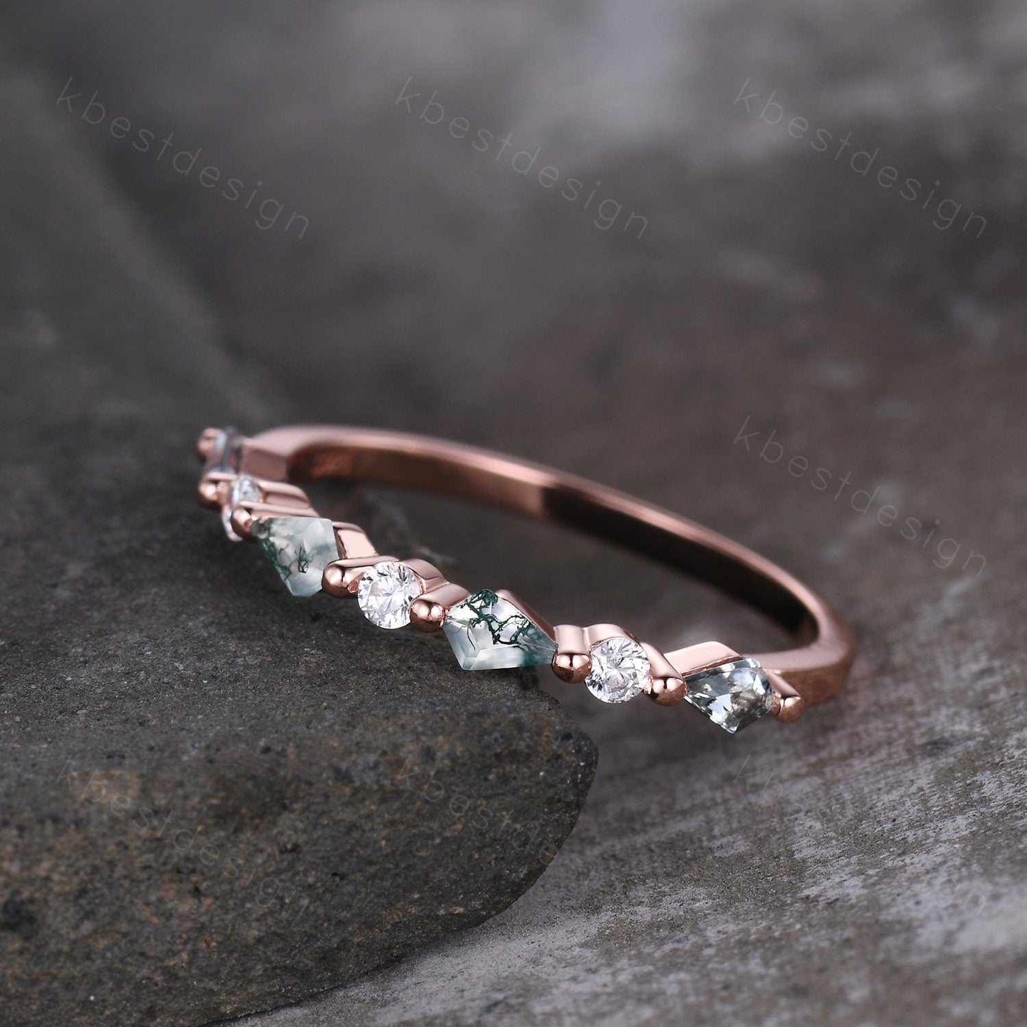 Kite cut Moss Agate Wedding Band Unique Rose Gold Wedding Band Antique Moissanite Ring Minimalist Bridal Matching Stackable band Anniversary gift for her.