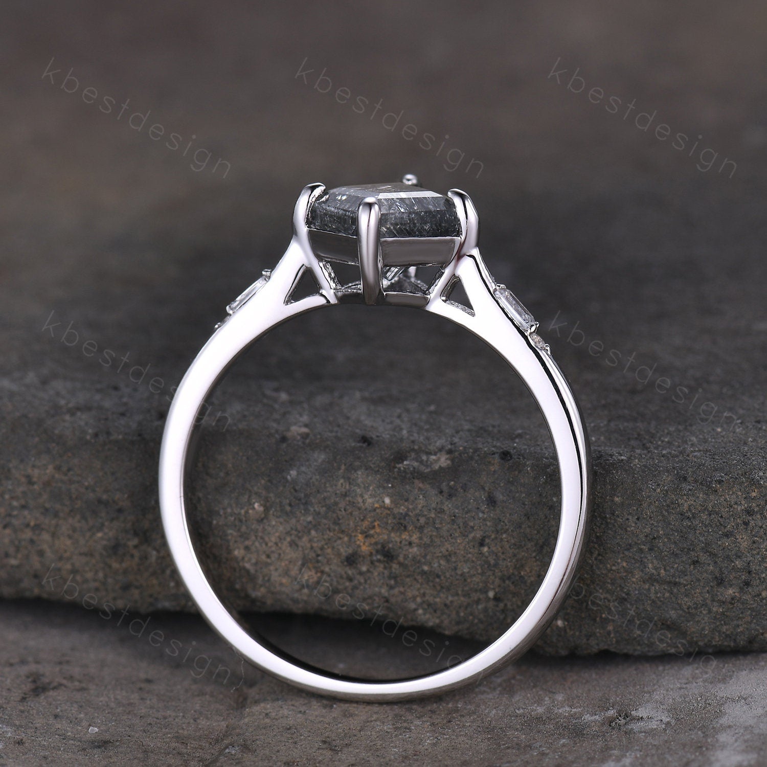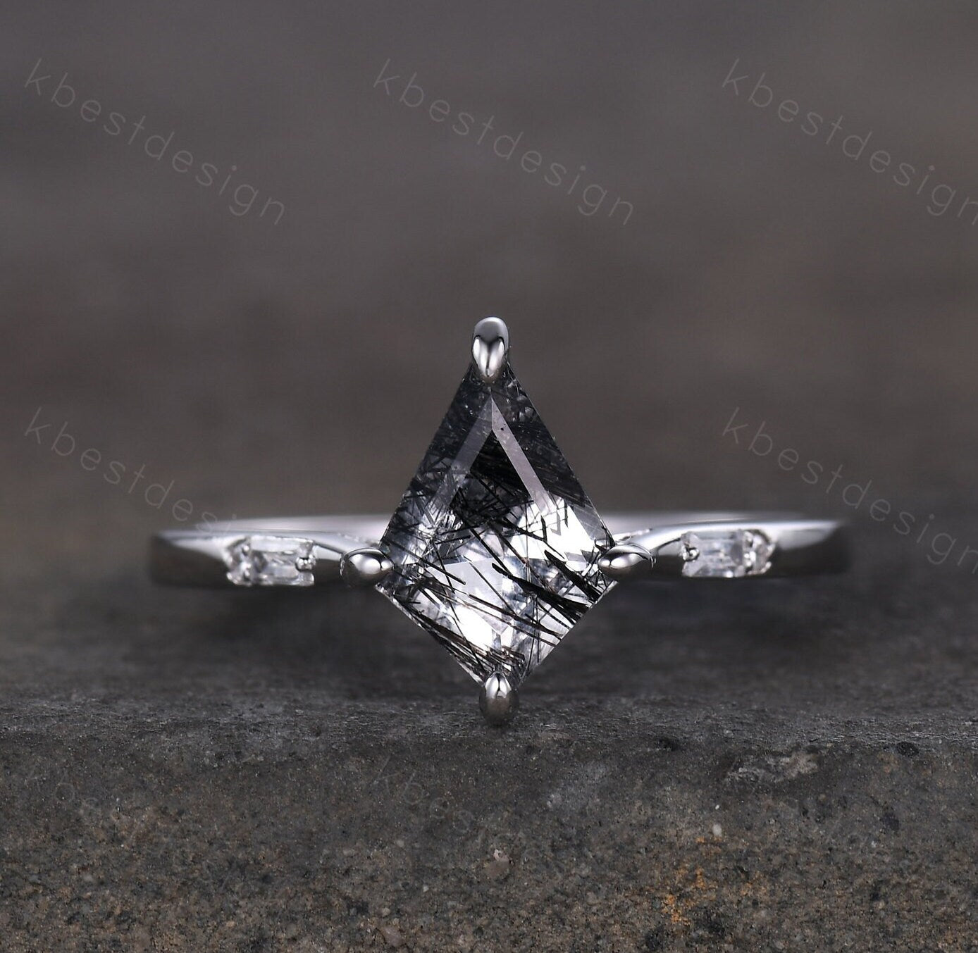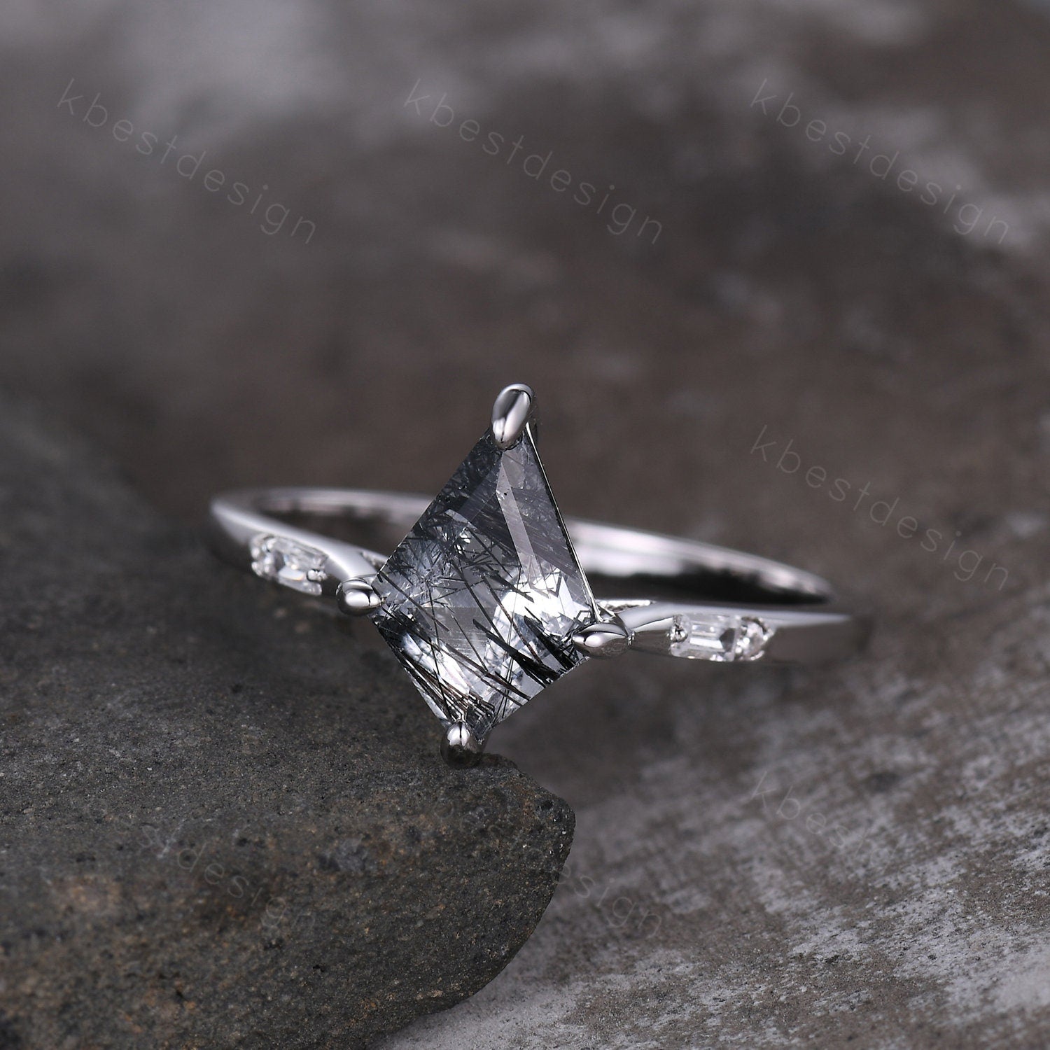 This is a Kite Cut Natural Black Rutilated Quartz Engagement Ring Unique Black Gemstone Ring Sterling Silver Ring Baguette Ring Promise Ring