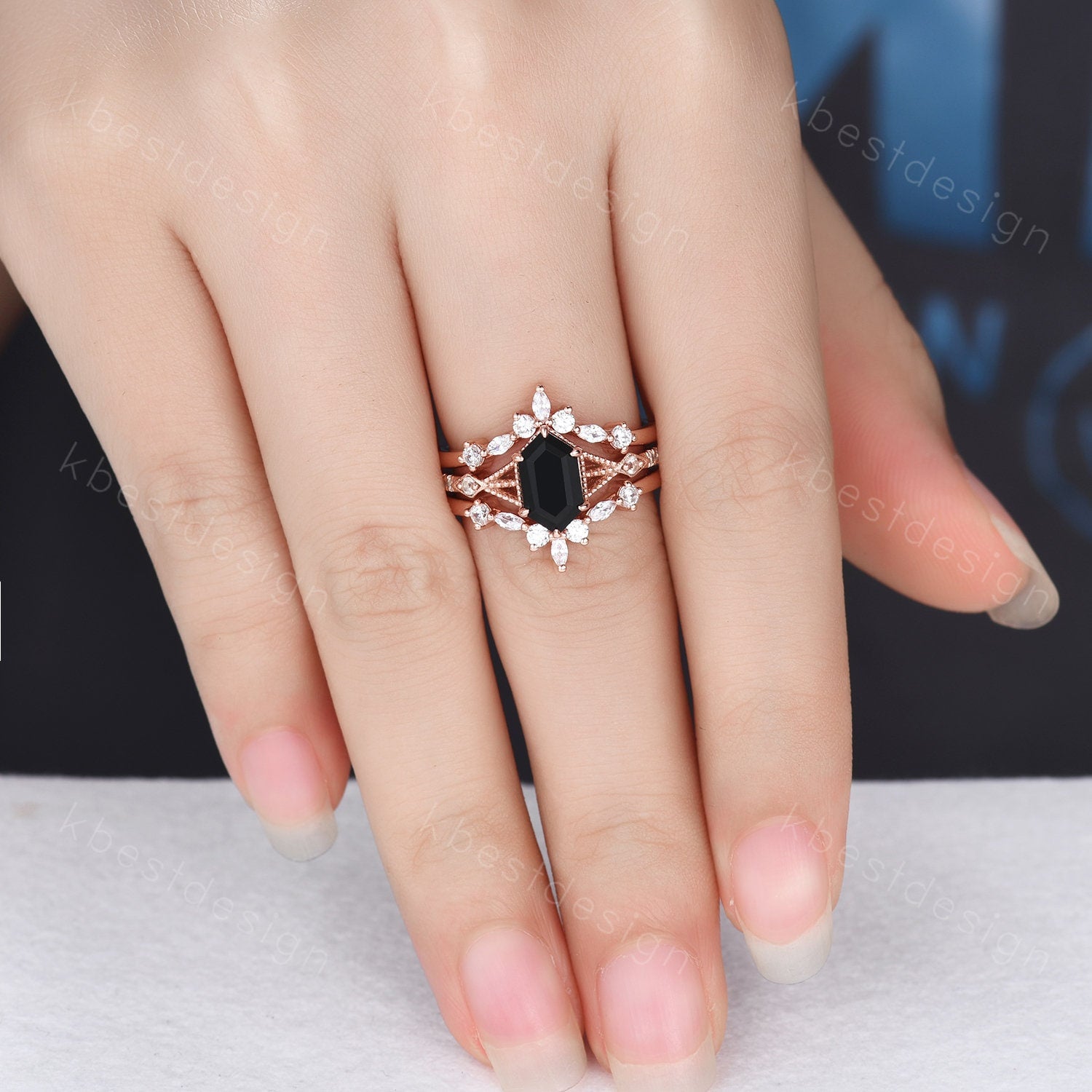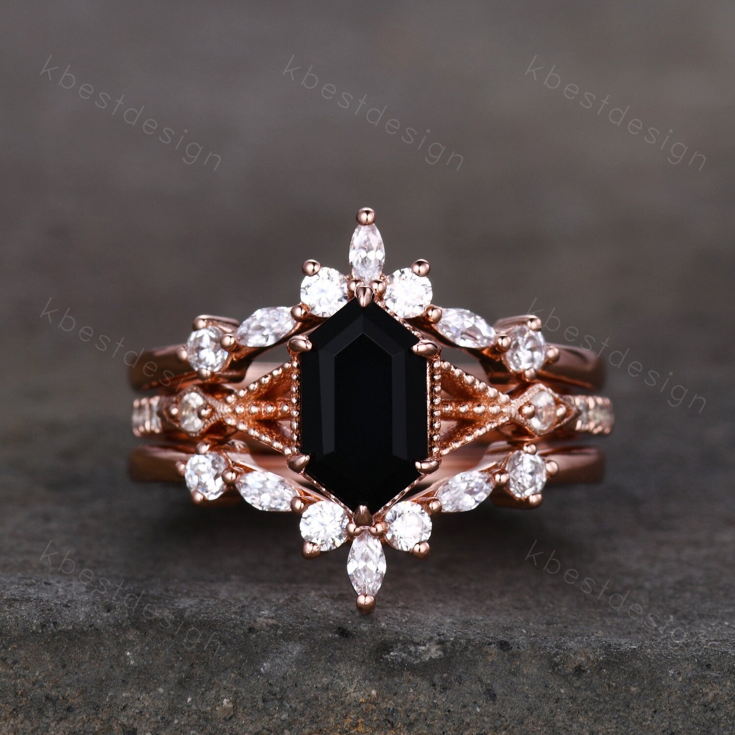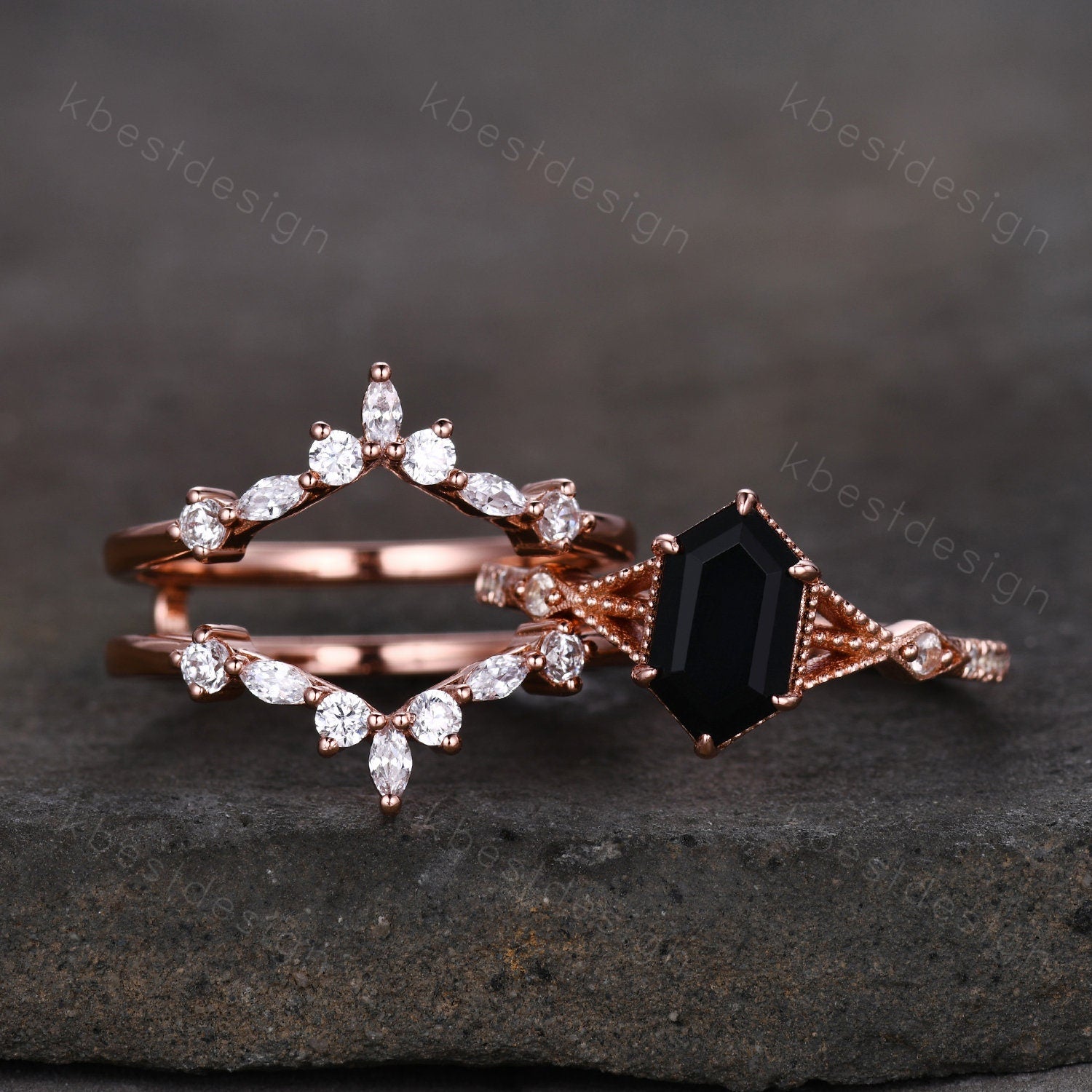 Long Hexagon cut Black Onyx Ring Set Vintage Rose Gold Engagement Ring Unique Double Curved Moissanite Promise Ring Anniversary Ring
