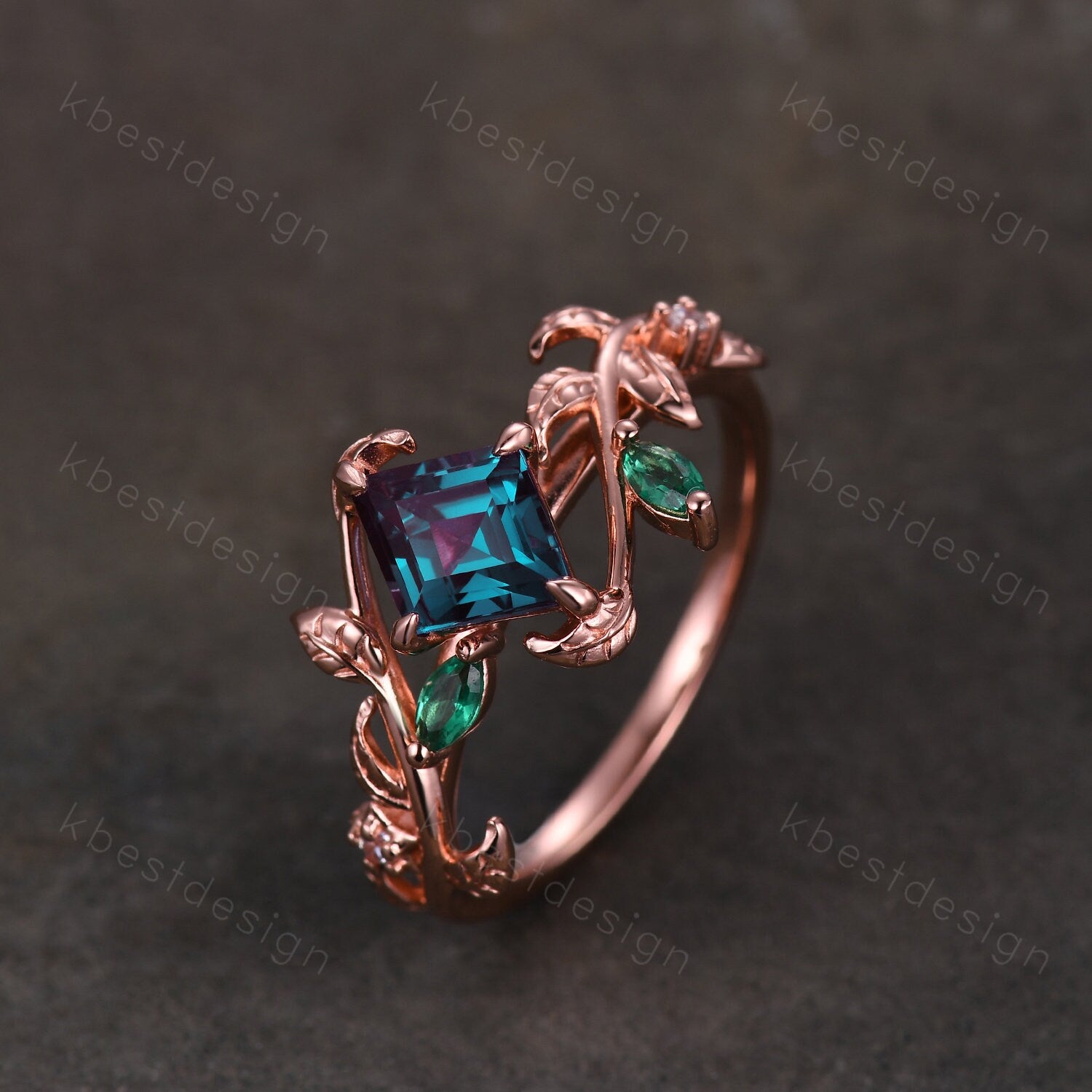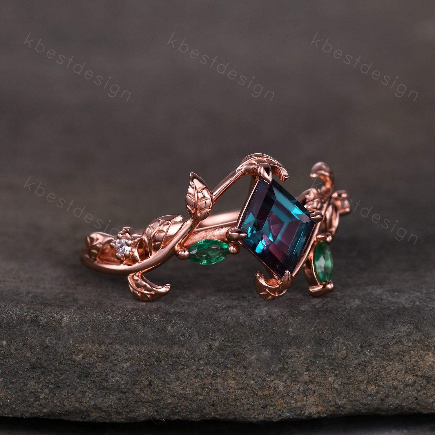 Lozenge cut Alexandrite engagement ring rose gold Art deco leaf design ring marquise cut emerald ring unique twig branch ring promise ring