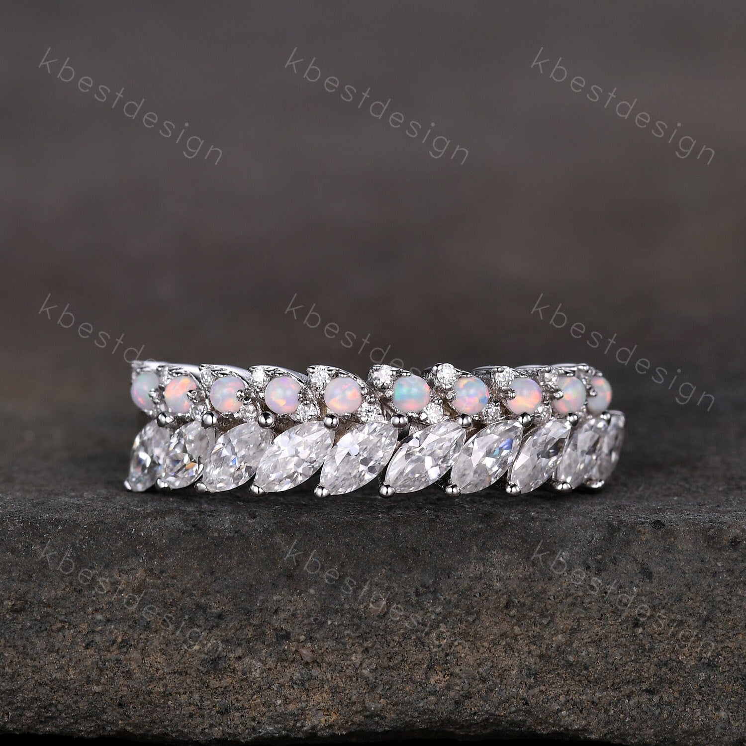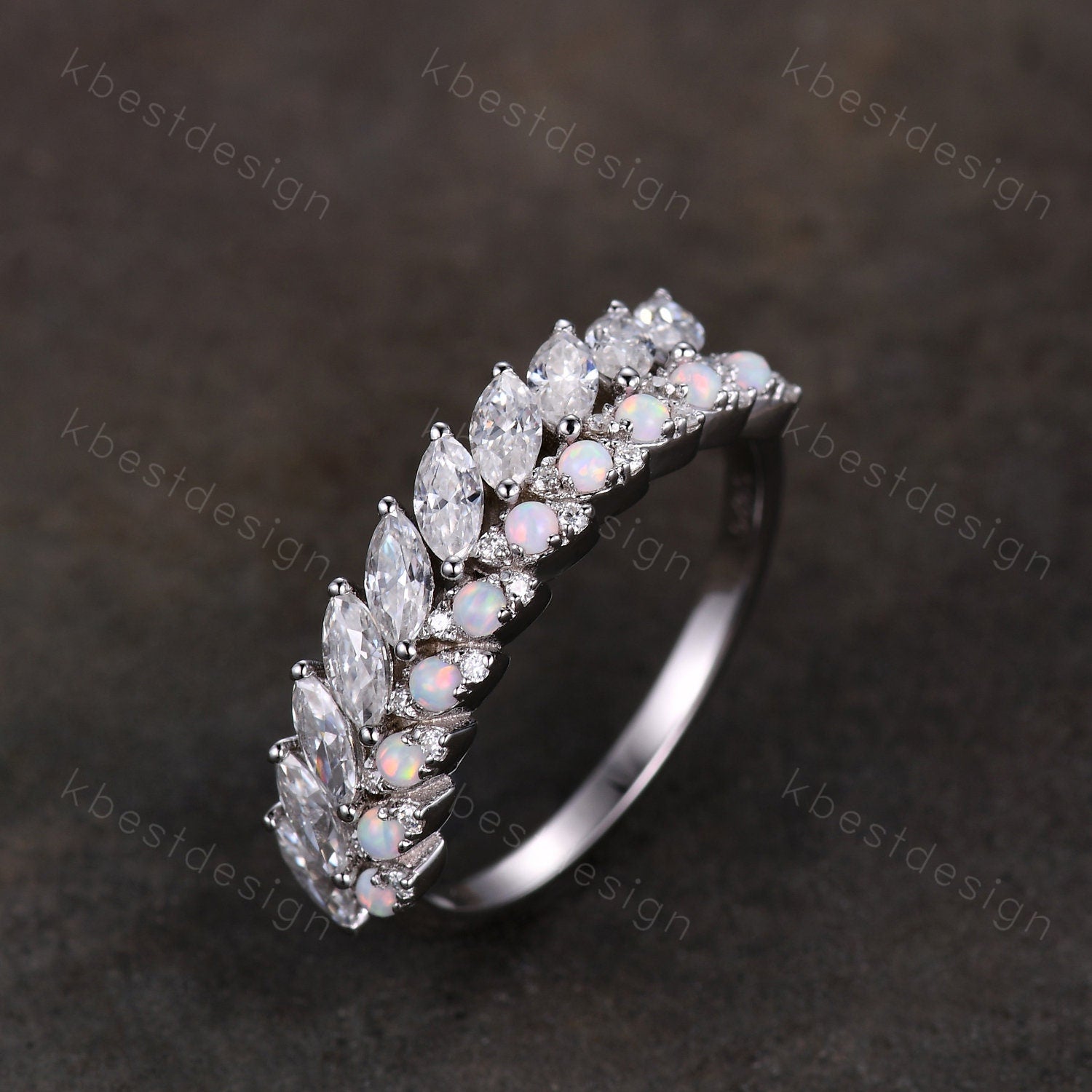 This is a Marquise cut Moissanite Wedding Band Half Eternity Stacking Band Unique Opal Wedding Ring Women Matching Band Promise Anniversary Ring.