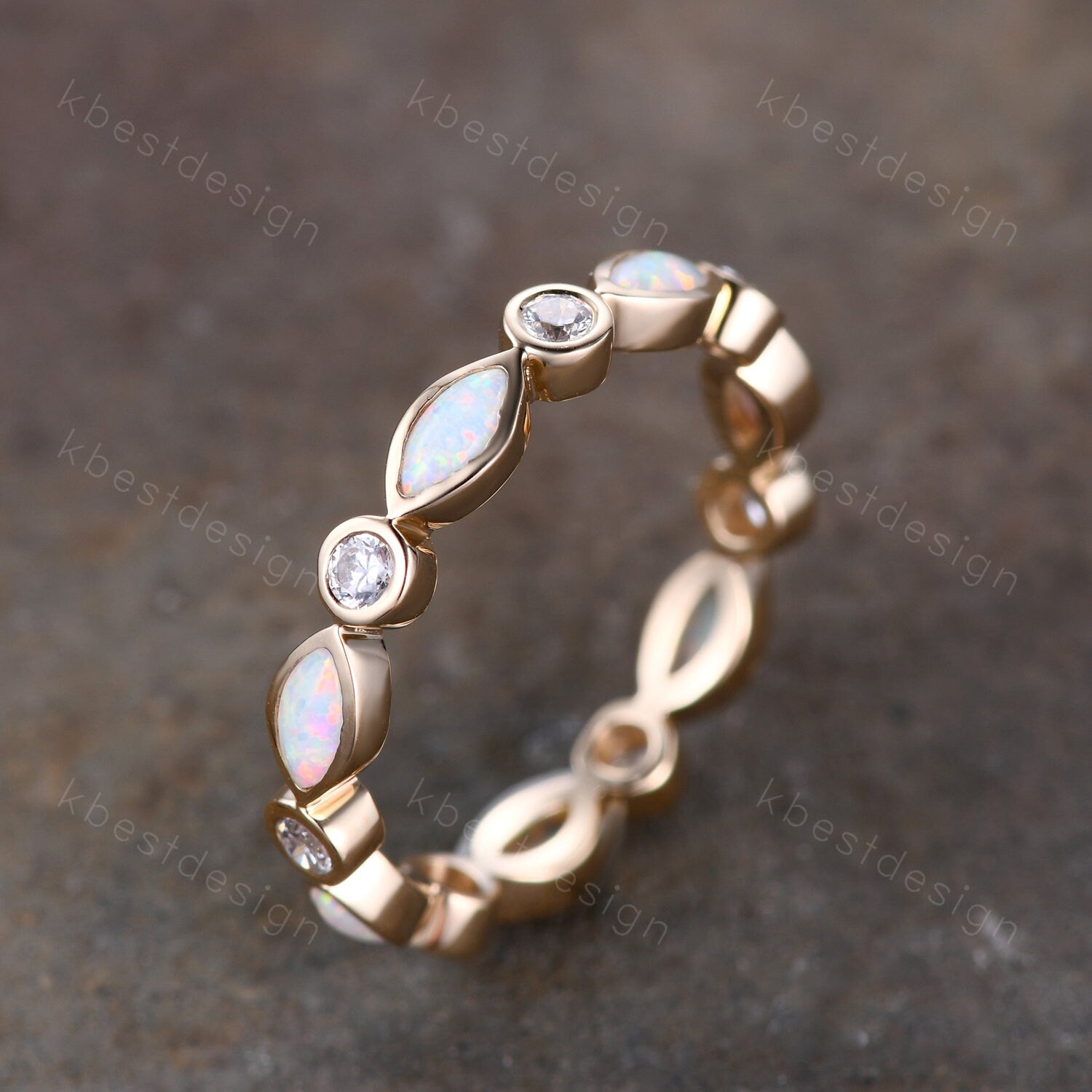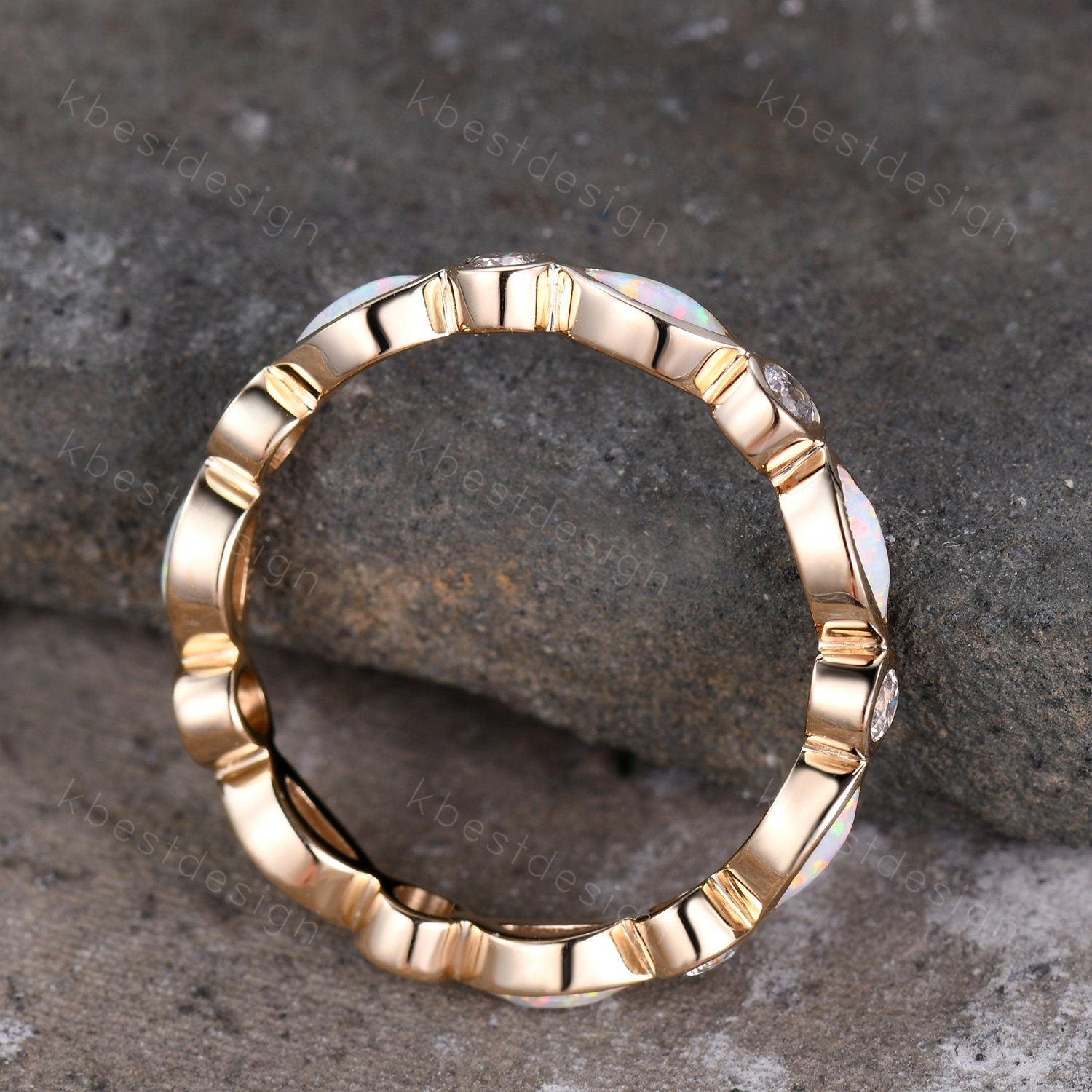 This is an unique bezel set Opal wedding band in yellow gold. (The stones can be changed, please feel free to contact me if needed)