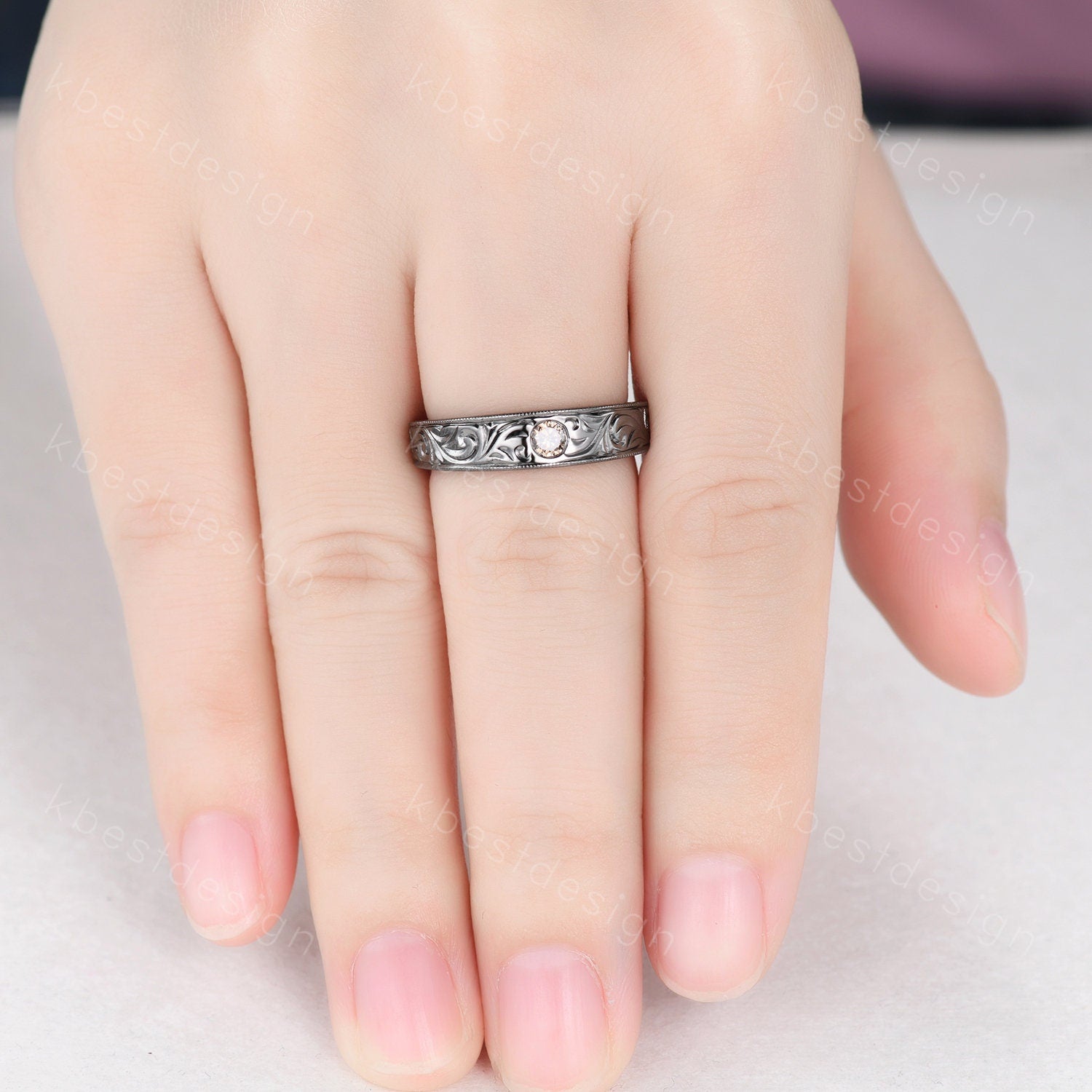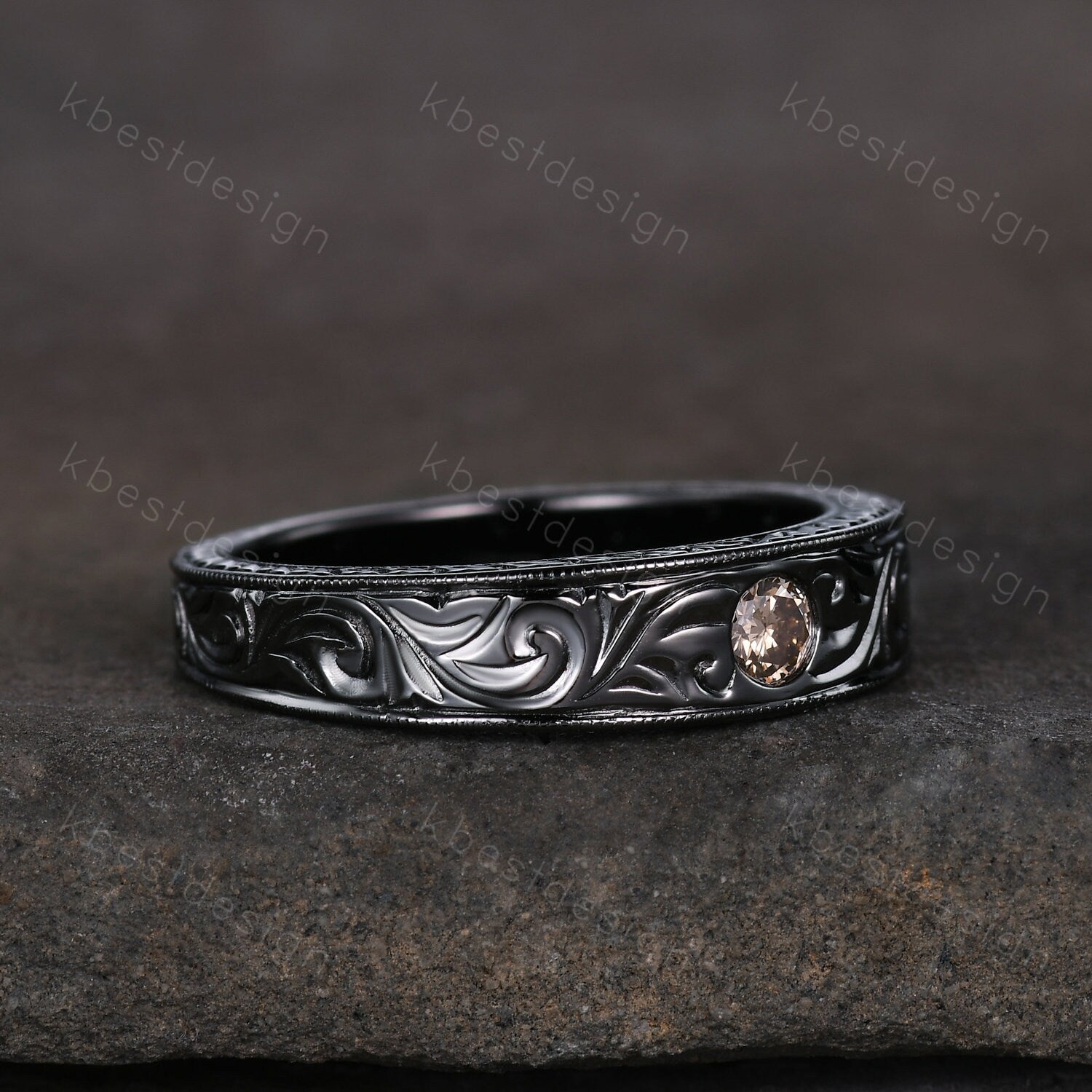 Mens Champagne Moissanite Wedding Band Antique Filigree Black Gold Wedding Band Vintage Mens Stacking Band Unique His Wedding Ring