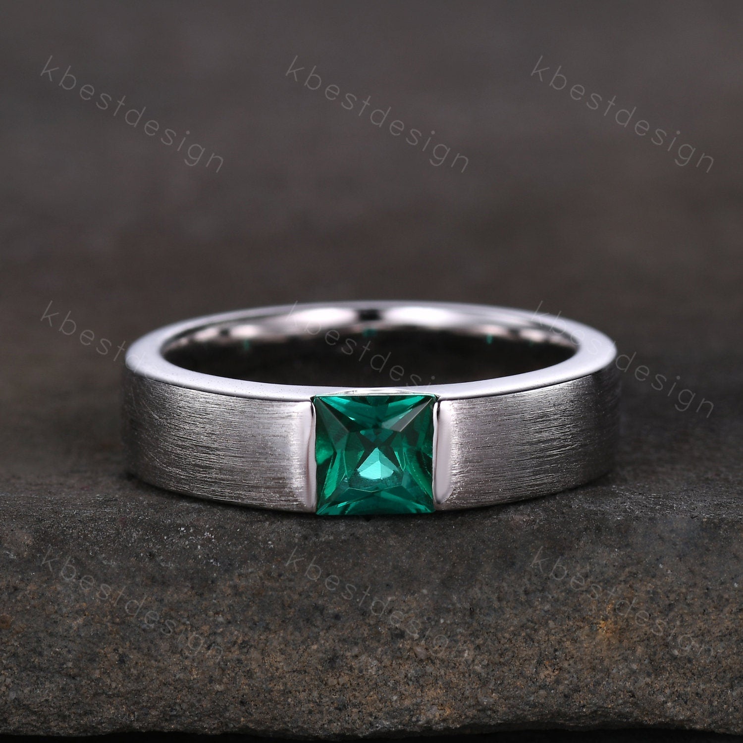 Mens Green Emerald Wedding Band, 5mm Princess Cut Green Emerald Mens Wedding Band, Solid Gold 10k/14k/18k Wedding Ring, His Wedding Band