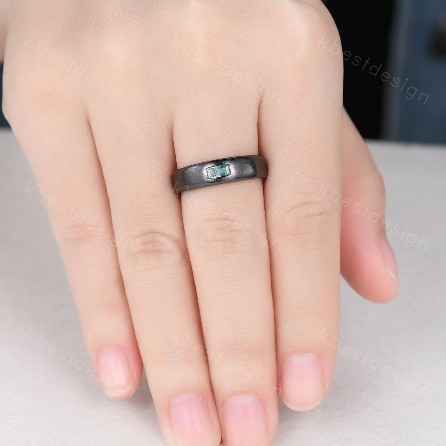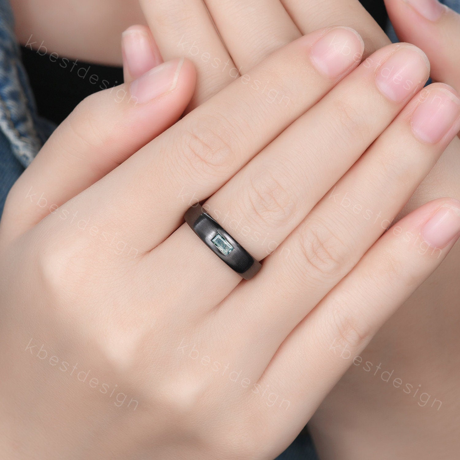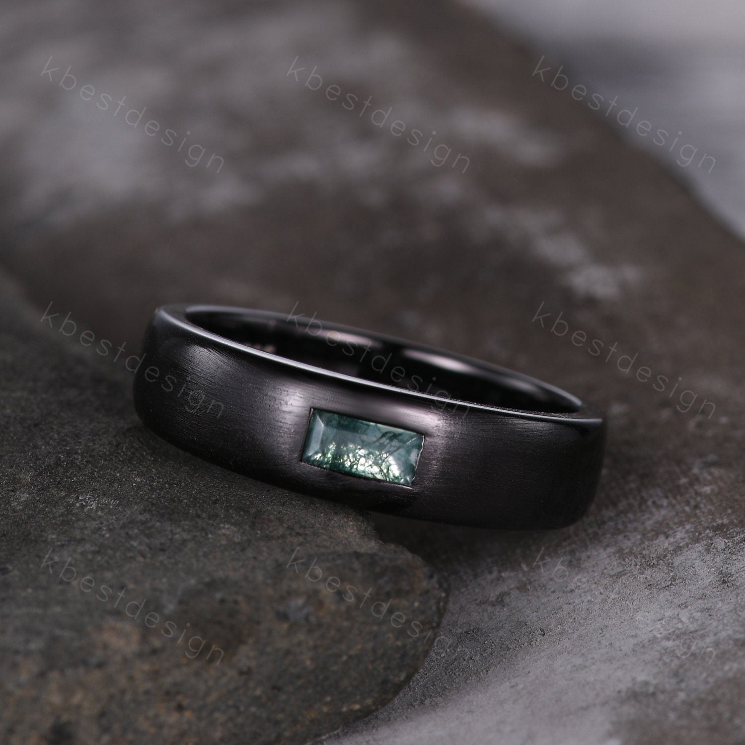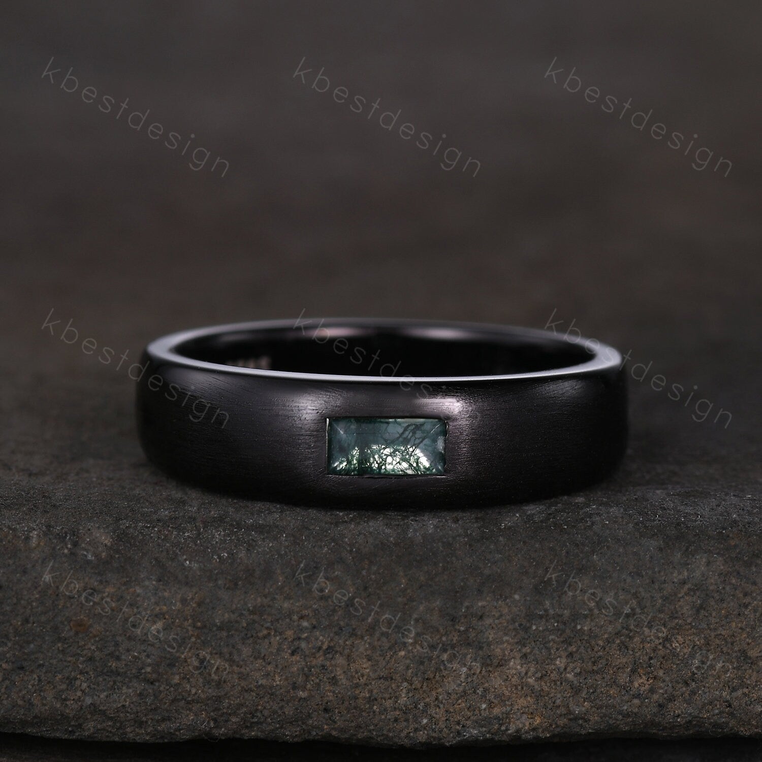 Mens Moss agate Wedding Band Baguette Cut Green Agate Band 5mm Black Gold Men's Stacking Matching Band Brushed Finish Band Gift for Him