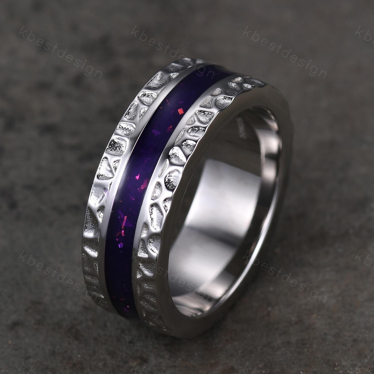 This is a Mens Purple Enamel Wedding Band Unique Eternity Wedding Ring 925 Sterling Silver Ring Mens Hammered Stacking Matching Band Personalized Gift.