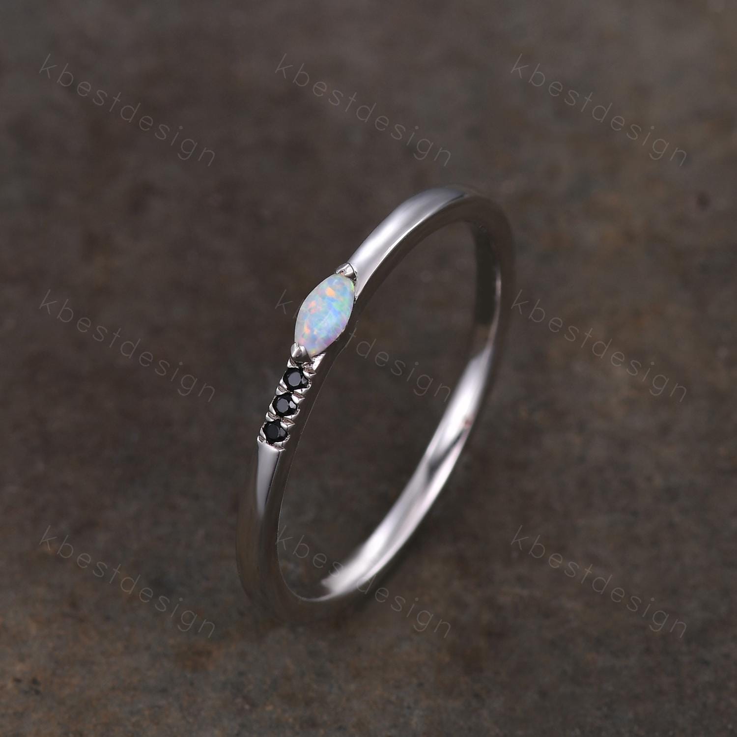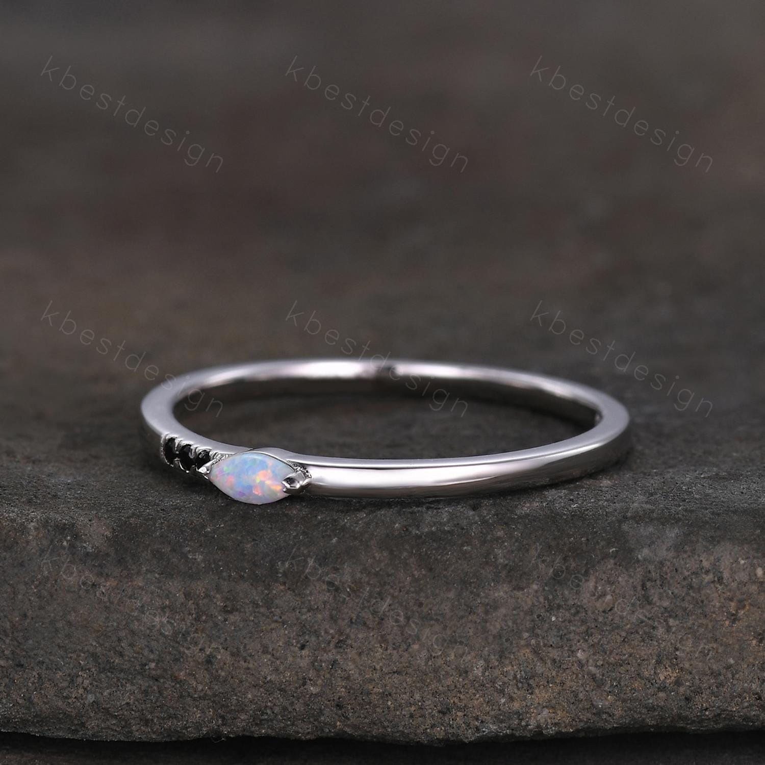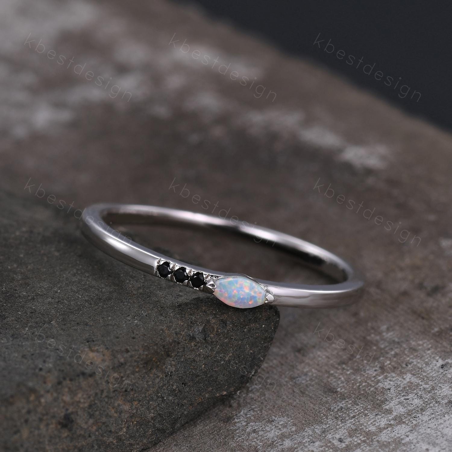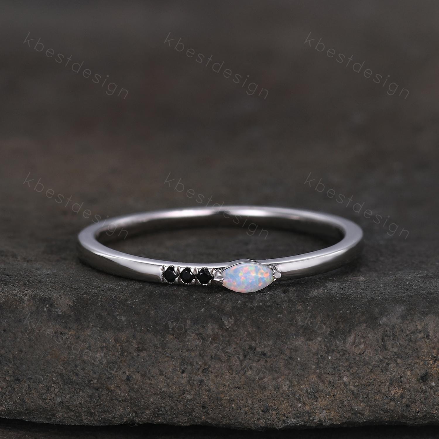 Minimalist Opal wedding band silver Black spinel band dainty marquise cut opal ring Unique stacking matching band Promise Anniversary gift