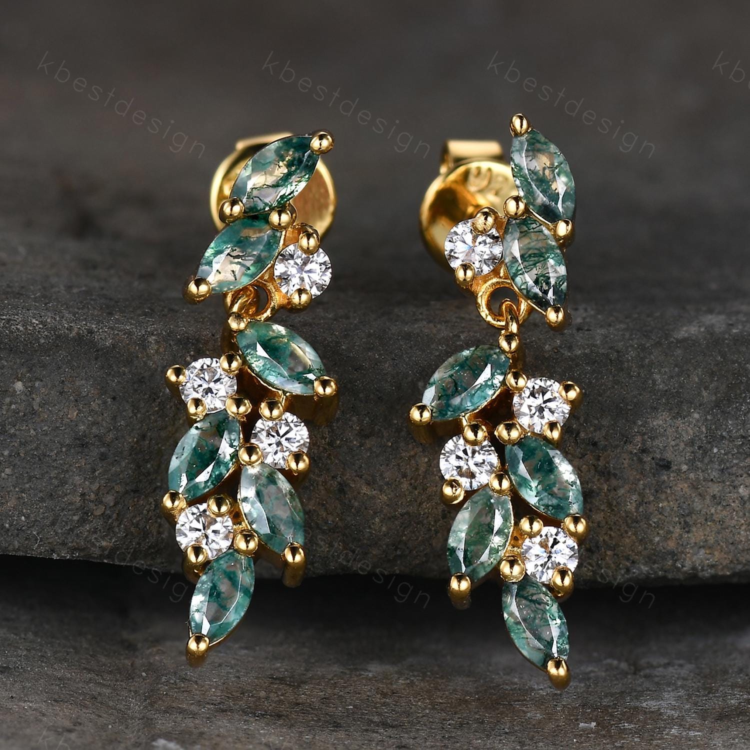 Moss agate cluster earring studs Unique marquise cut moss agate earrings Vintage Moissanite yellow gold jewelry Anniversary gift for her. Each pair of earrings is lovingly made with hand selected moss agate to add a little extra shine and magic to your look overall.