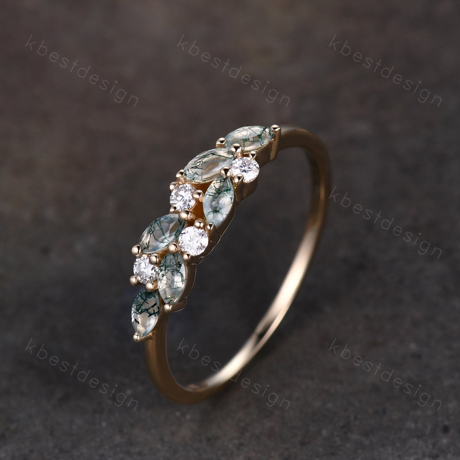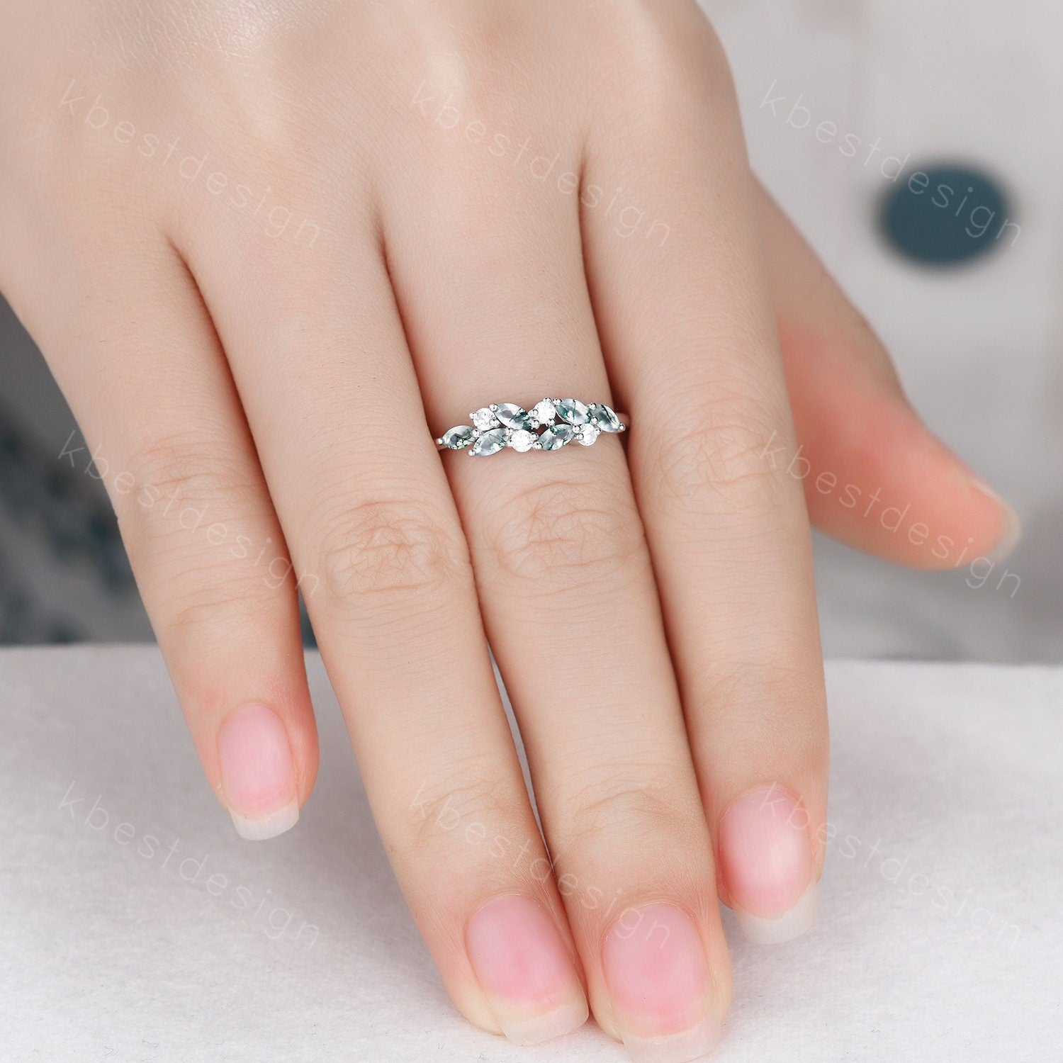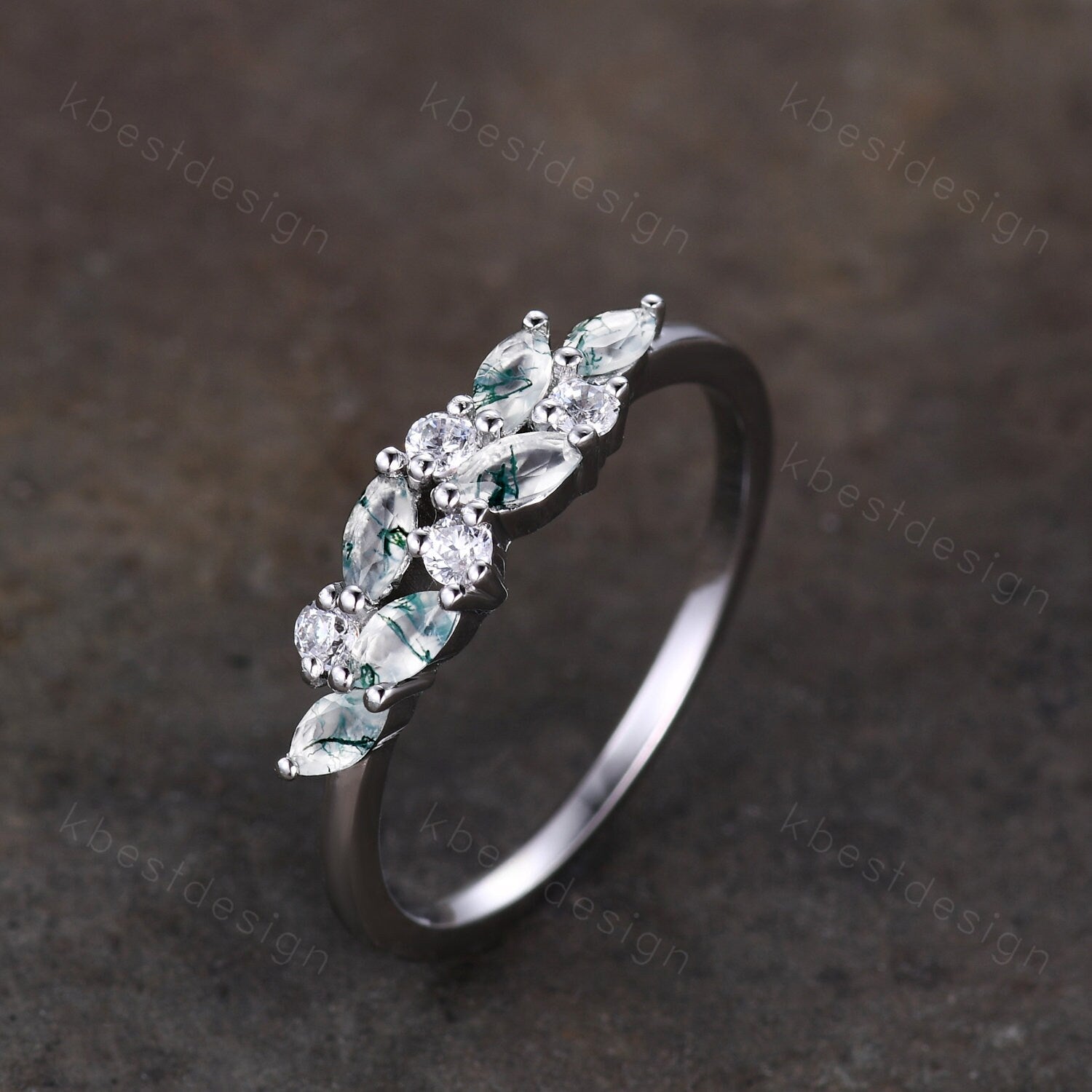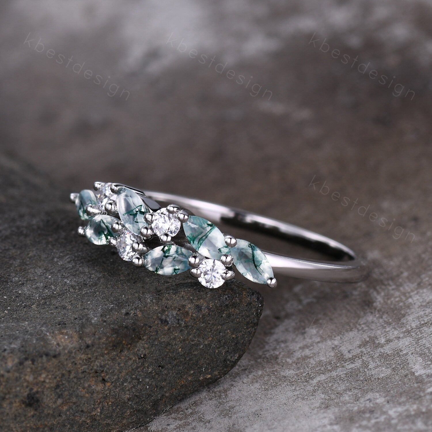 Moss agate cluster wedding band Unique marquise cut moss agate wedding band Vintage Moissanite ring sterling silver ring Anniversary gift