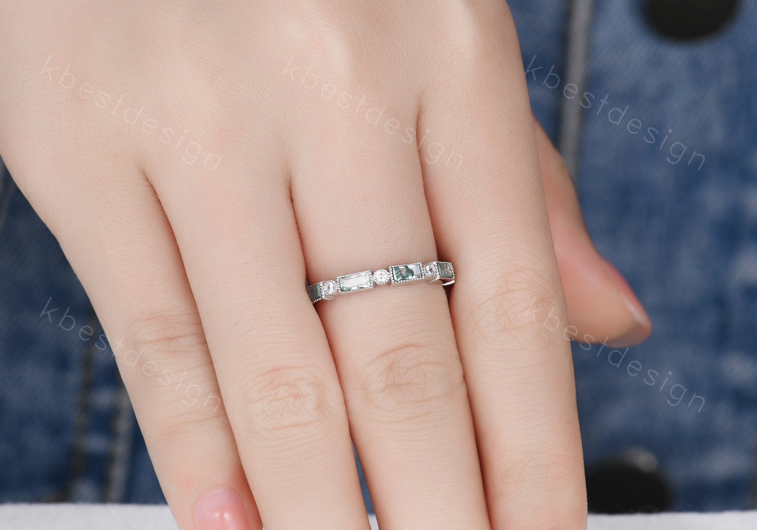Moss Agate Wedding Band Half Eternity Baguette Moss Agate Band Art Deco Stacking Wedding Ring Anniversary Ring Sterling Silver Rose Gold
