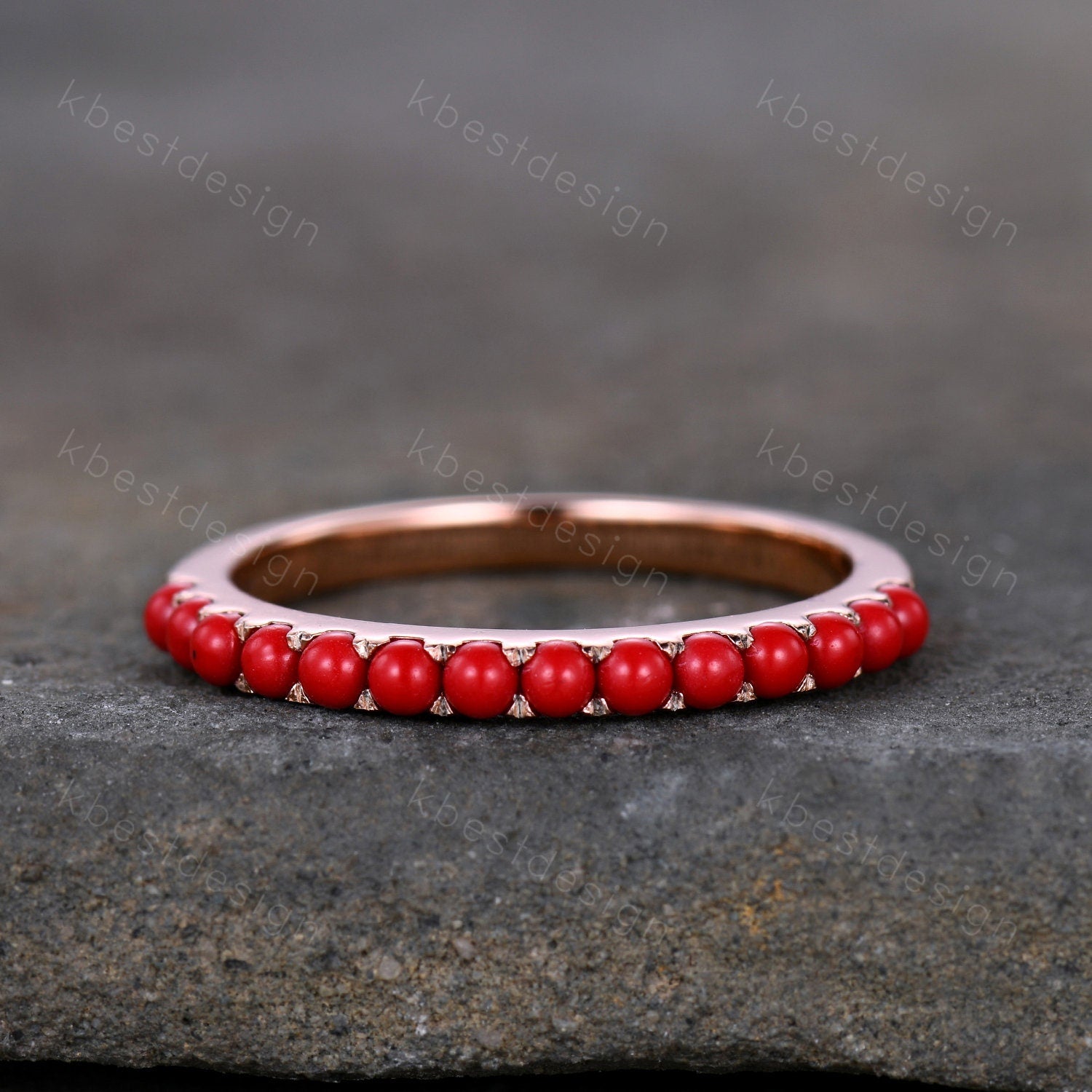 Natural Half Eternity Coral Band, Red Coral Wedding Ring, Dainty Stacking Band, Rose Gold Red Coral Ring, Coral Stone Ring, Anniversary Ring