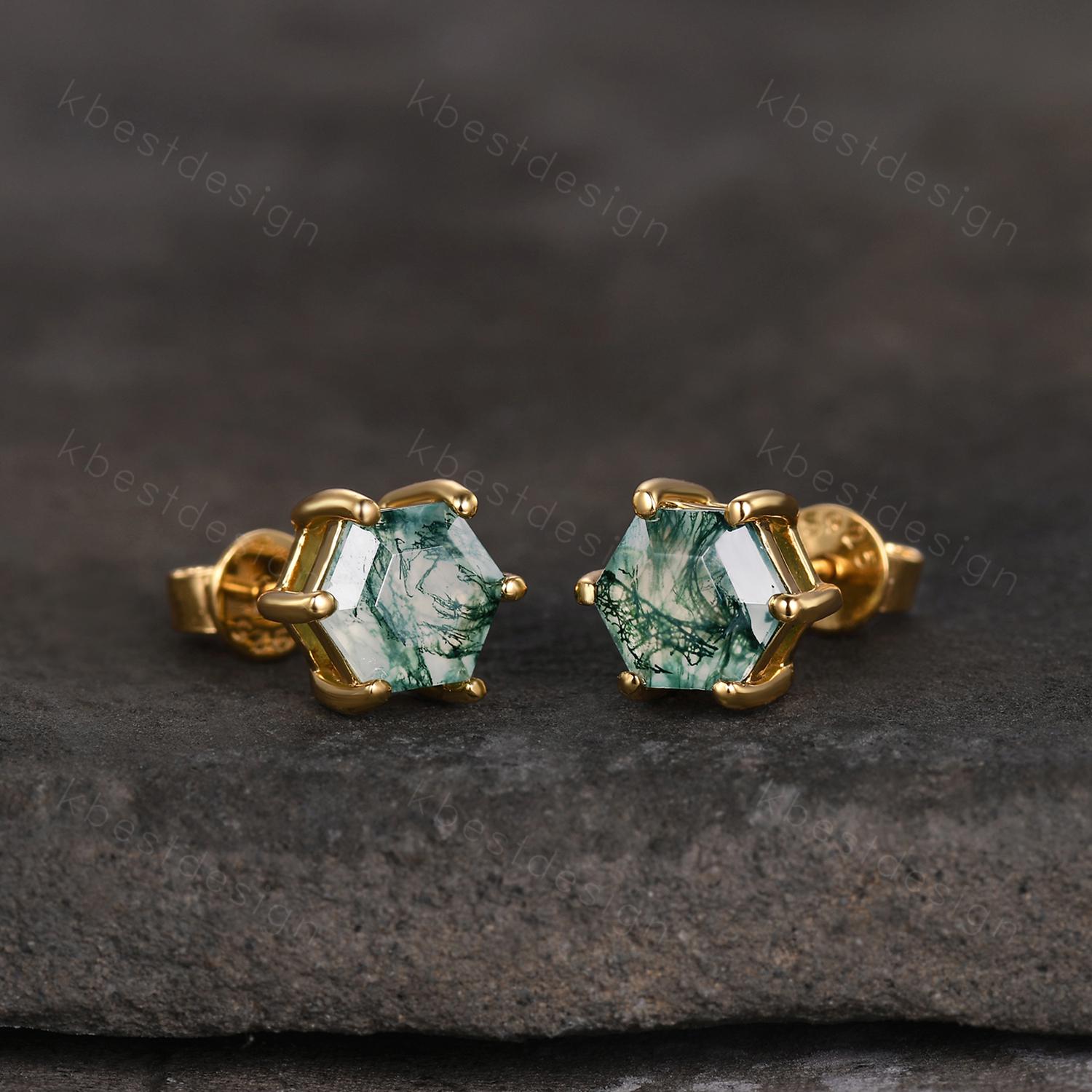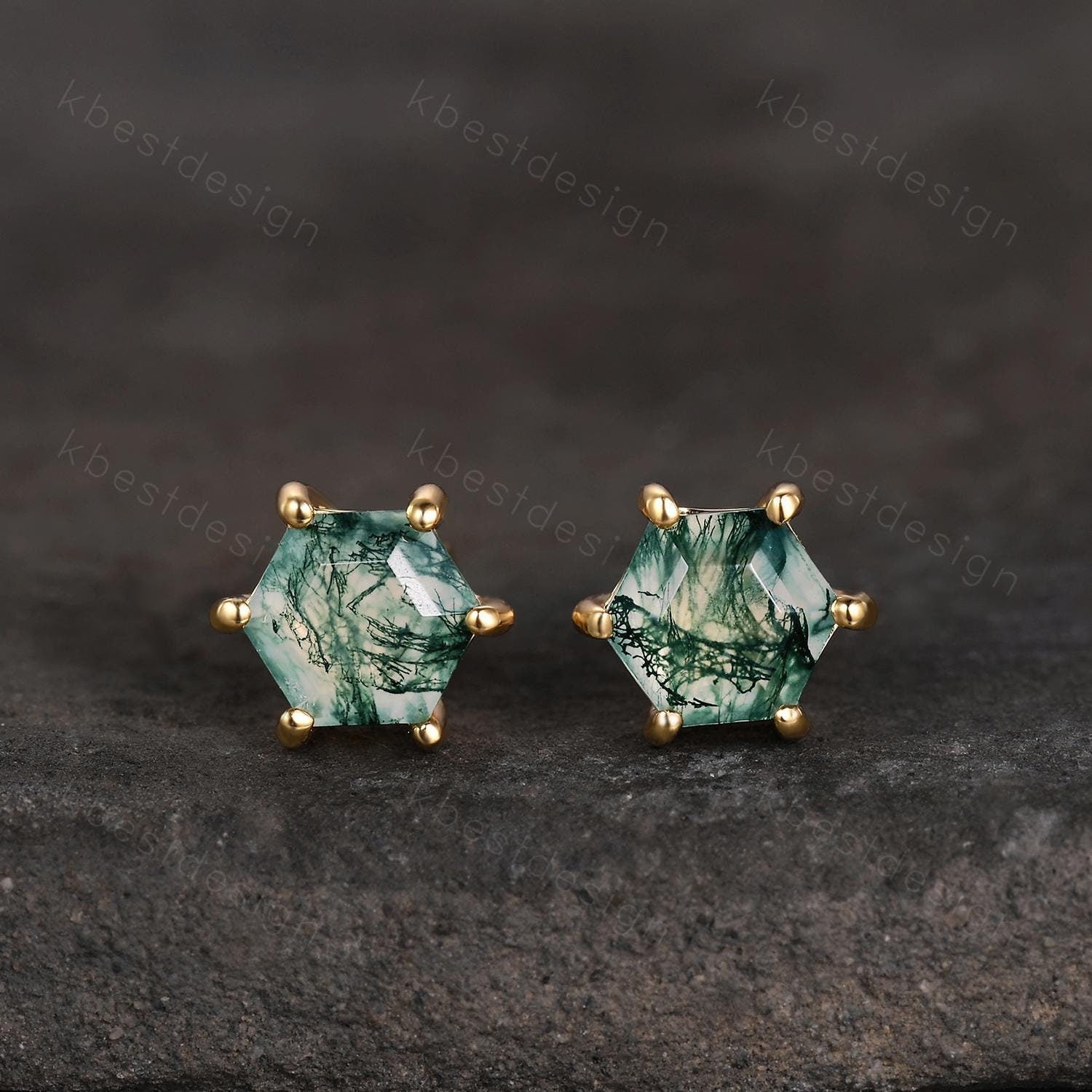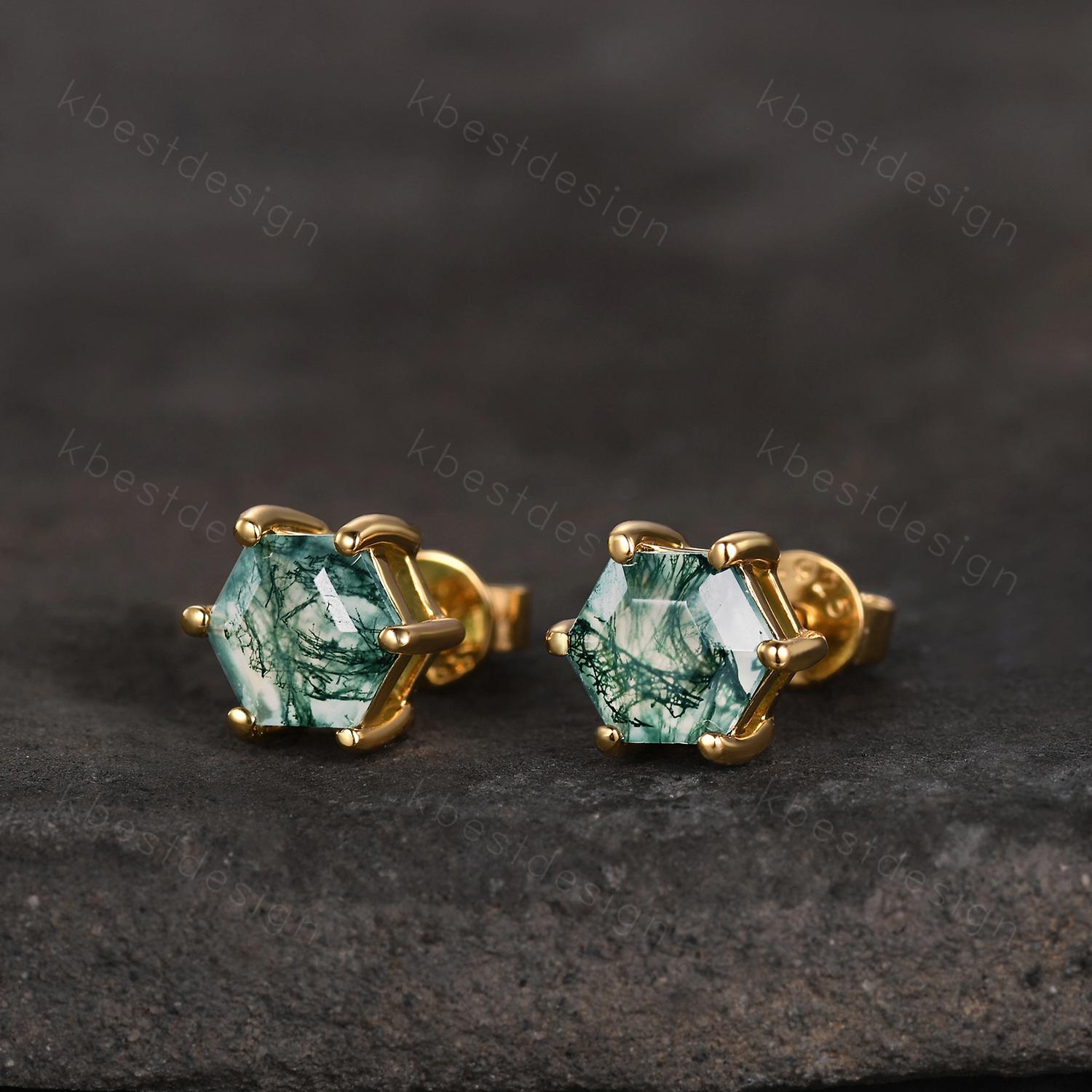 Natural moss agate stud earrings, yellow gold studs, hexagon cut moss agate earring studs, best friend gift, anniversary gift for her