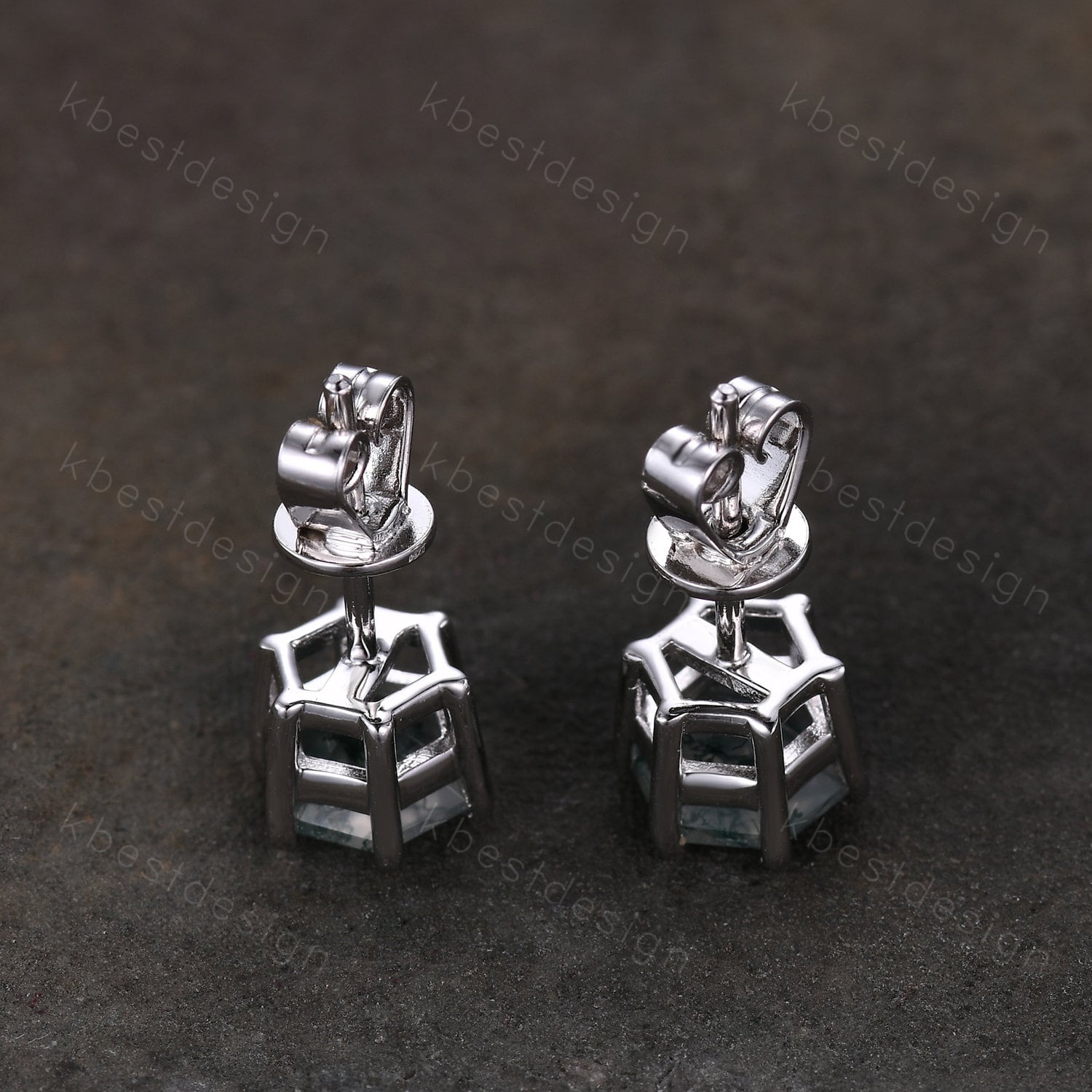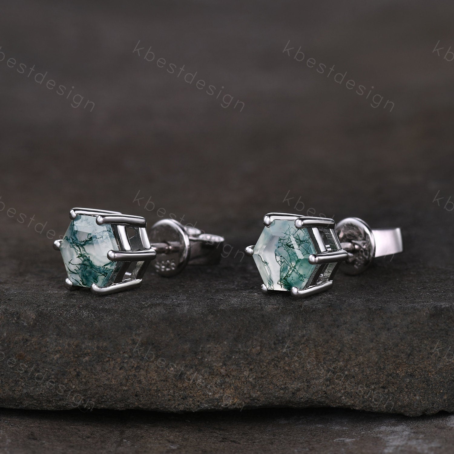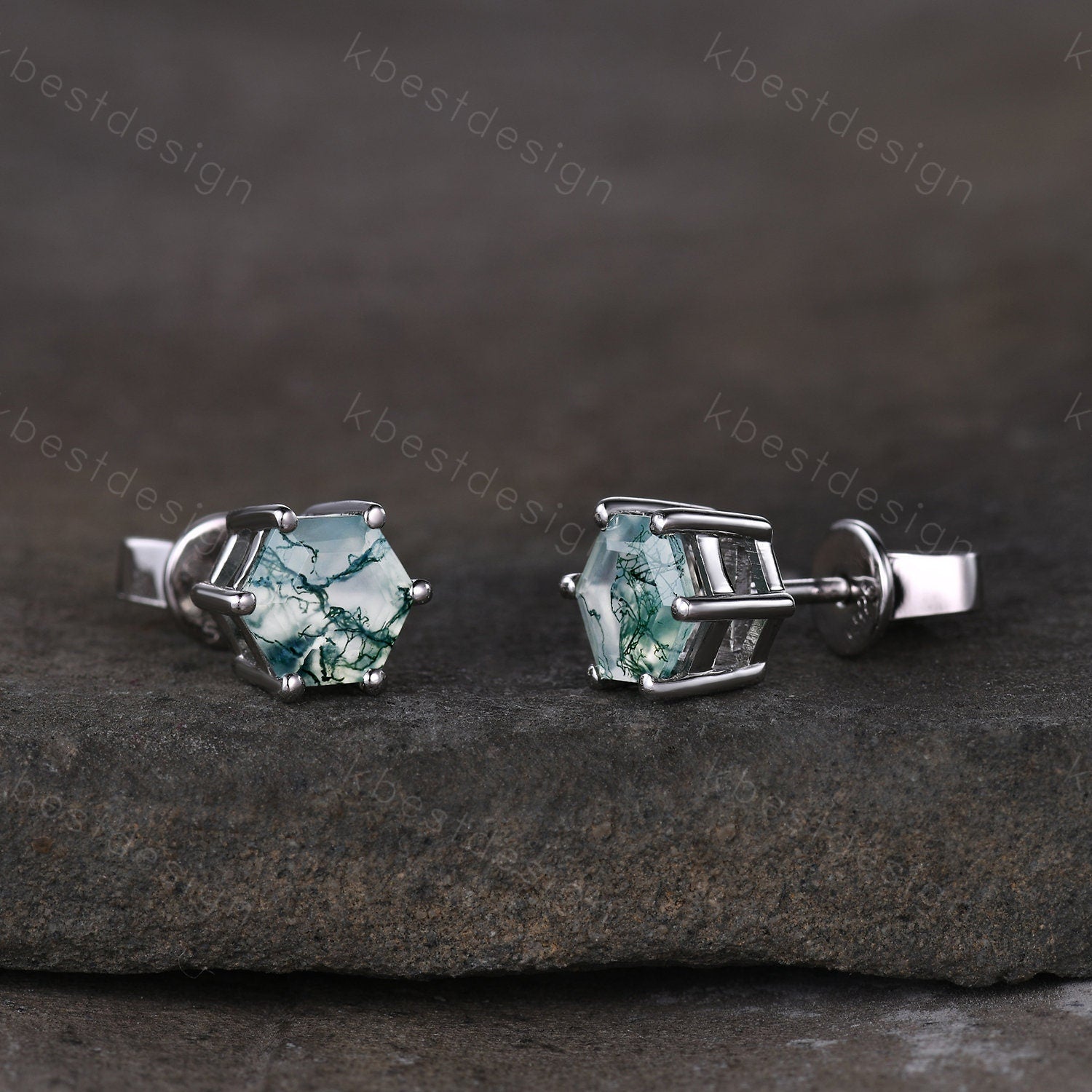 Natural moss agate stud earrings, yellow gold studs, hexagon cut moss agate earring studs, best friend gift, anniversary gift for her