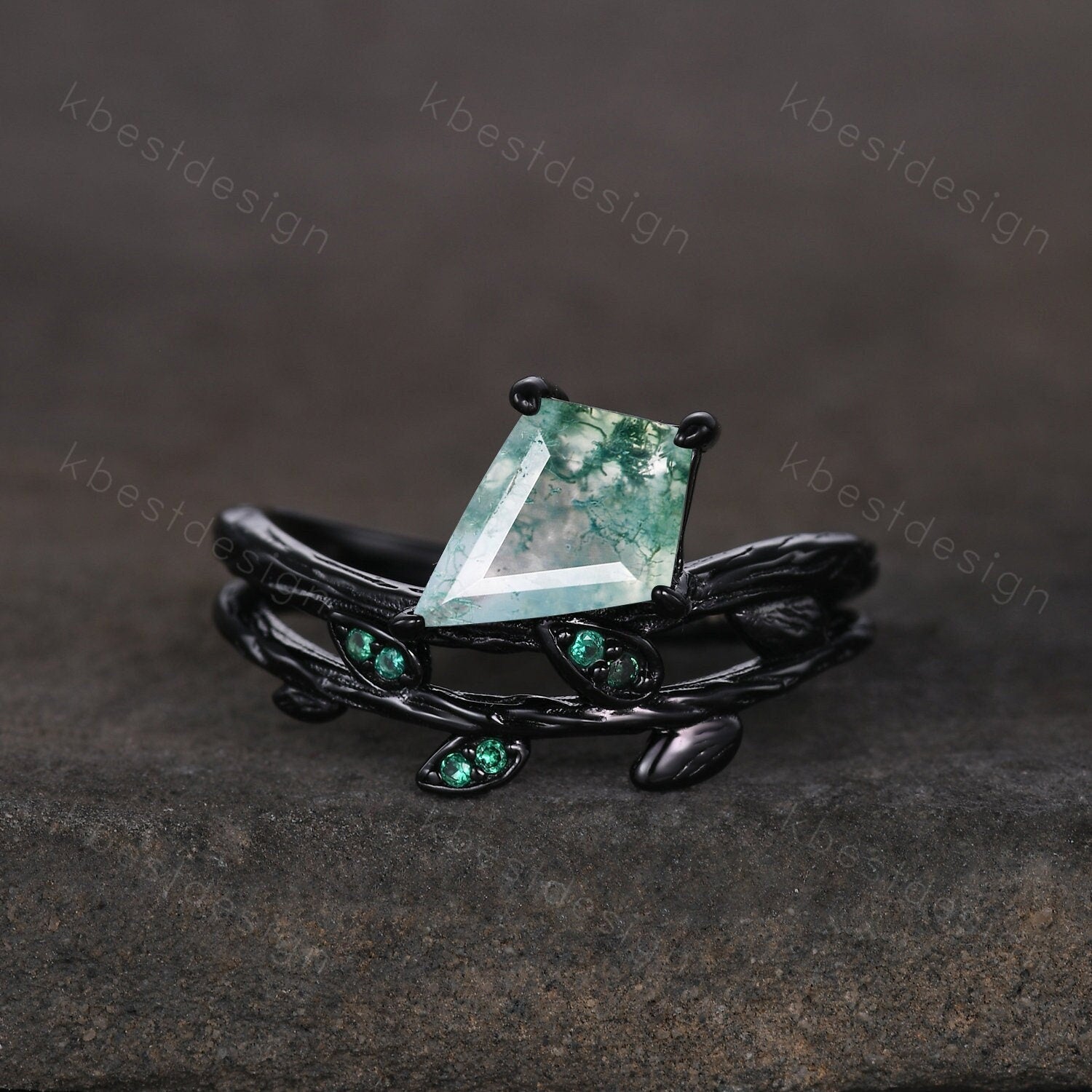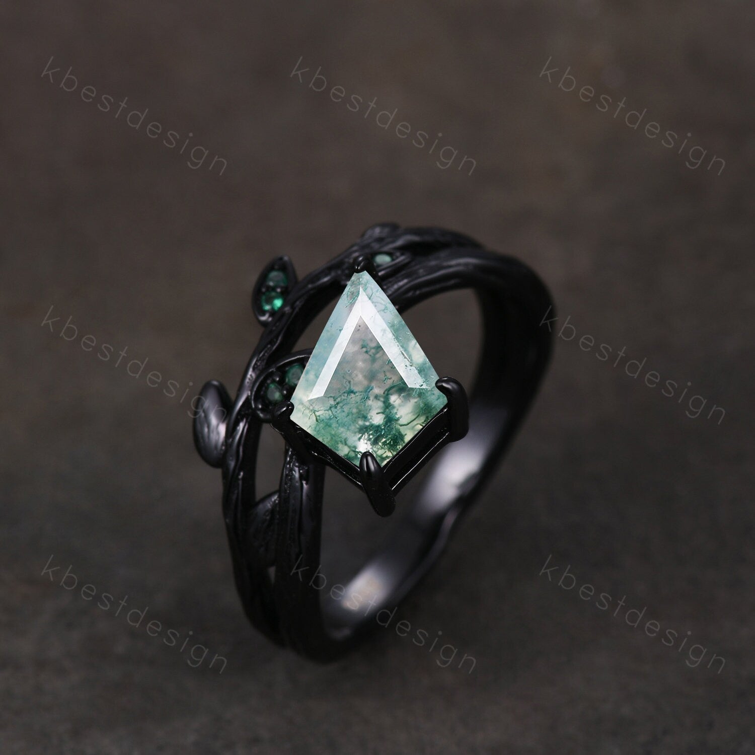 This is a Nature branch moss agate engagement ring black gold kite cut ring unique art deco emerald wedding ring twig leaf ring bridal promise ring