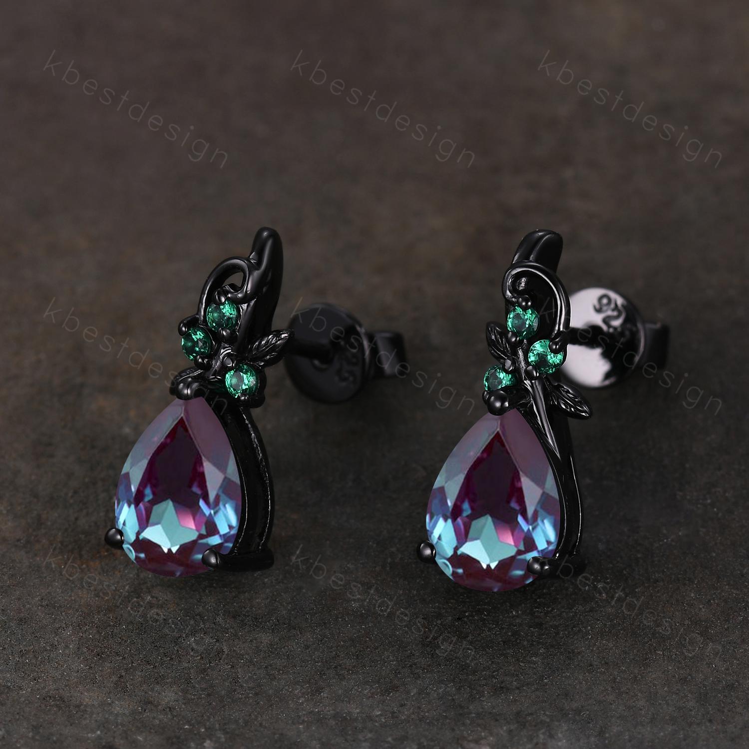 Nature inspired alexandrite earrings women black gold earring studs teardrop earrings art deco June birthstone studs anniversary gift