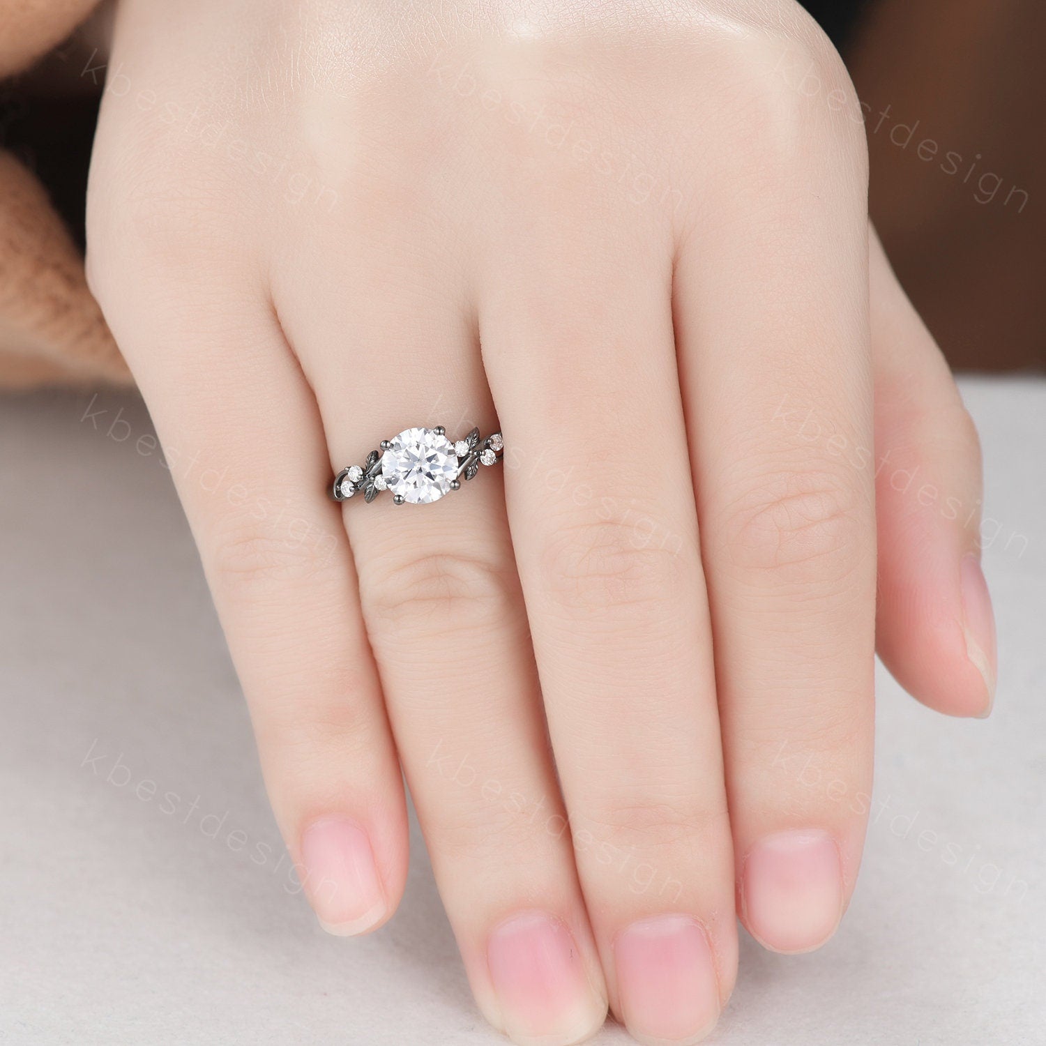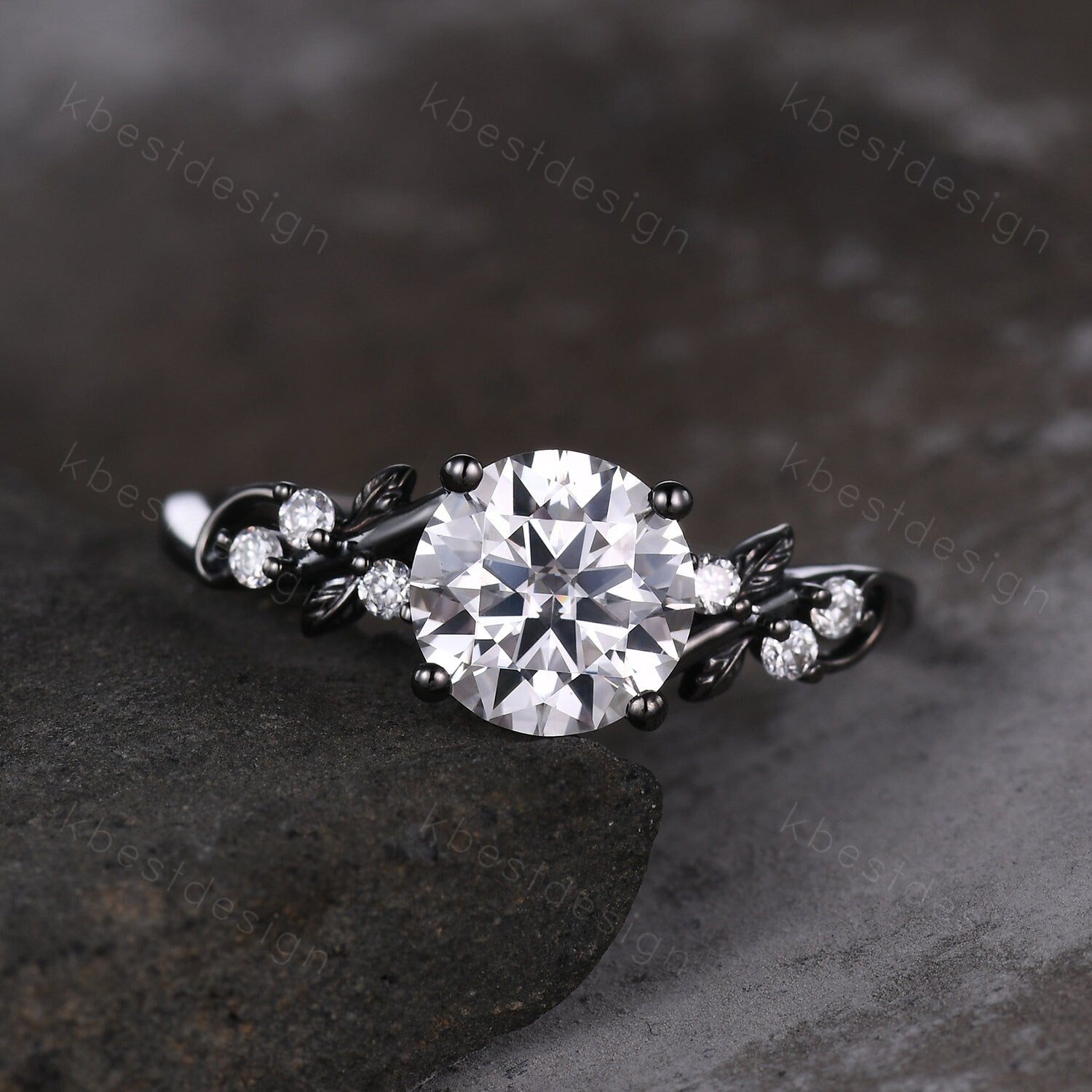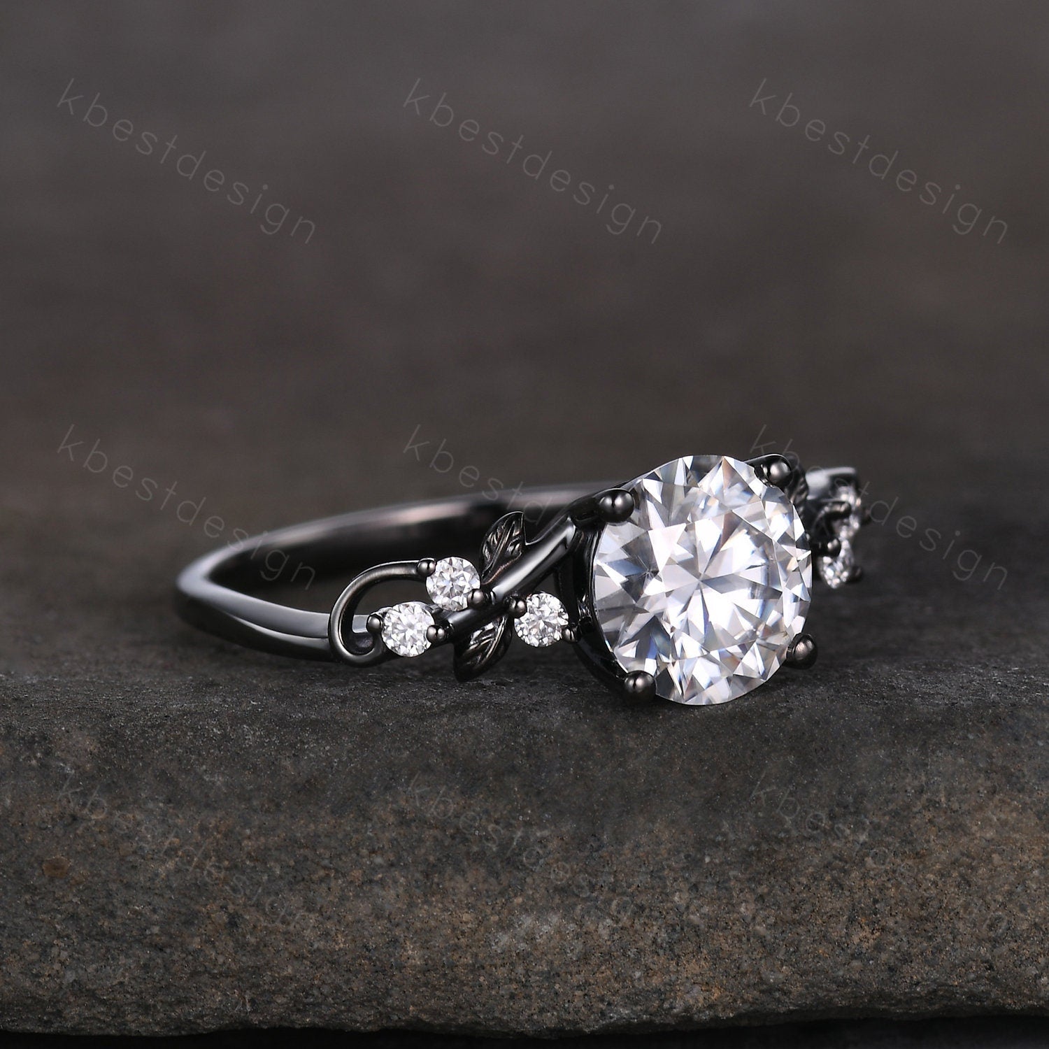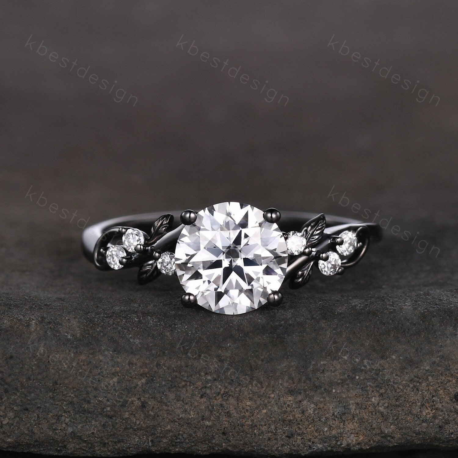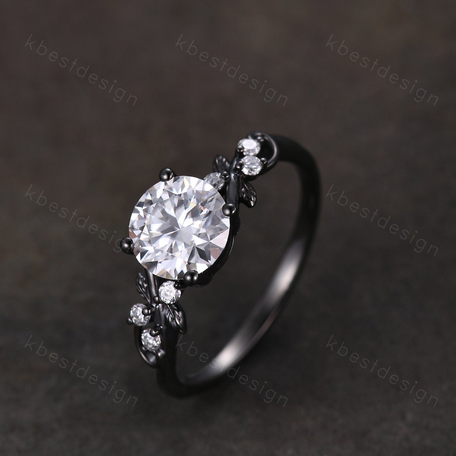 This is a Nature inspired moissanite engagement ring black gold ring for women twig leaf design wedding ring unique art deco bridal anniversary ring. Unique round cut ring, wedding ring, promise ring, anniversary gift.