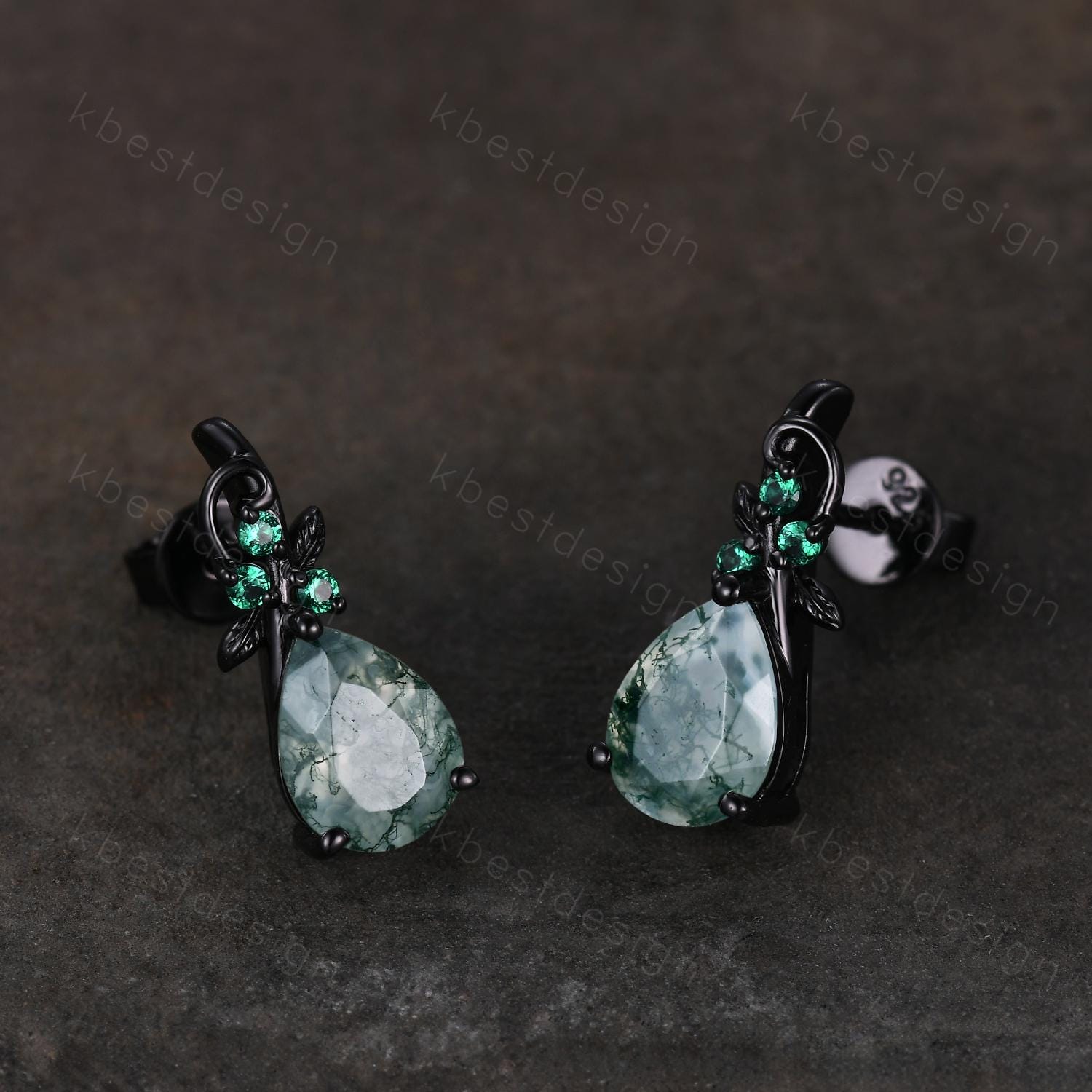 Nature inspired moss agate earrings women black gold earring studs teardrop earrings art deco green agate studs anniversary gift for her