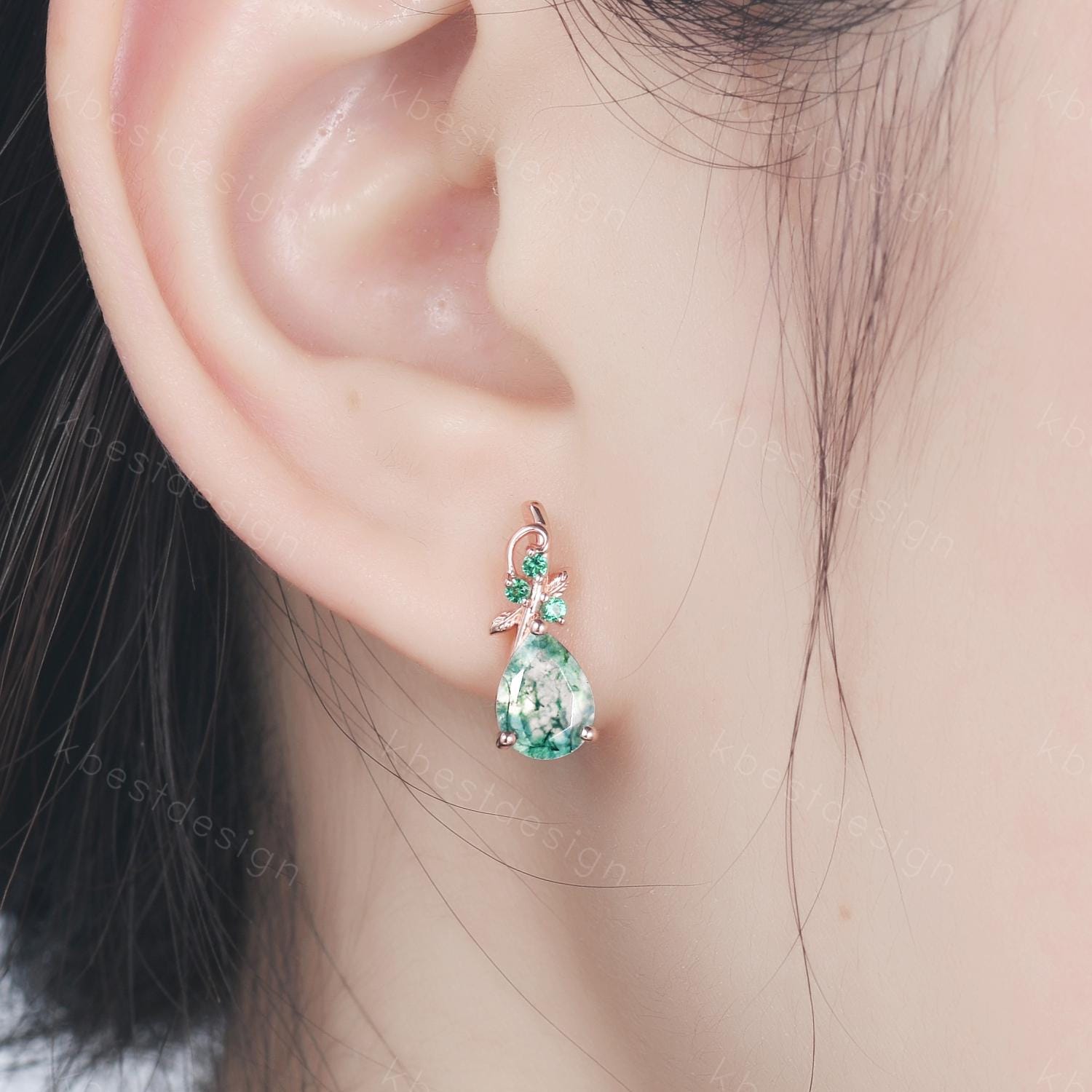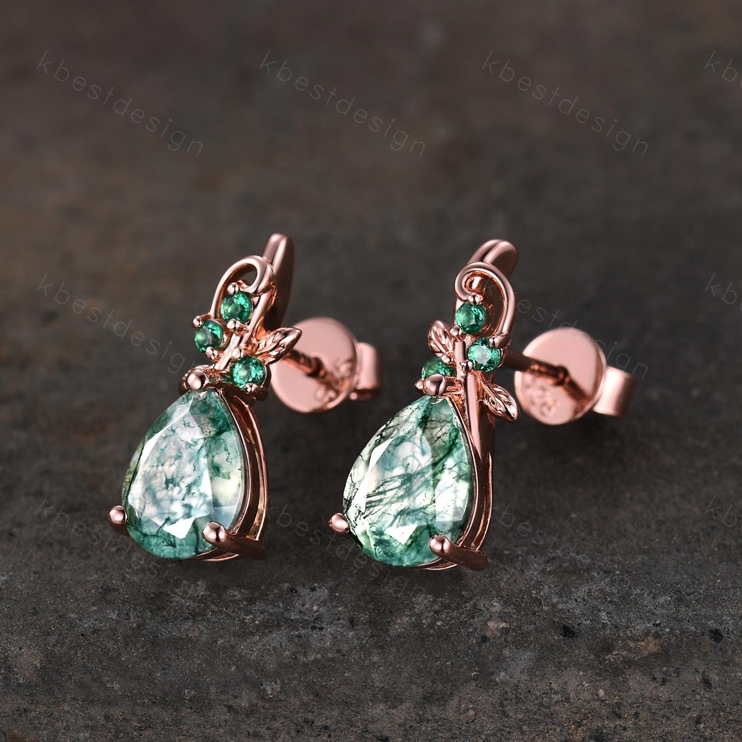 Nature inspired moss agate earrings women rose gold earring studs teardrop earrings art deco green agate studs anniversary gift for her