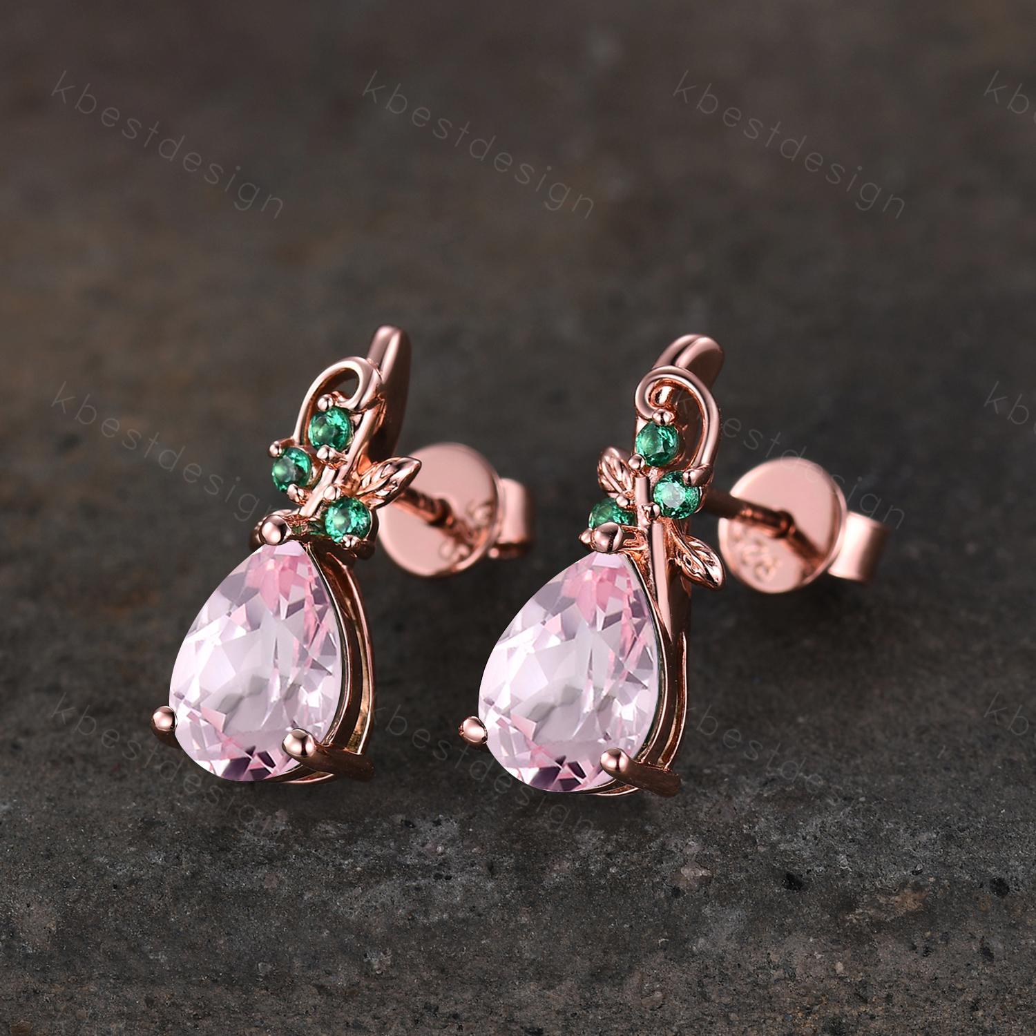 Nature inspired pink sapphire earrings women rose gold earring studs teardrop earrings art deco emerald studs anniversary gift for her
