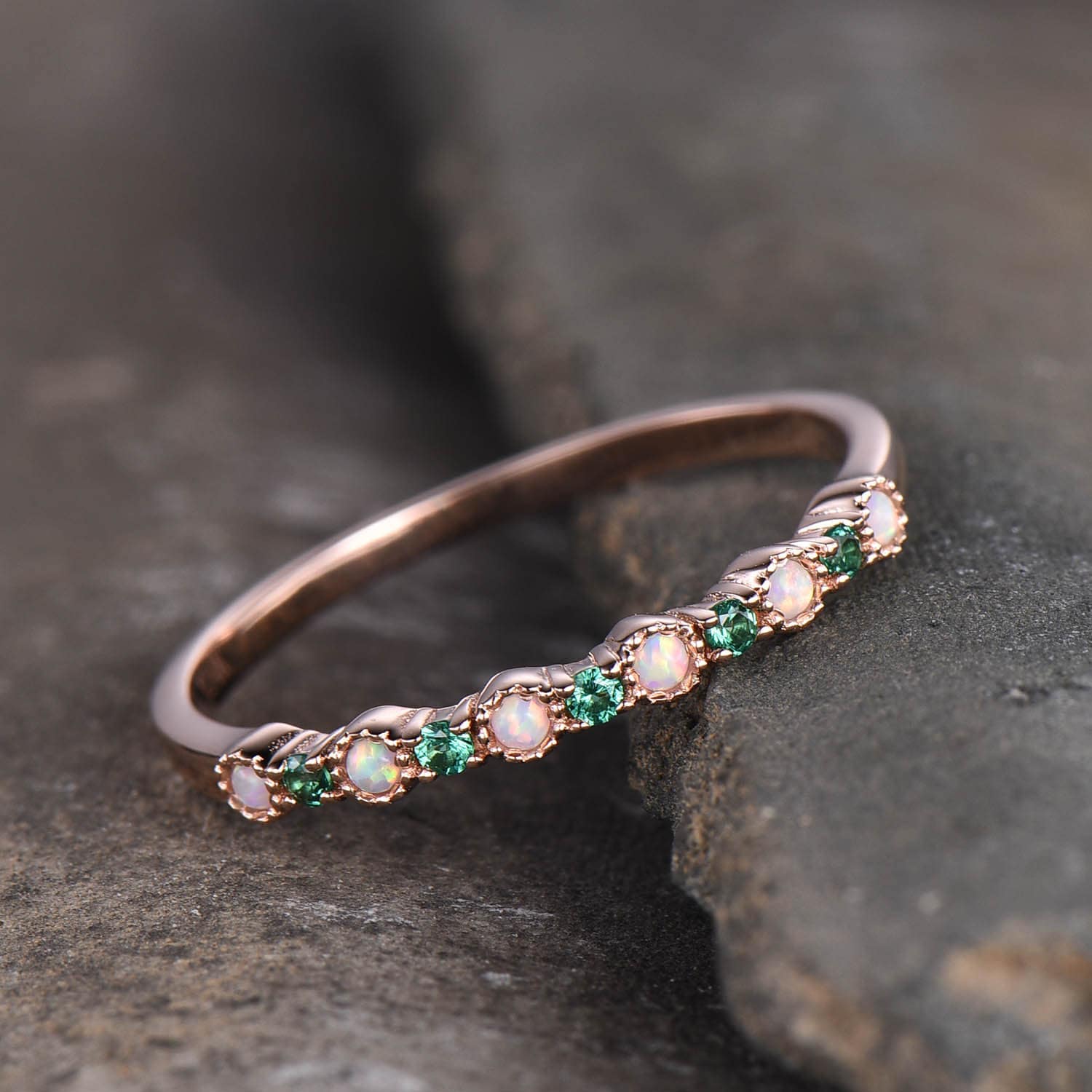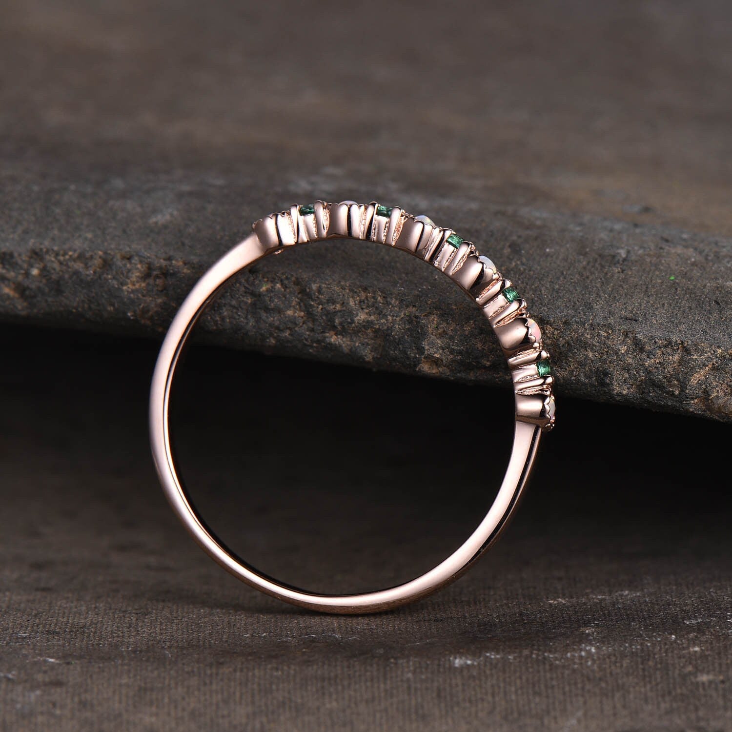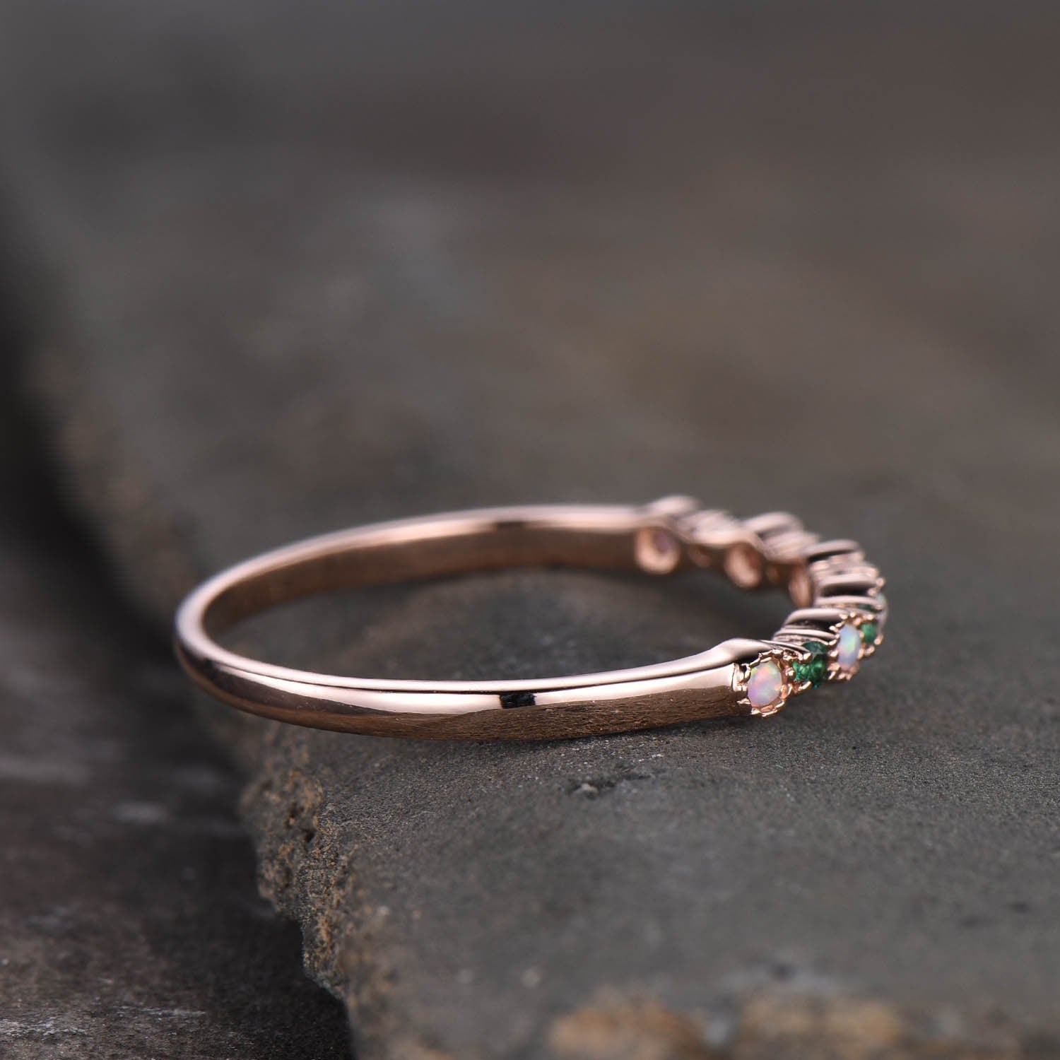 Opal Emerald Wedding Ring Opal Wedding Band Rose Gold Ring Dainty Stacking Ring Art deco Gemstone Band Anniversary Gift for Women