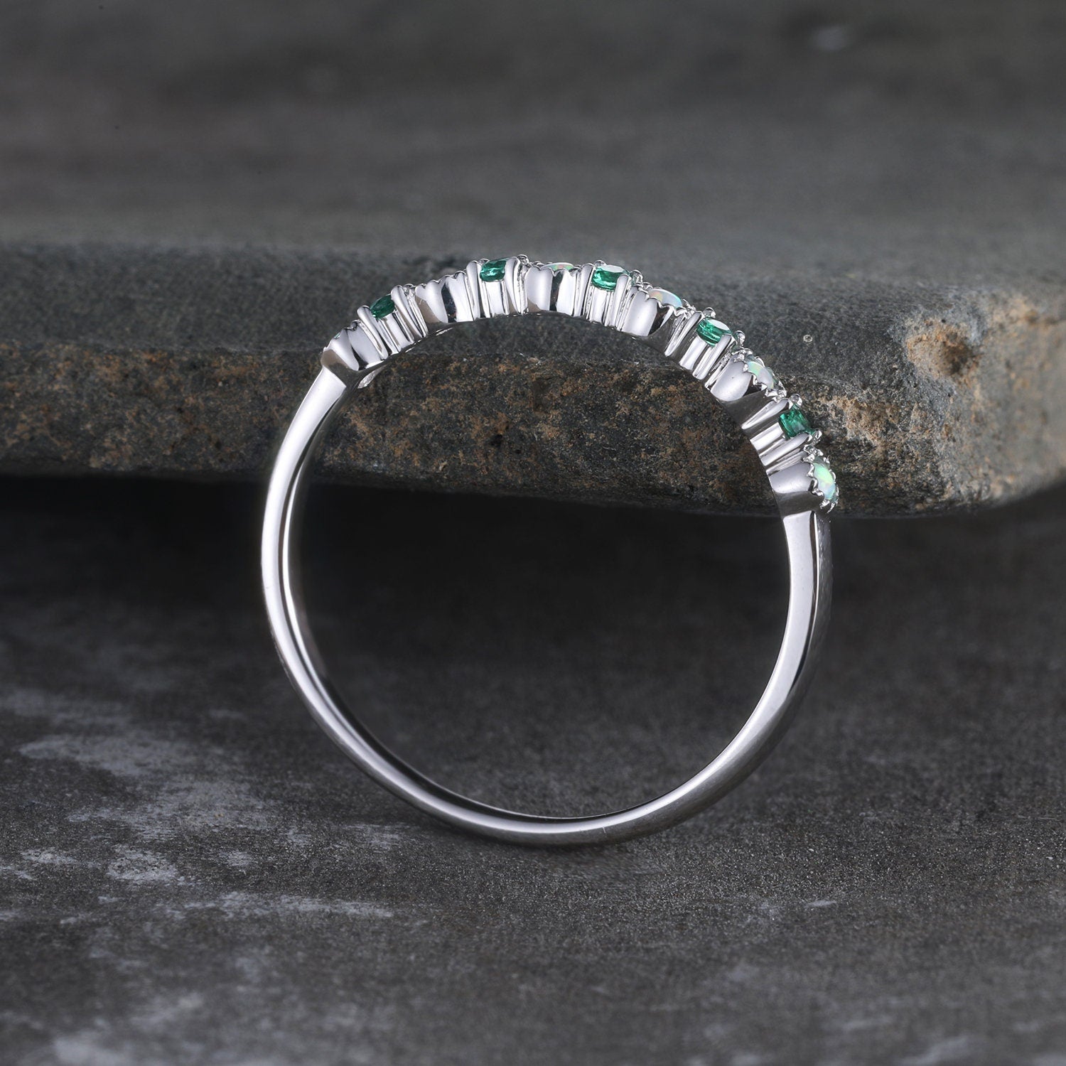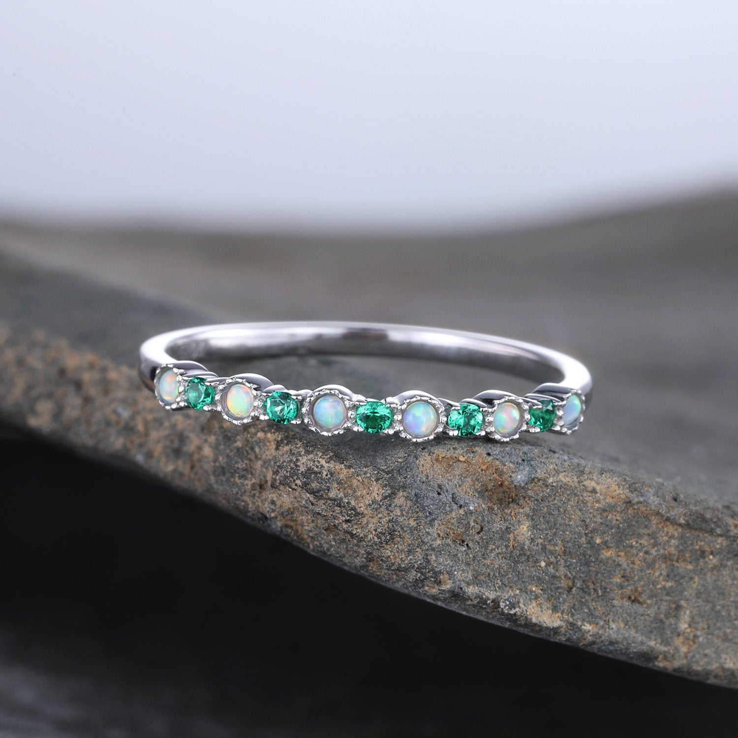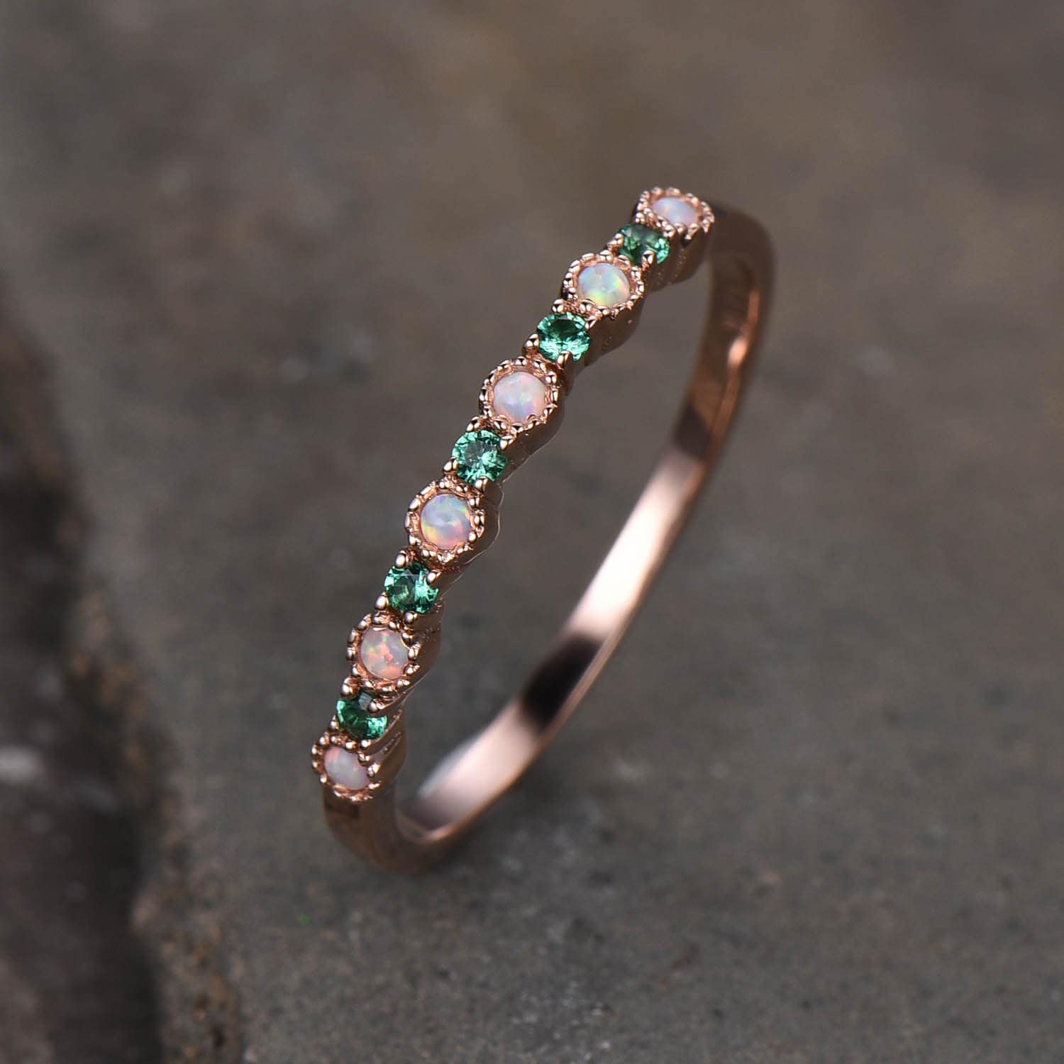 Opal Emerald Wedding Ring Opal Wedding Band Rose Gold Ring Dainty Stacking Ring Art deco Gemstone Band Anniversary Gift for Women