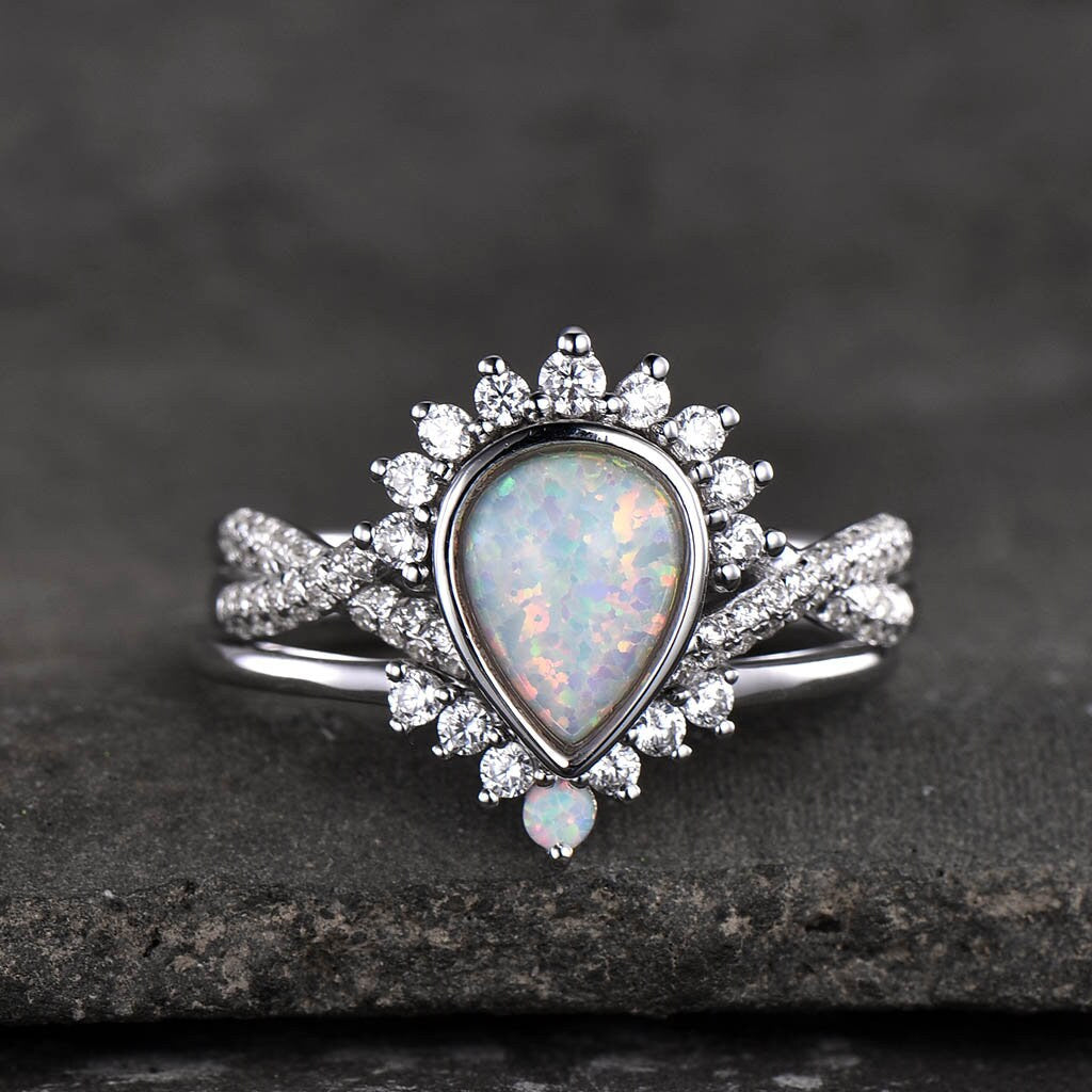 Opal Engagement Ring Set, Pear Shaped White Fire Opal Ring, Opal Wedding Ring Set, Statement Ring, Stacking Ring, Bridal Set, White Gold
