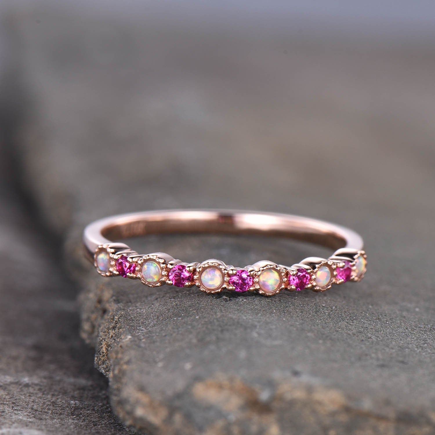 Opal Ruby Wedding Ring Rose Gold Dainty Opal Ring July Birthstone Half Eternity Stacking Ring Everyday Ring Sterling Silver Gift For Her