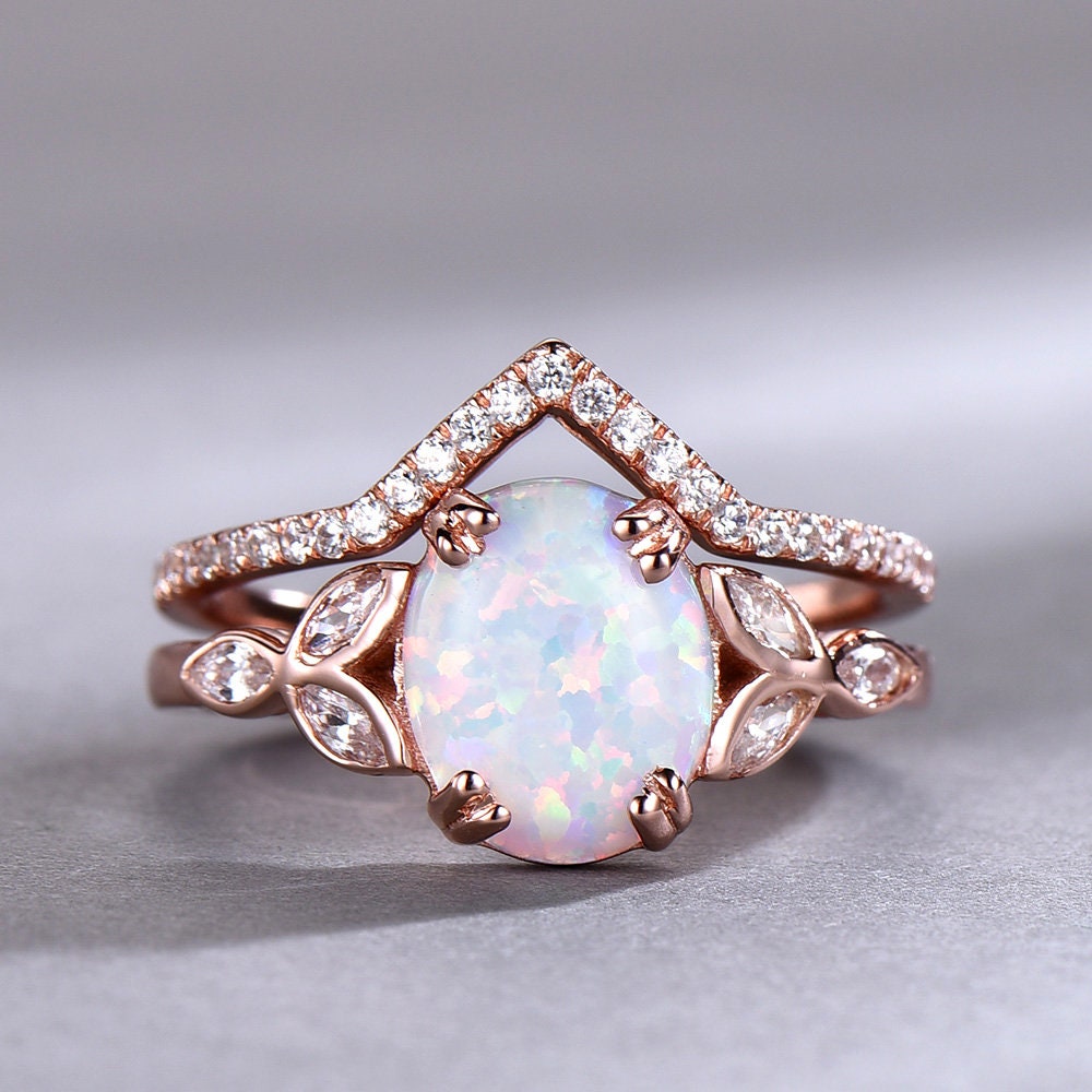 Opal Wedding Ring Set Opal Ring White Fire Opal Floral Engagment Ring Rose Gold Plated Unique Curve Wedding Band Silver Bridal Ring Set
