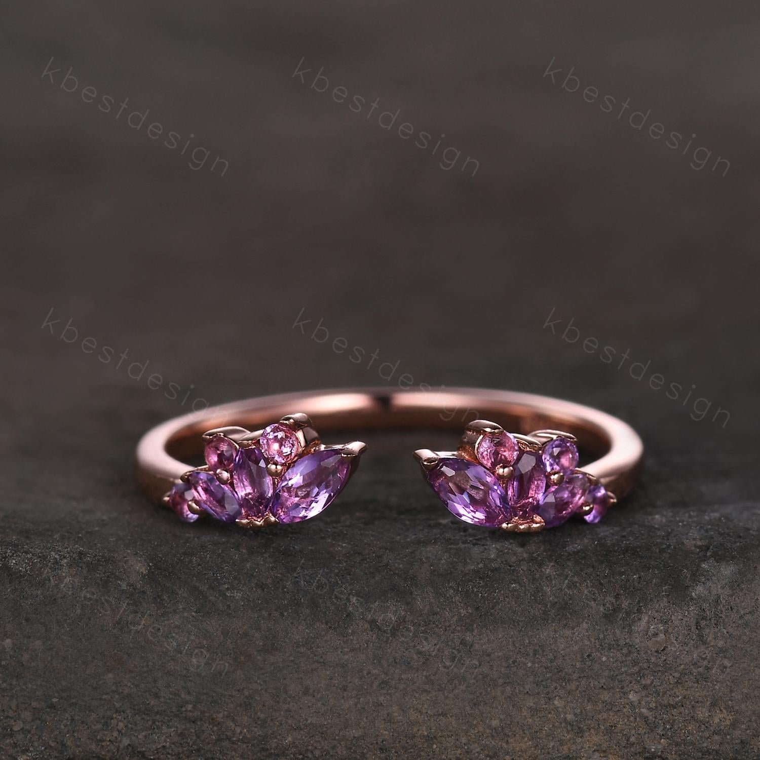 This is a unique open gap Amethyst wedding ring in rose gold. Open gap Amethyst Wedding Band sterling silver vintage petal wedding ring Delicate Stacking matching curved wedding band bridal ring gift