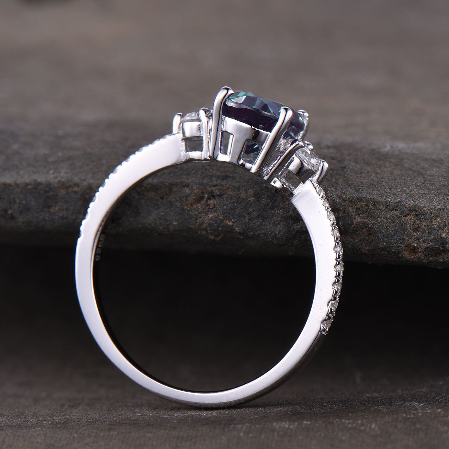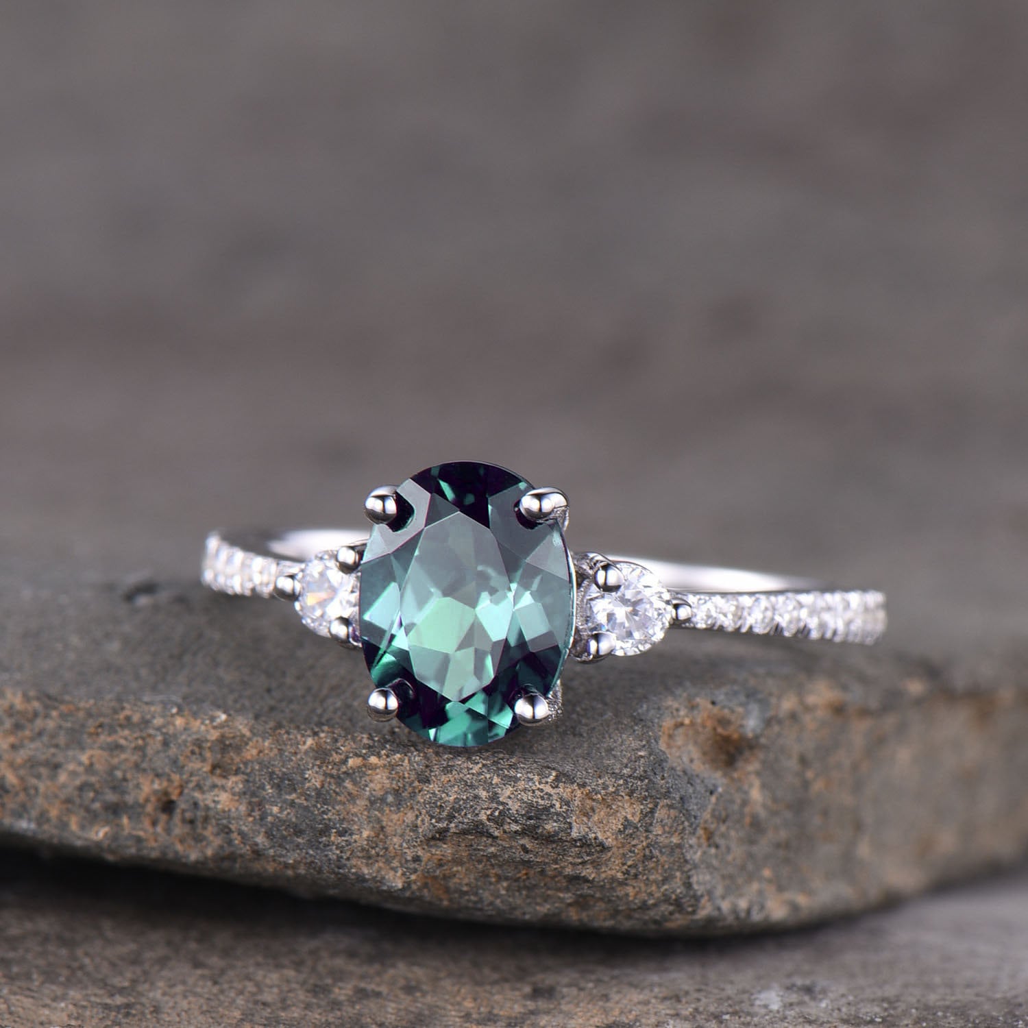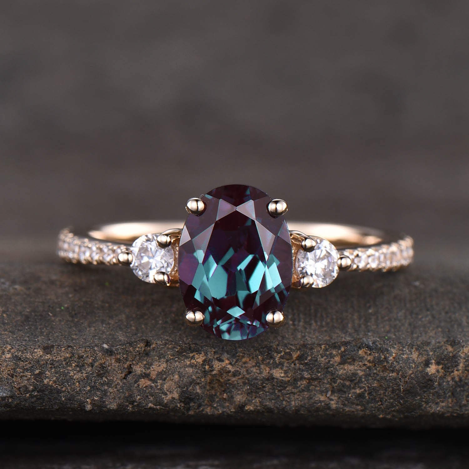 Oval Alexandrite Ring, Alexandrite Man Made Diamond Three Stone Engagement Ring, 14K Gold Ring, Alexandrite Engagement Ring, Silver Rings