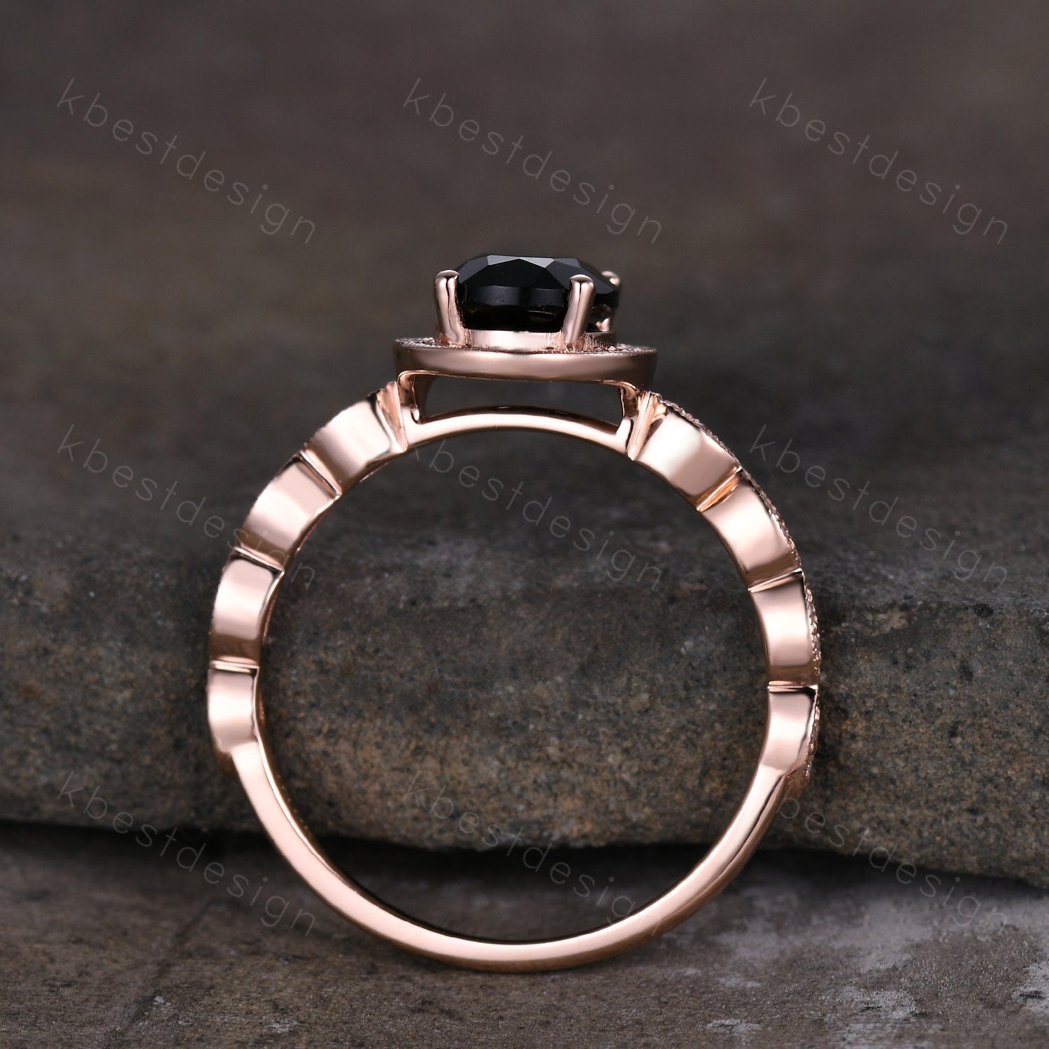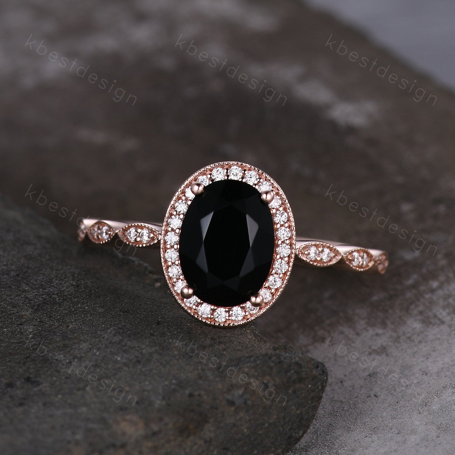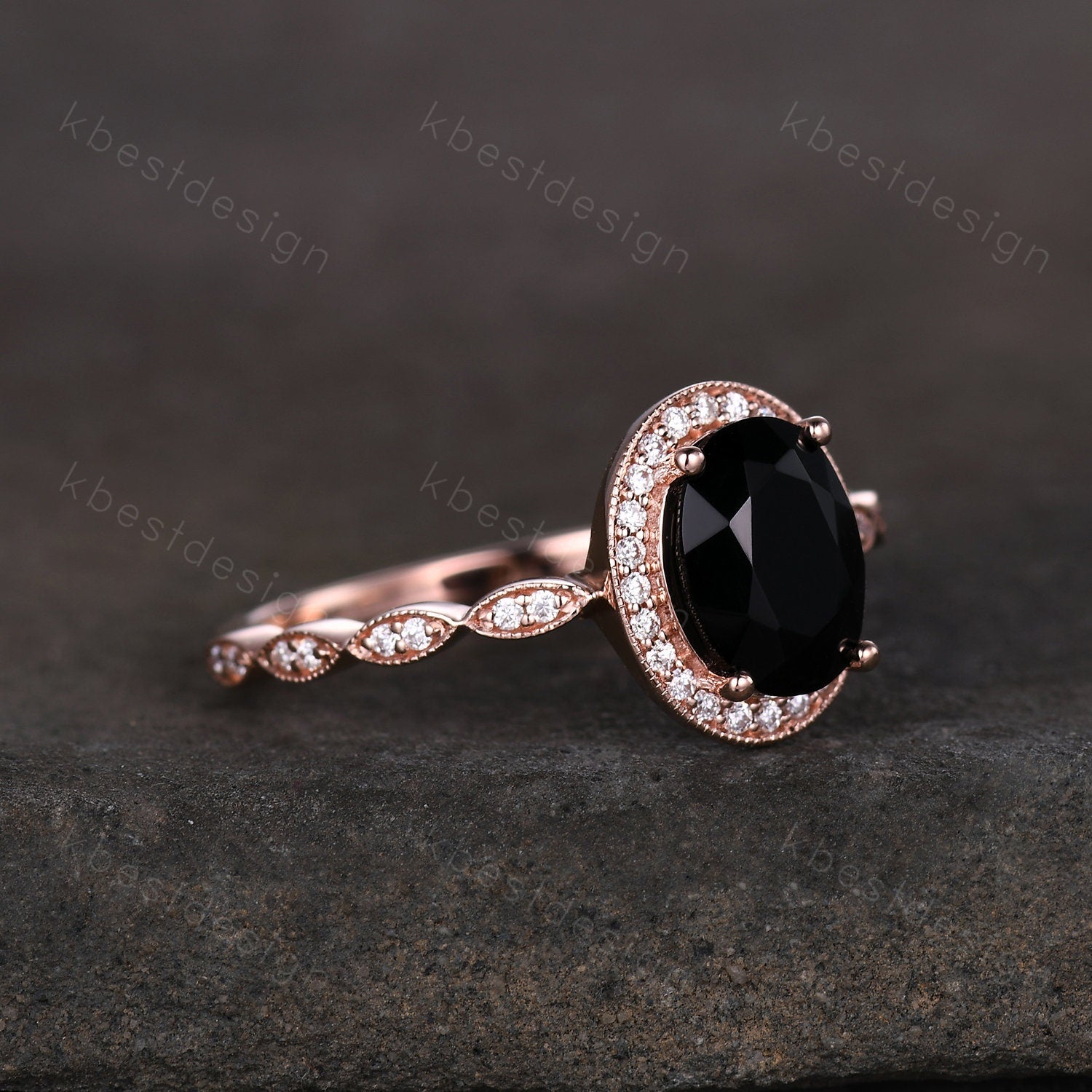 Oval cut black onyx engagement ring rose gold ring unique art deco halo engagement ring half eternity moissanite wedding ring promise ring