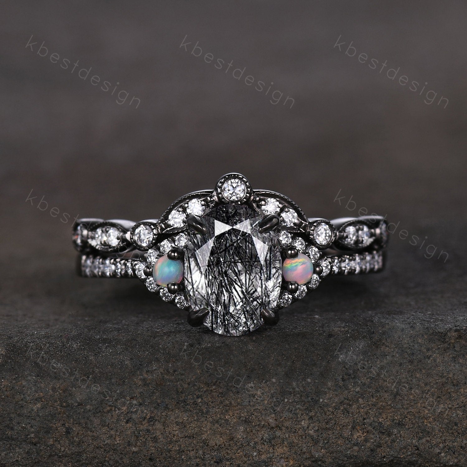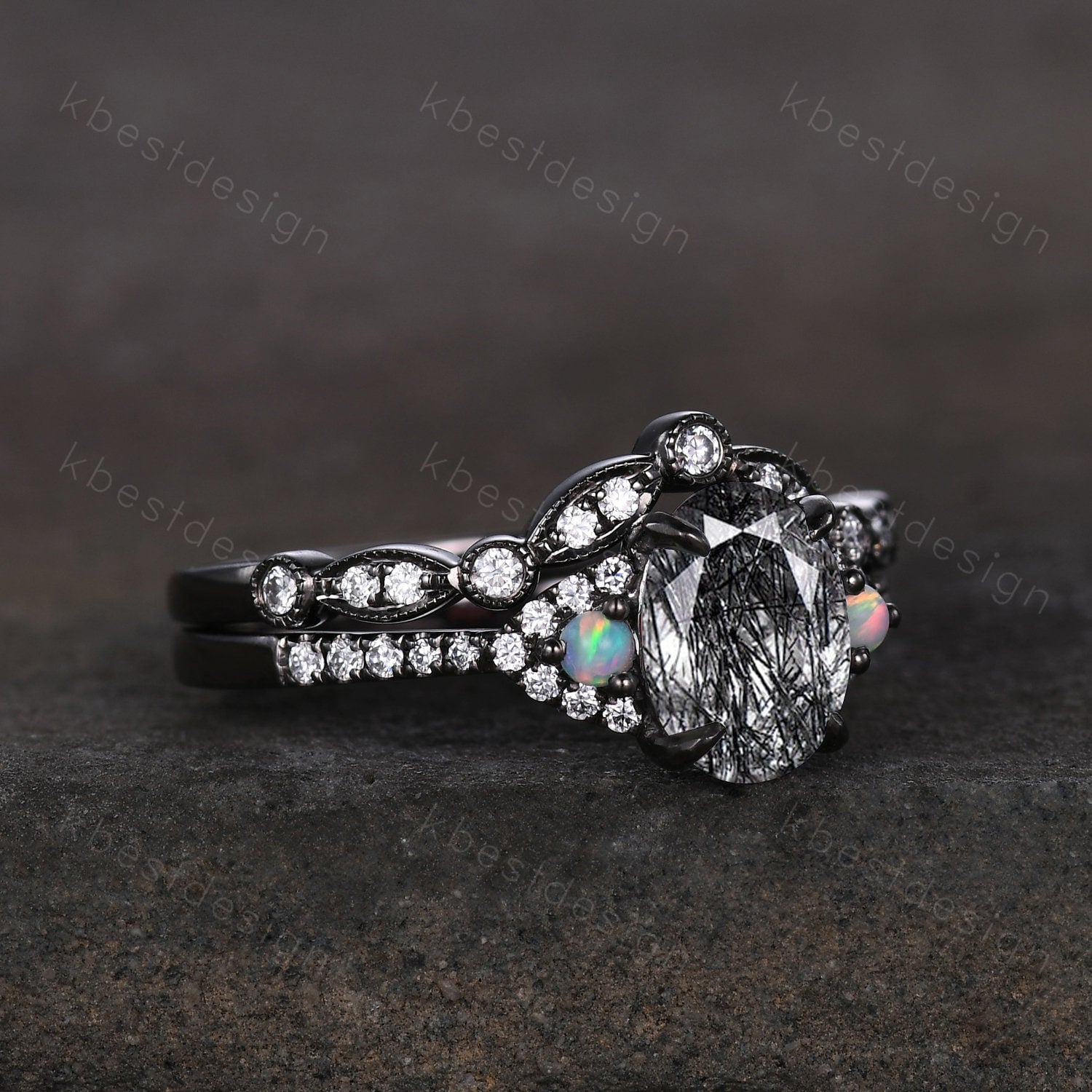 Oval cut Black Rutilated Quartz Engagement Ring Set Vintage Rhodium Black Gold Ring Art Deco Curved Stacking Band Unique Moissanite Ring Set