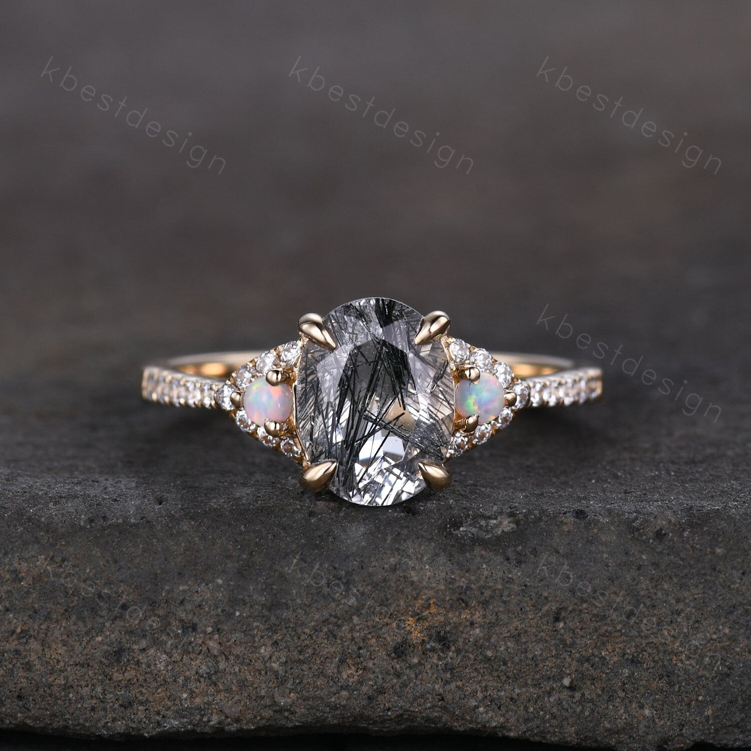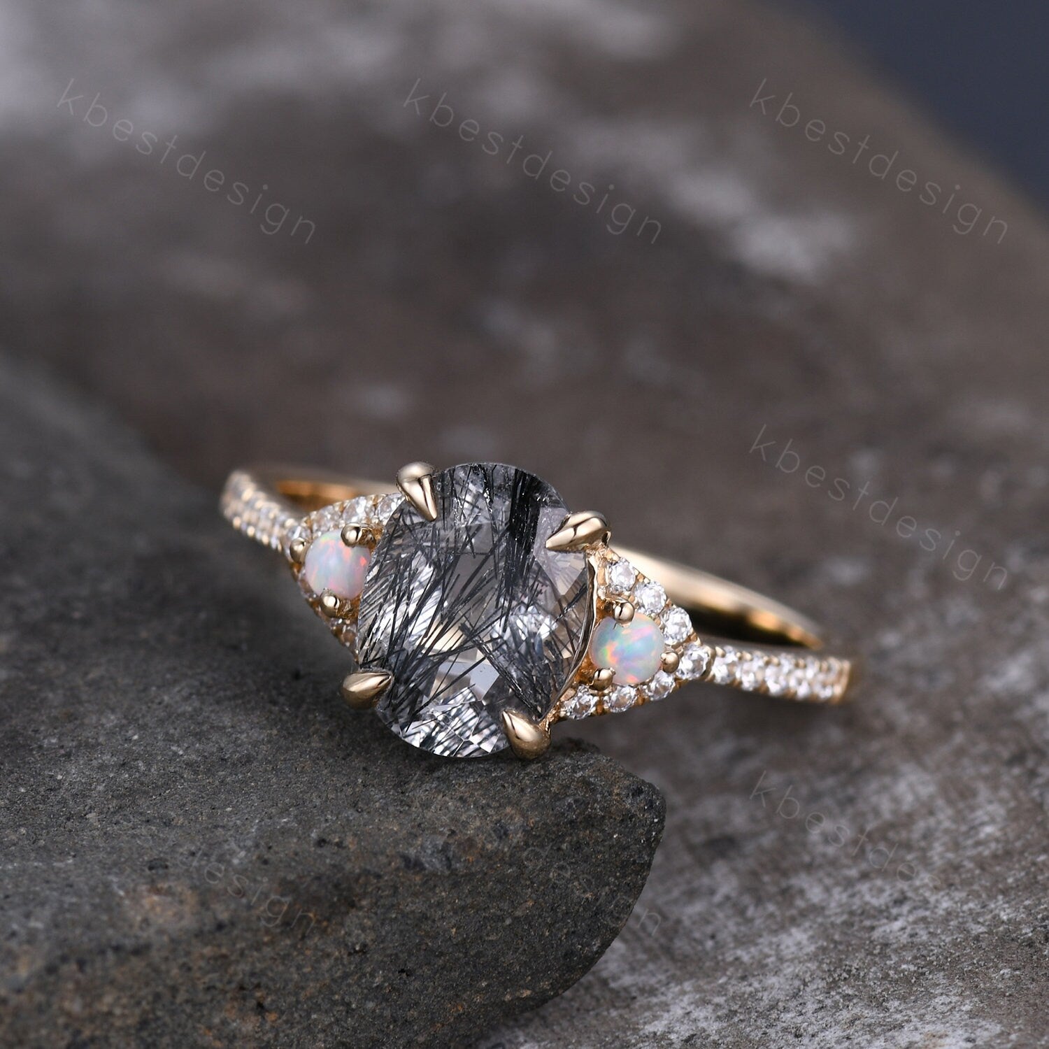 Oval cut black rutilated quartz engagement ring solid 14k yellow gold opal ring unique art deco moissanite bridal wedding ring Promise ring