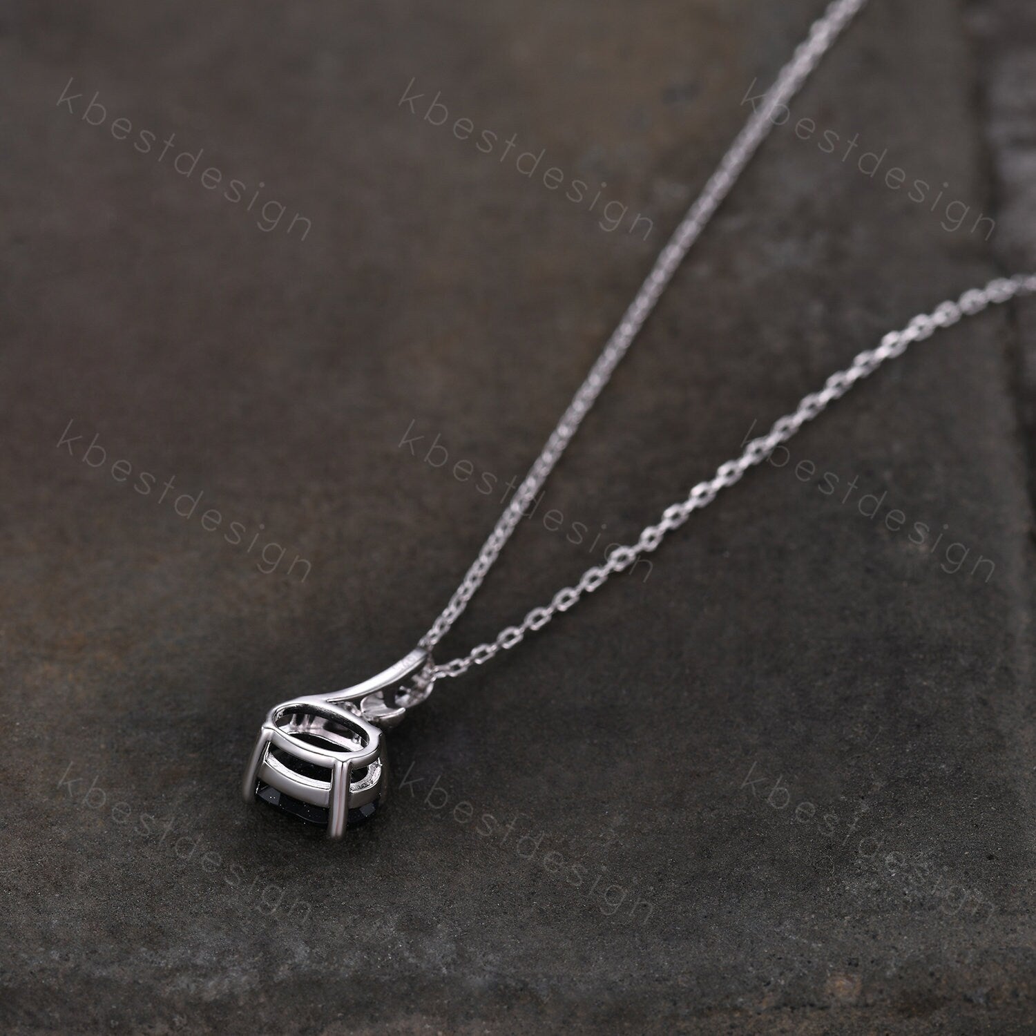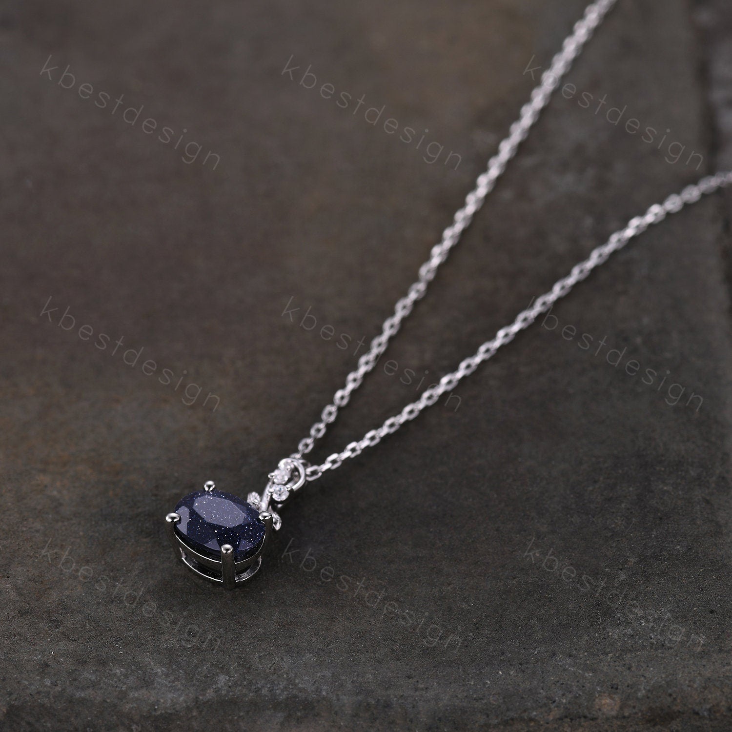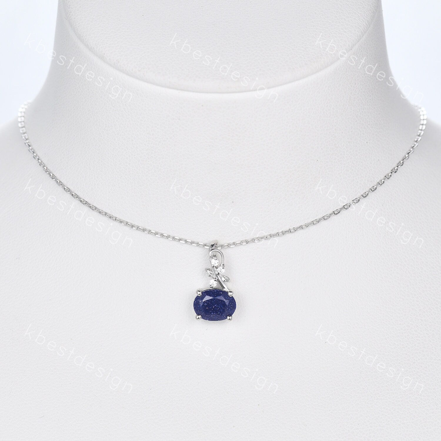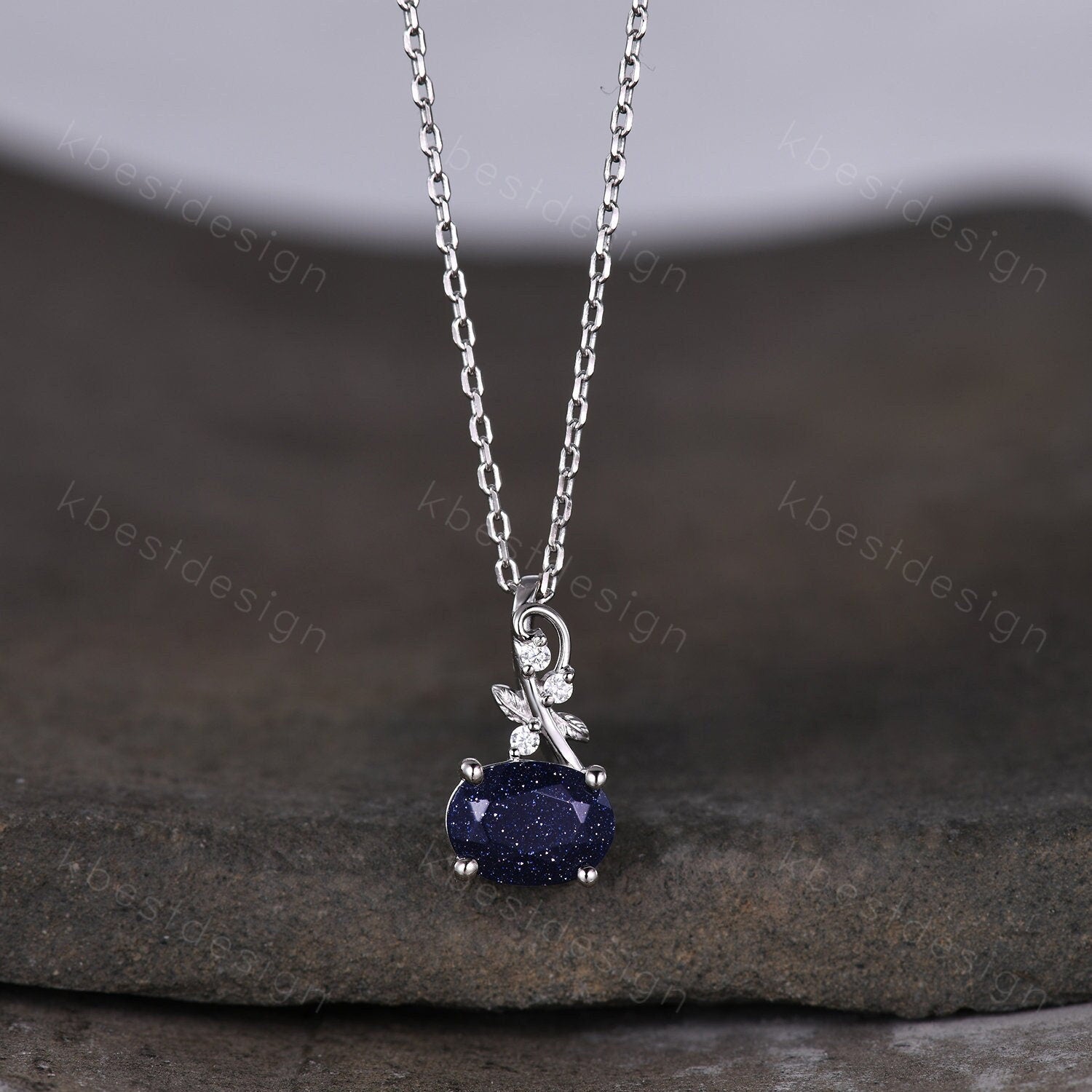 Oval Cut Galaxy Blue Sandstone Necklace Silver Vintage Art Deco Necklace for Women Nature Inspired Moissanite Pendant Anniversary Gift