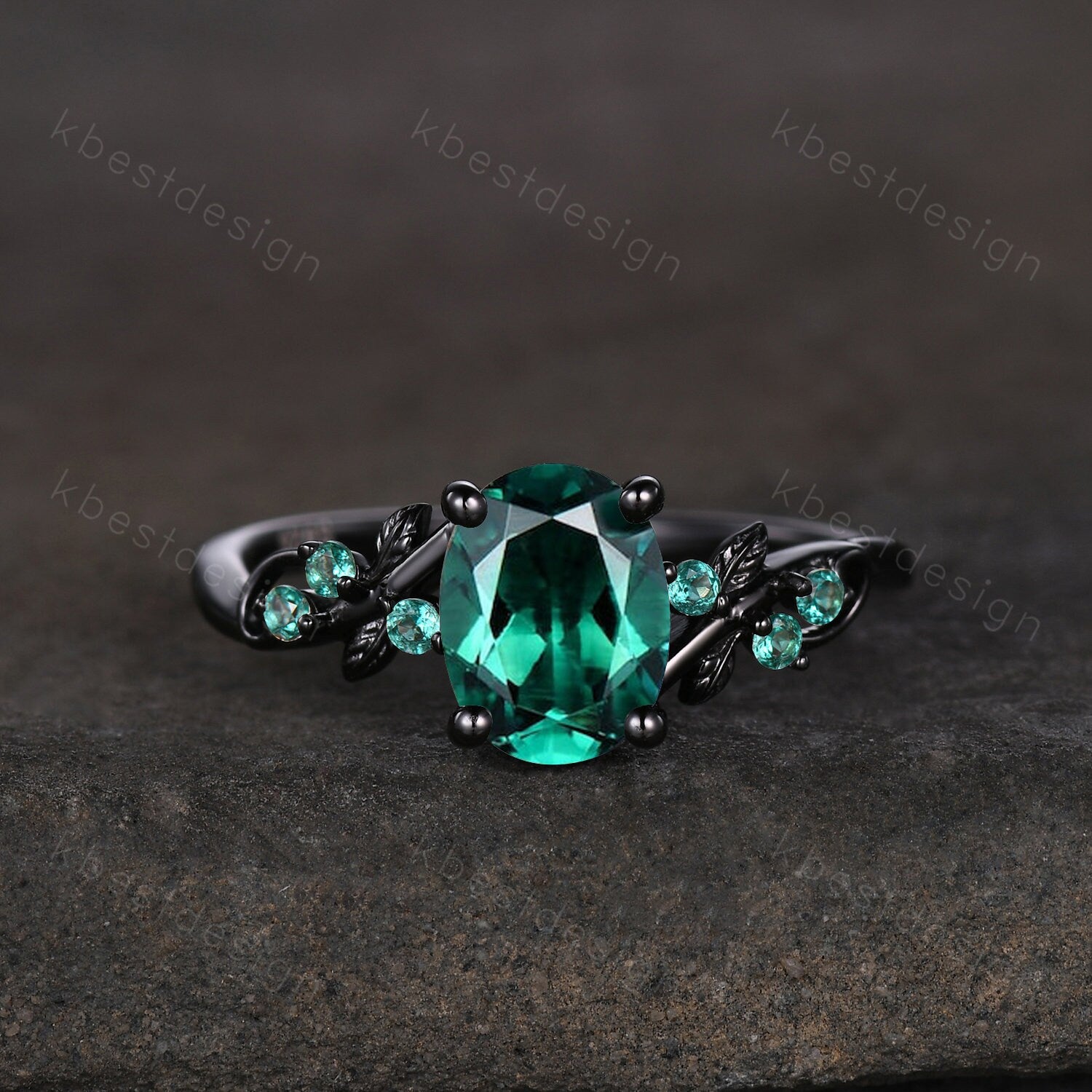 Oval cut green emerald engagement ring set black gold twig leaf emerald ring nature inspired wedding ring art deco bridal promise ring set