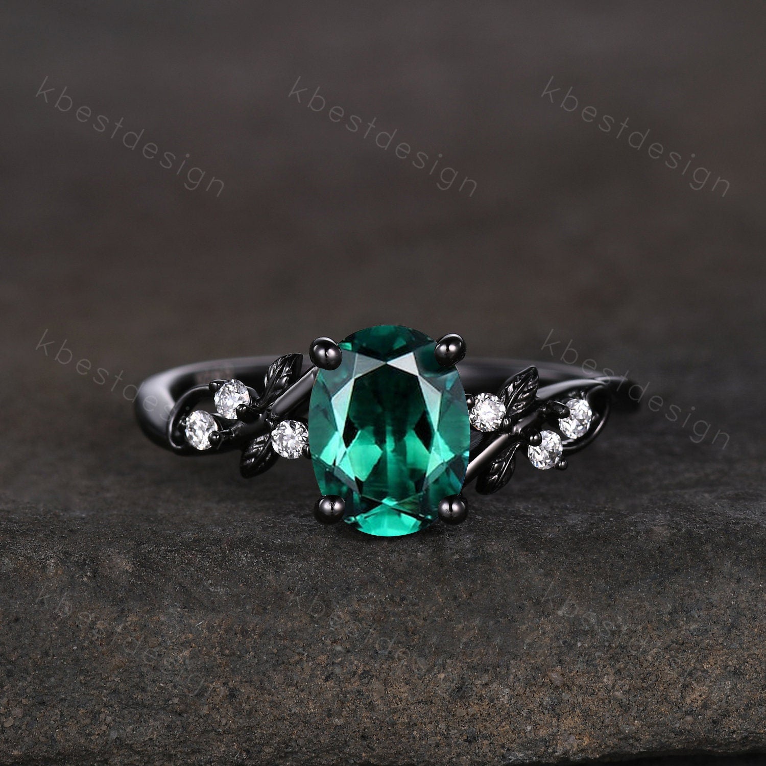 Oval cut green emerald engagement ring set black gold twig leaf engagement ring nature inspired wedding ring art deco moissanite ring set