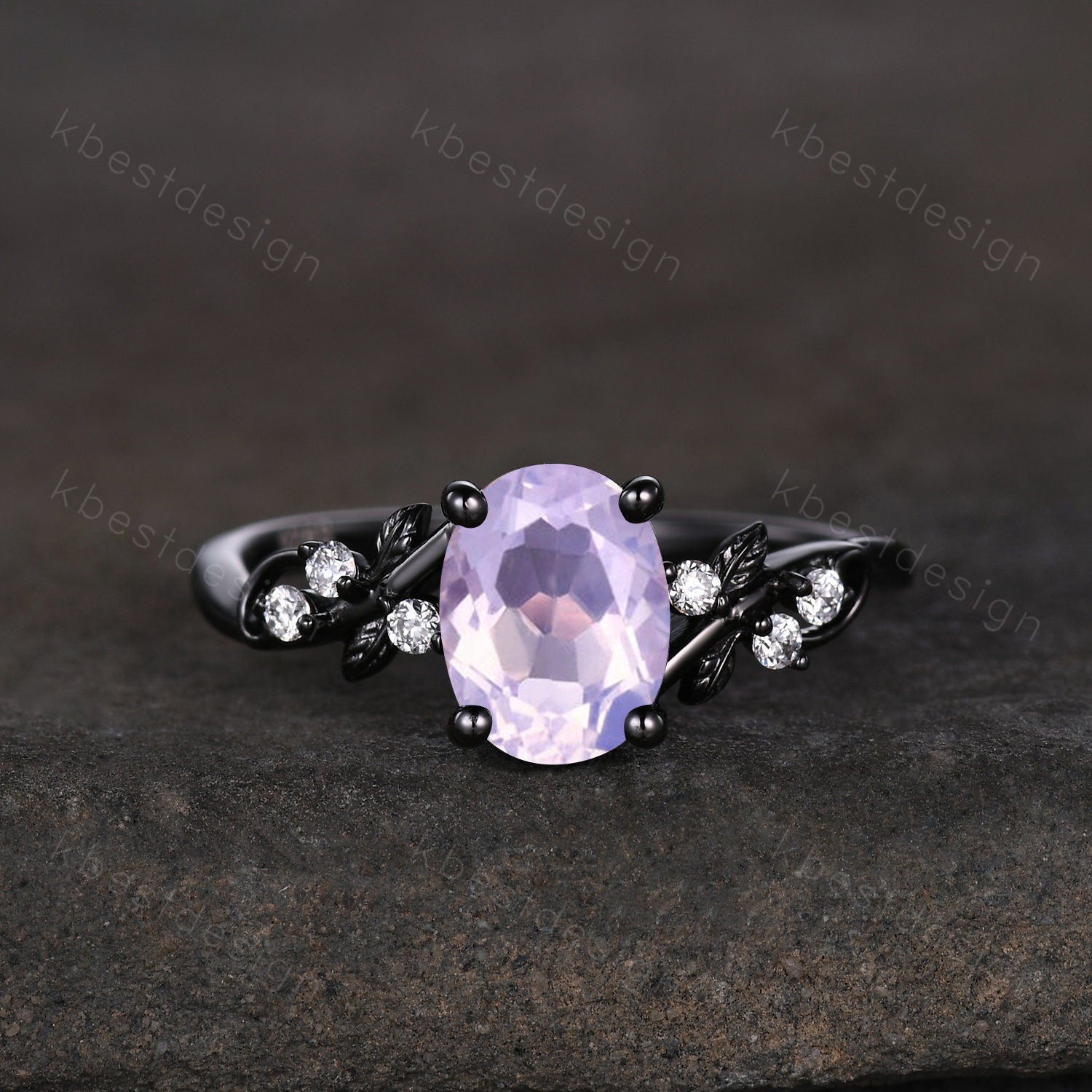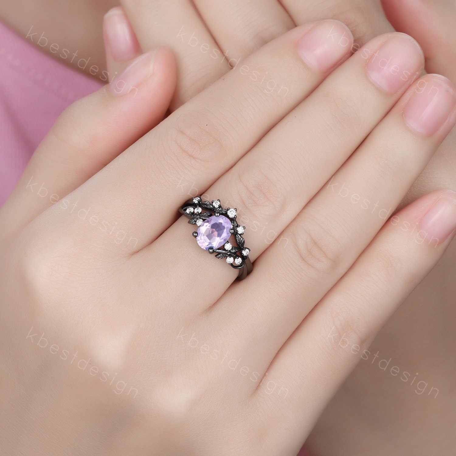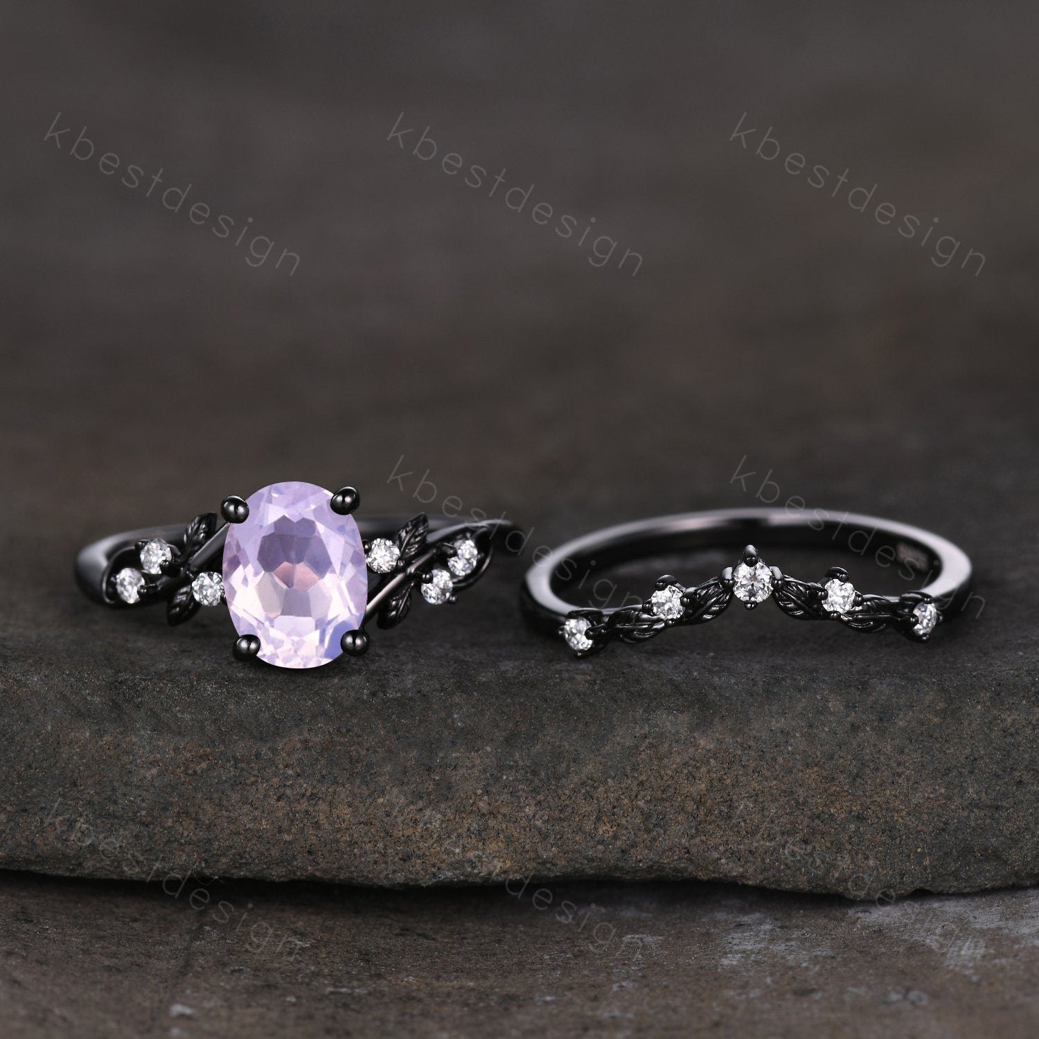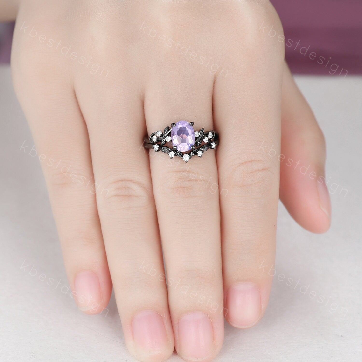 Oval cut Lavender Amethyst Engagement Ring Set Black Gold Rings Unique Art Deco Amethyst Ring For Women Twig Leaf Moissantie Wedding Ring