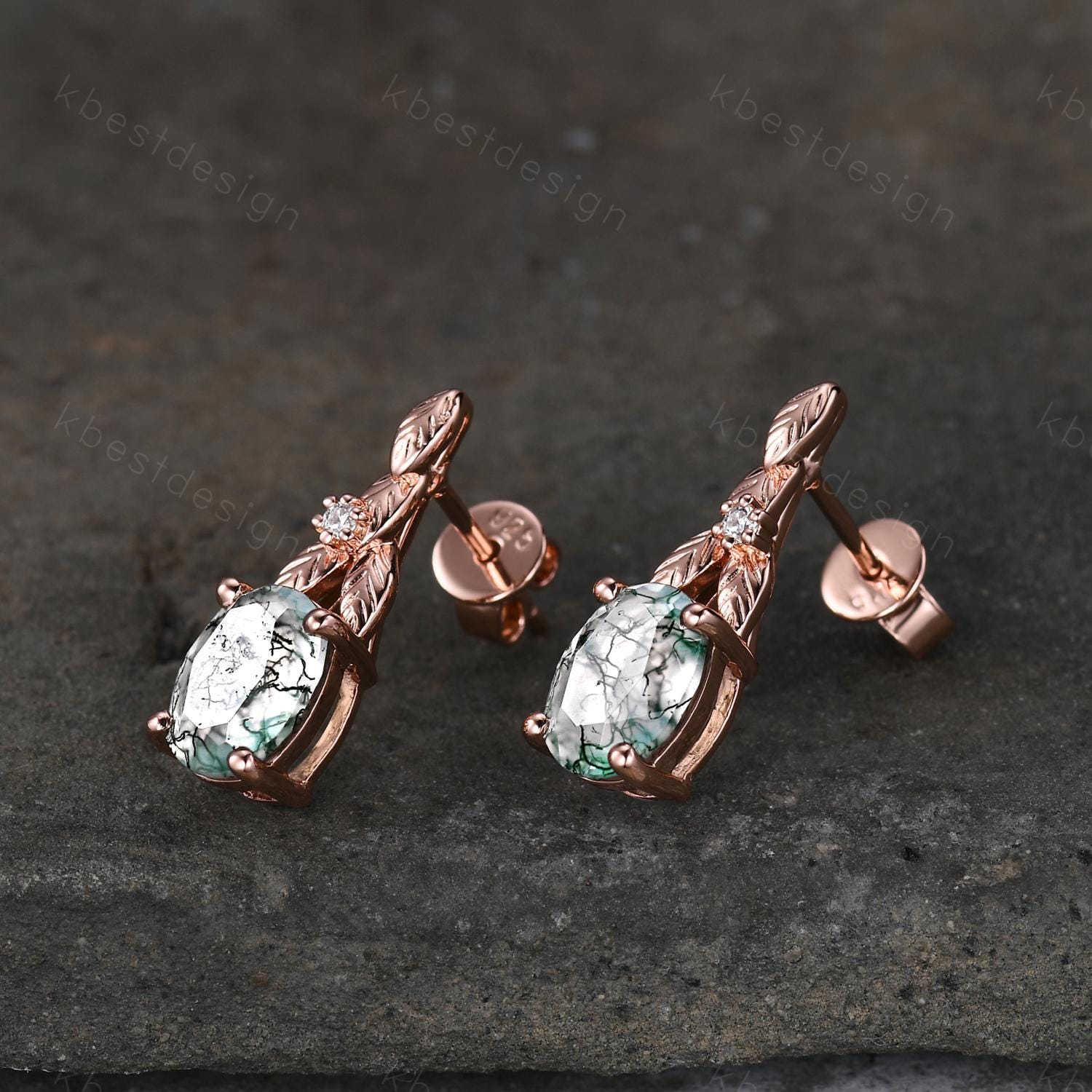 Oval cut moss agate earrings women rose gold earring studs branch leaf earrings nature inspired green agate studs anniversary gift for her. Each pair of earrings is lovingly made with hand selected moss agate to add a little extra shine and magic to your look overall.