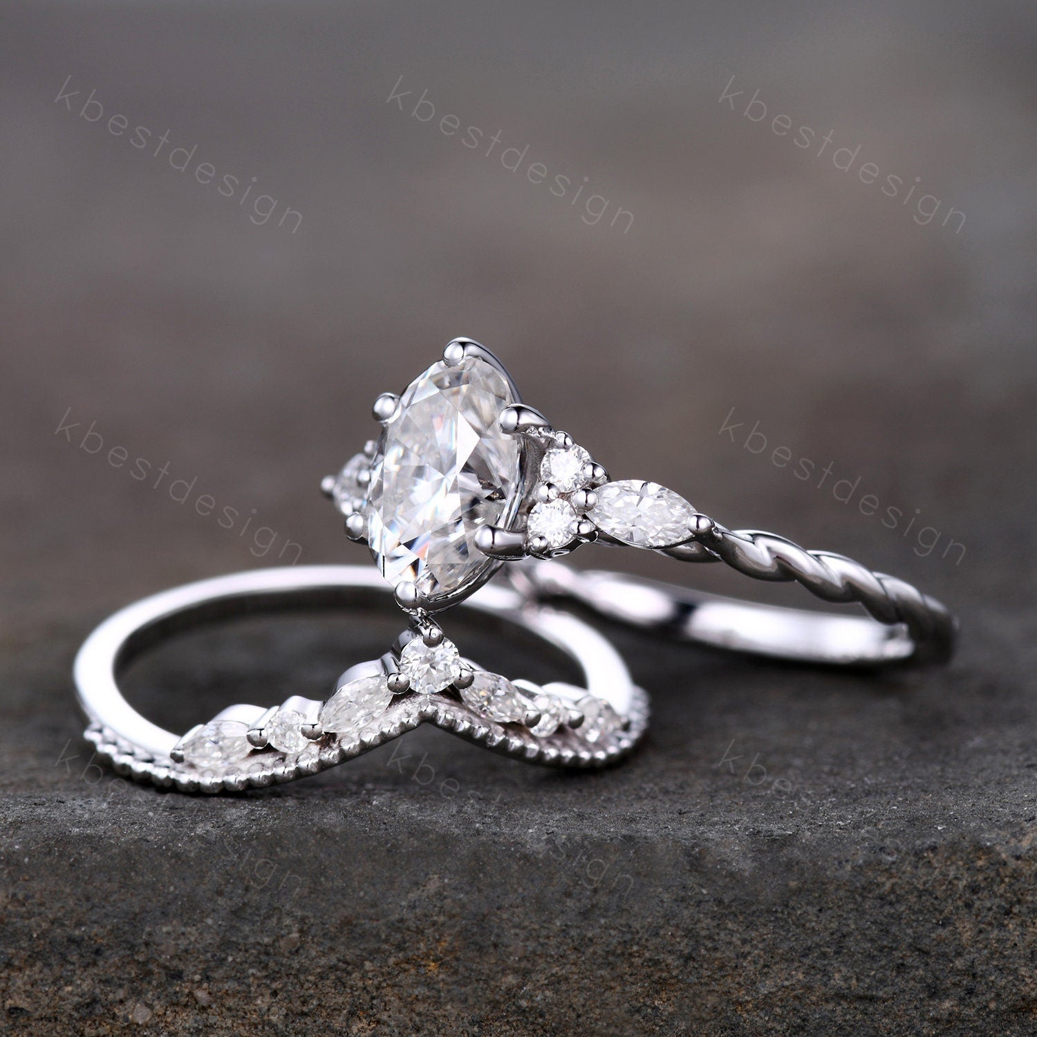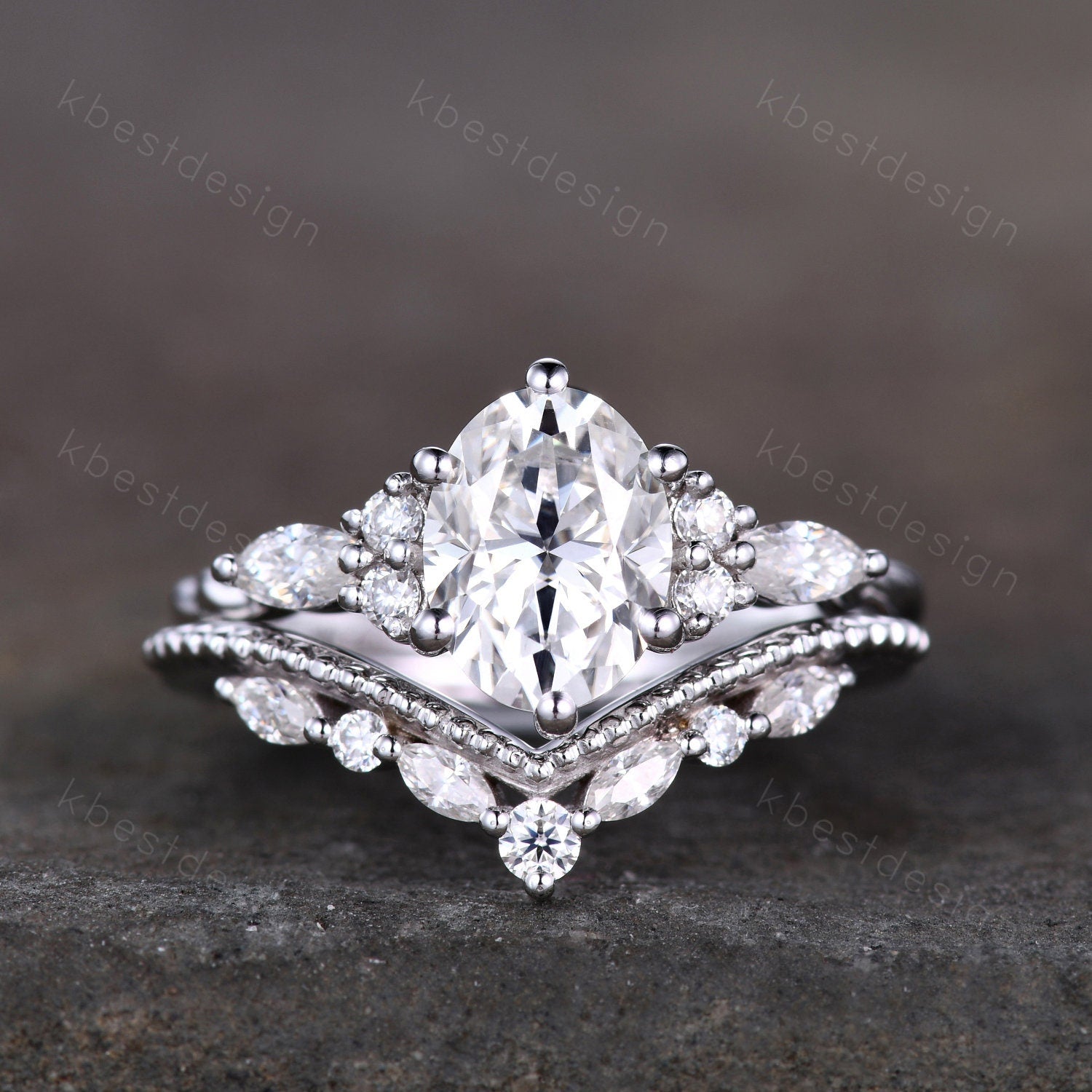Oval Moissanite engagement ring vintage unique Cluster white gold engagement ring women Marquise stacking matching band Bridal Promise Ring
